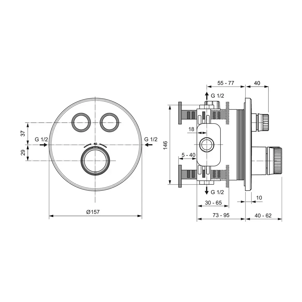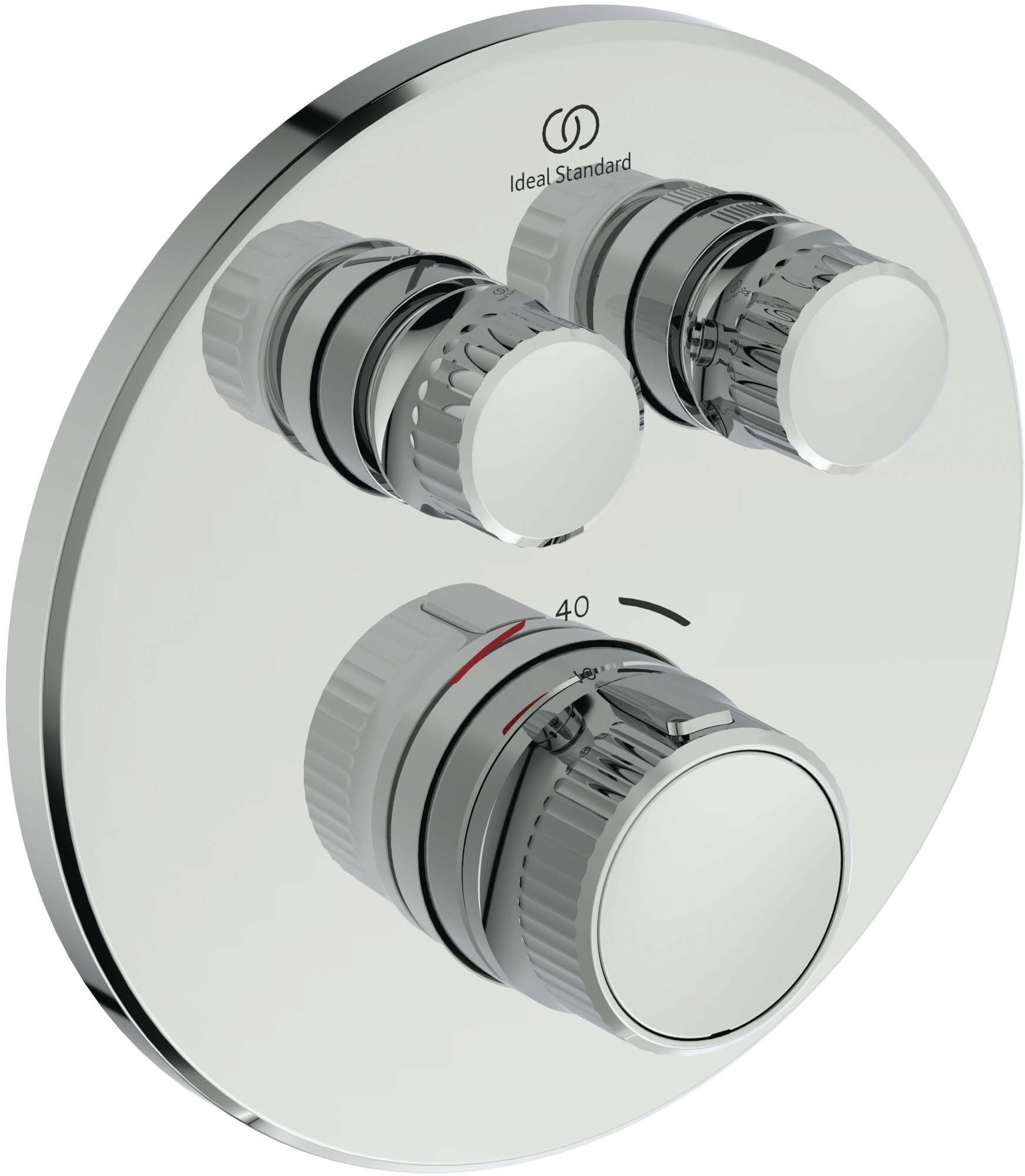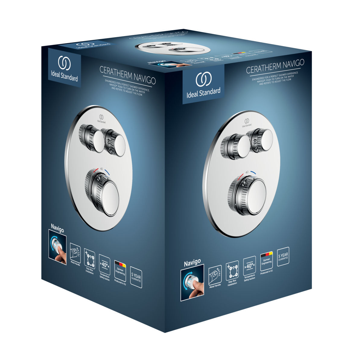 CERATHERM NAVIGO Встраиваемый термостатический смеситель для душа, комплект №2 (функциональный комплект и накладка для настенного монтажа); термостатический картридж FirmaFlow Therm; без душевого гарнитура; 2 рукоятки потока - управление двумя независимыми друг от друга потоками (2-х функциональные металлические рукоятки - включение/выключение нажатием и регулировка потока поворотом); металлическая рукоятка с ограничителем температуры 40°C, с насечкамим для удобного захвата; плоская металлическая накладка. Простота в эксплуатации благодаря эргономичным ручкам и достаточному расстоянию между элементами управления. Для монтажа с комплектом EASY-BOX A1000NU (заказывается дополнительно)