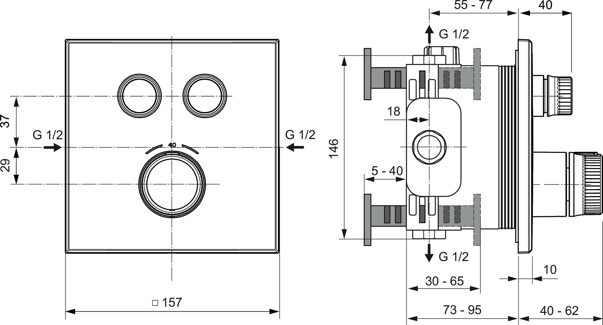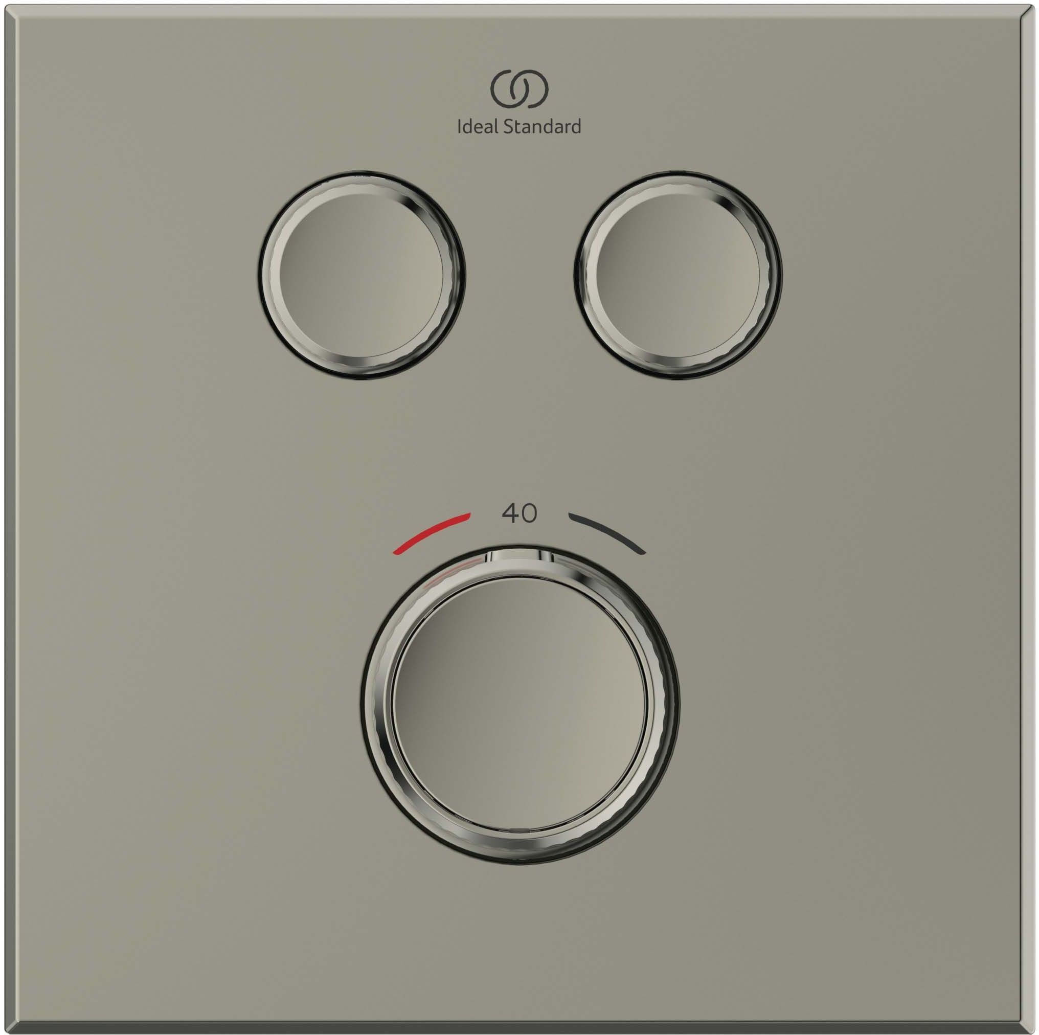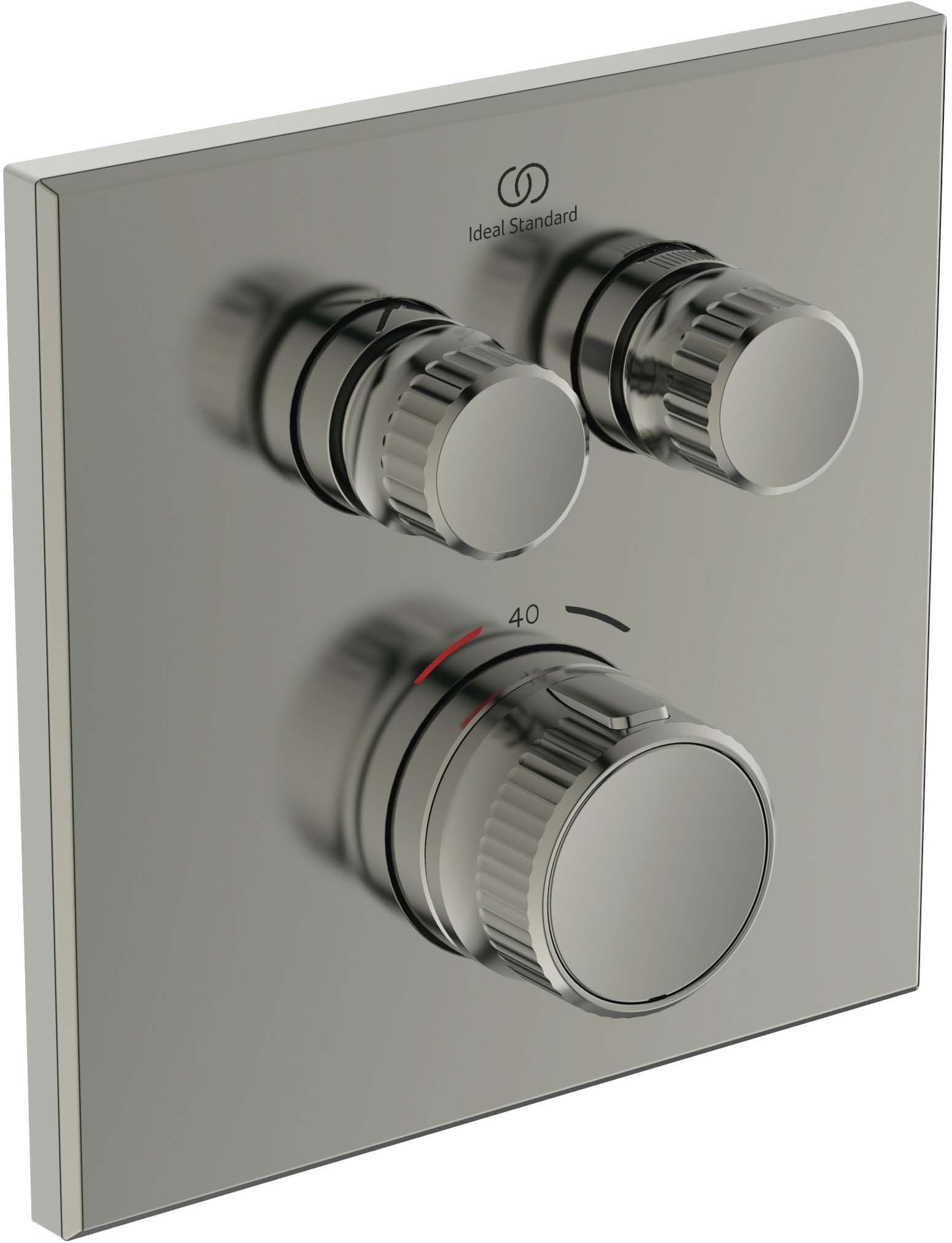 CERATHERM NAVIGO Встраиваемый термостатический смеситель для душа, комплект №2 (функциональный комплект и накладка для настенного монтажа); термостатический картридж FirmaFlow Therm; без душевого гарнитура; 2 рукоятки потока - управление двумя независимыми друг от друга потоками (2-х функциональные металлические рукоятки - включение/выключение нажатием и регулировка потока поворотом); металлическая рукоятка с ограничителем температуры 40°C, с насечкамим для удобного захвата; плоская металлическая накладка. Простота в эксплуатации благодаря эргономичным ручкам и достаточному расстоянию между элементами управления. Для монтажа с комплектом EASY-BOX A1000NU (заказывается дополнительно)