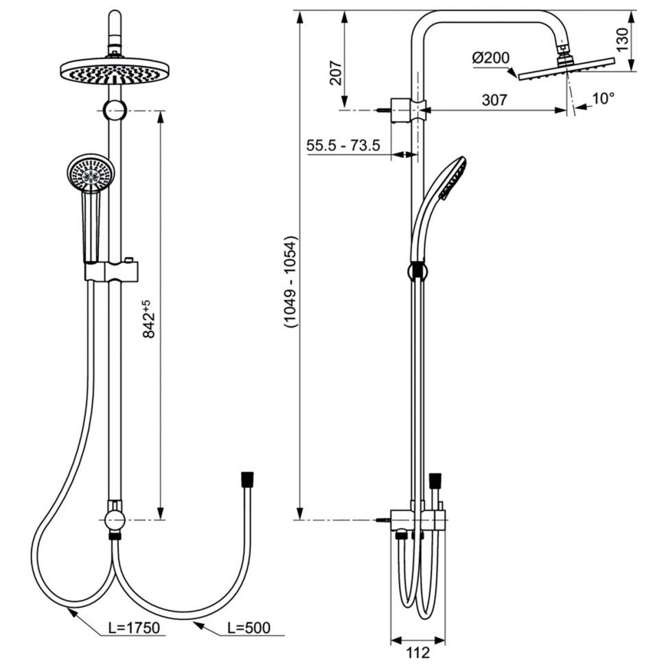 IDEALRAIN SOFT Душевая система для установки с настенным смесителем. 3-функциональная душевая лейка O100 мм (B9403AA), ограничение потока 8 л/мин., пластик; верхний душ O200 мм (латунь), ограничение потока 12 л/мин.; душевая труба O25 мм для верхнего душа (латунь), ручное переключение, пластиковый слайдер, металлические крепления к стене, шланг для душа IdealFlex 1750 мм (пластик). Смеситель заказывается дополнительно.