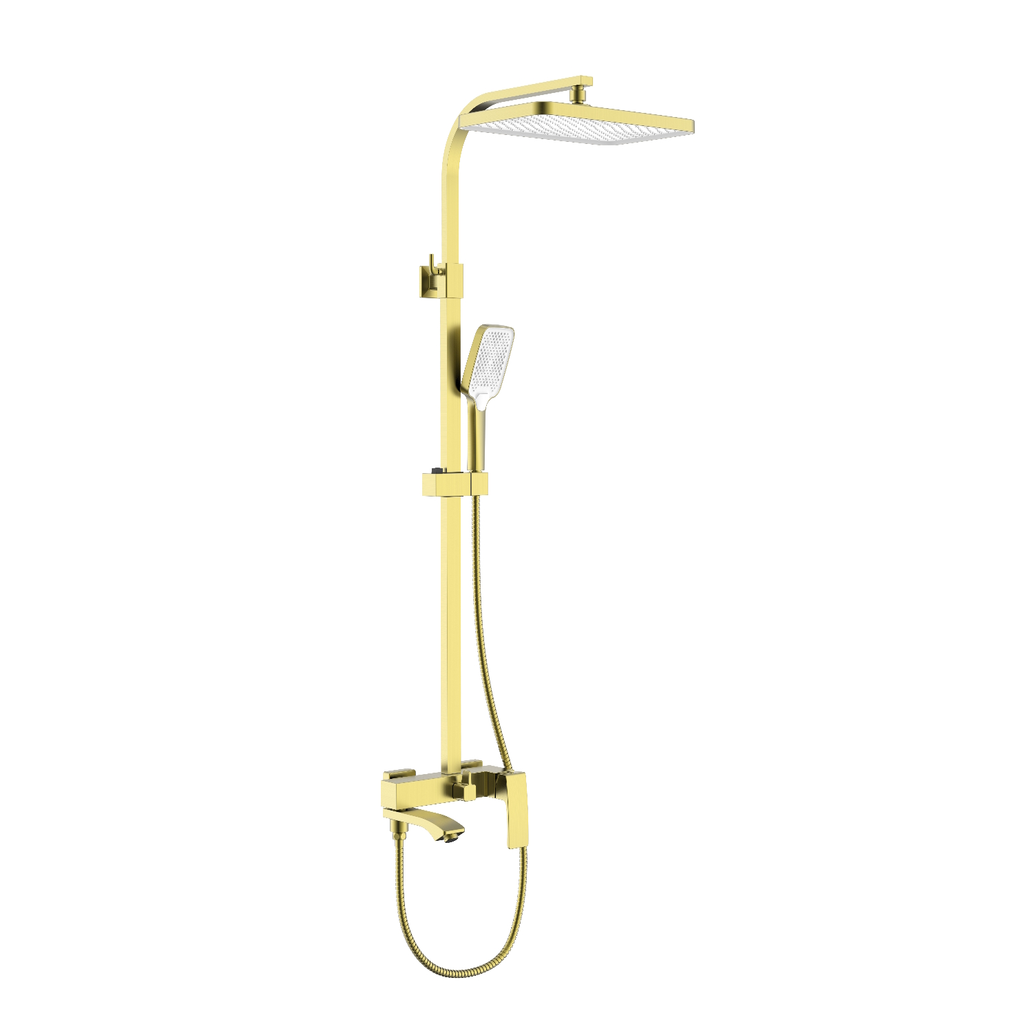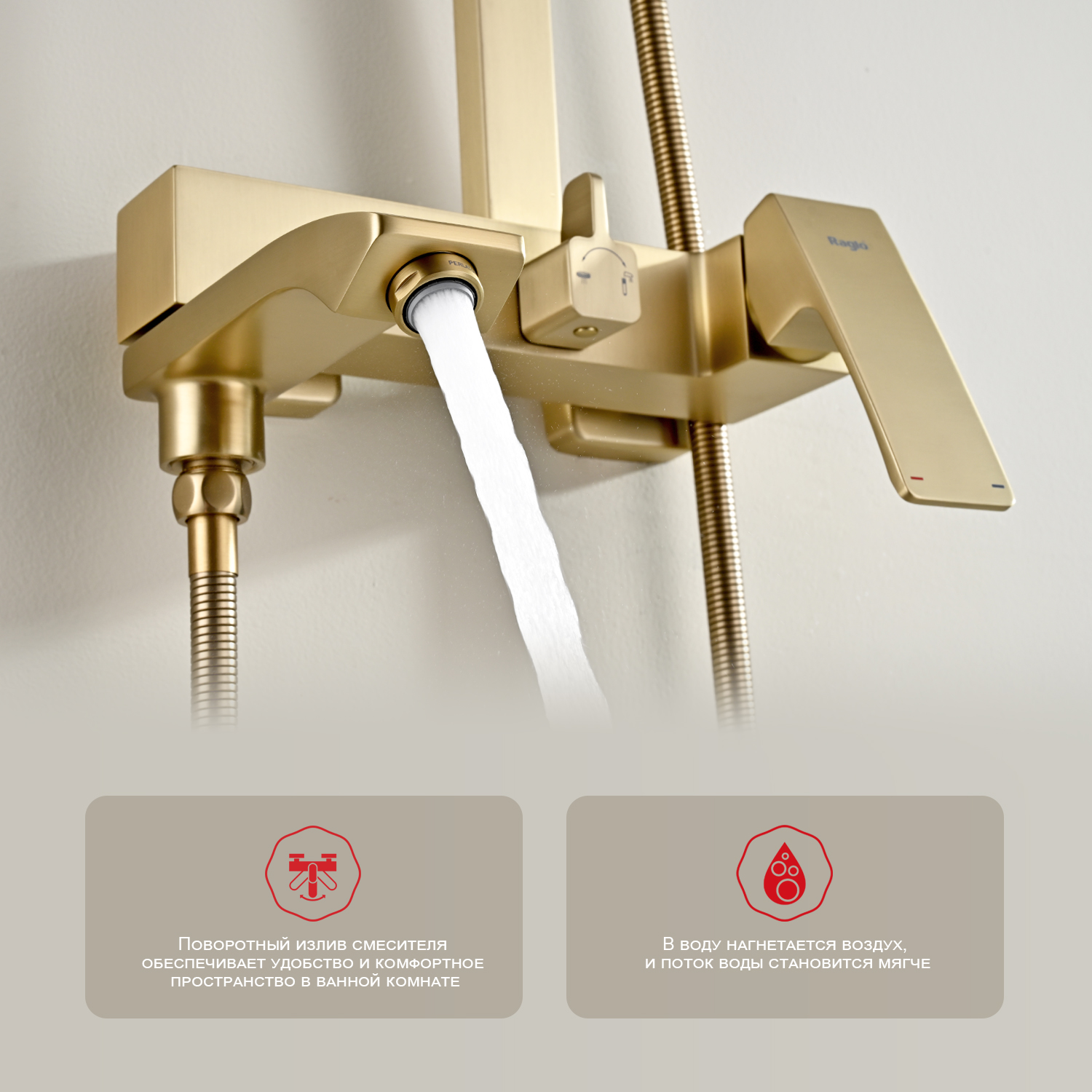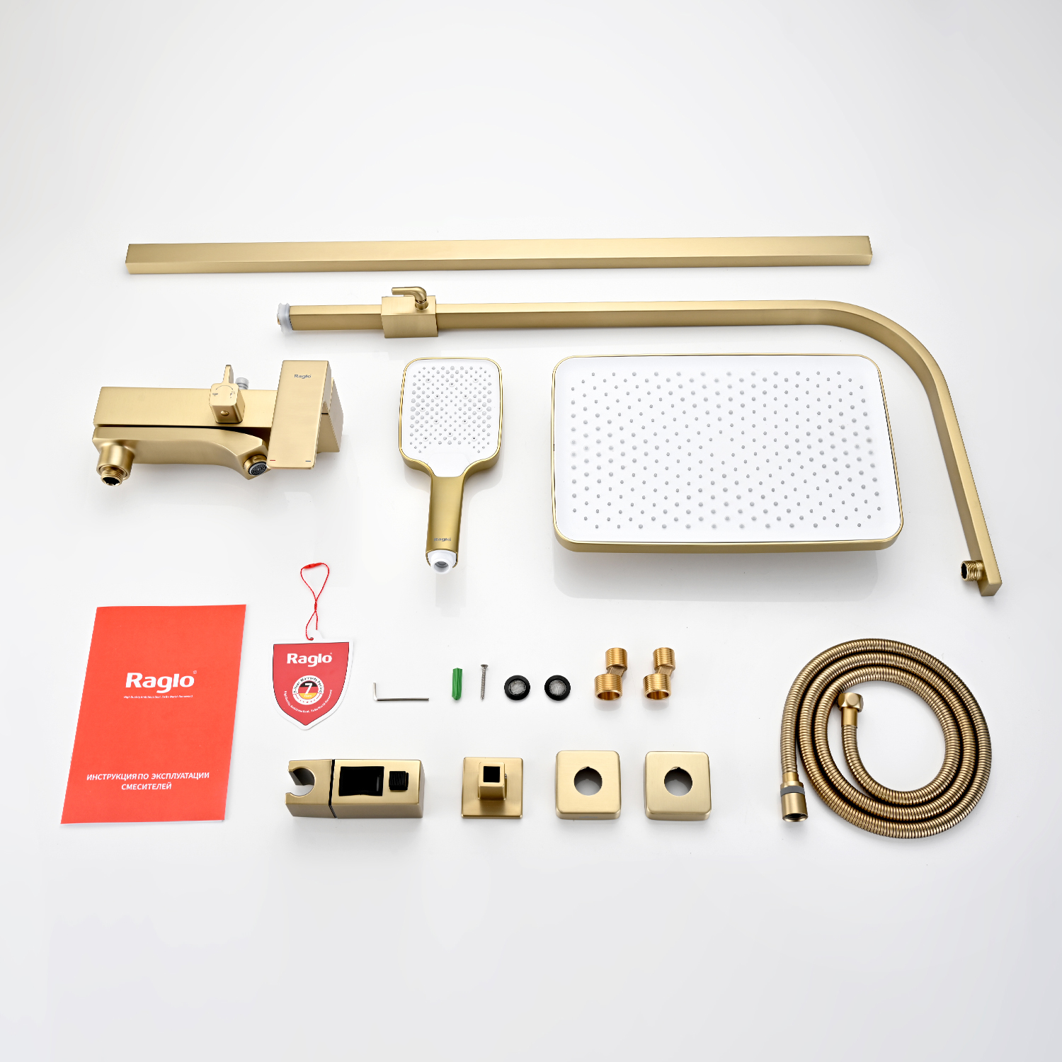 Душевая система Raglo R01.24.03. Цвет: сатин золотой. Материал: латунь. Управление: однорычажное. Механизм: керамический картридж. Излив: поворотный. Аэратор. Регулируемая по высоте душевая штанга: 1026-1566 мм. Форма верхнего душа: прямоугольная. Размер верхнего душа (ШхД): 340х220 мм. Регулируемый по высоте держатель ручного душа. Форма ручного душа: прямоугольная. Количество режимов струи ручного душа: 3. Отверстия для монтажа: 3. Стандарт подводки: G 1/2. Монтаж: на стену.