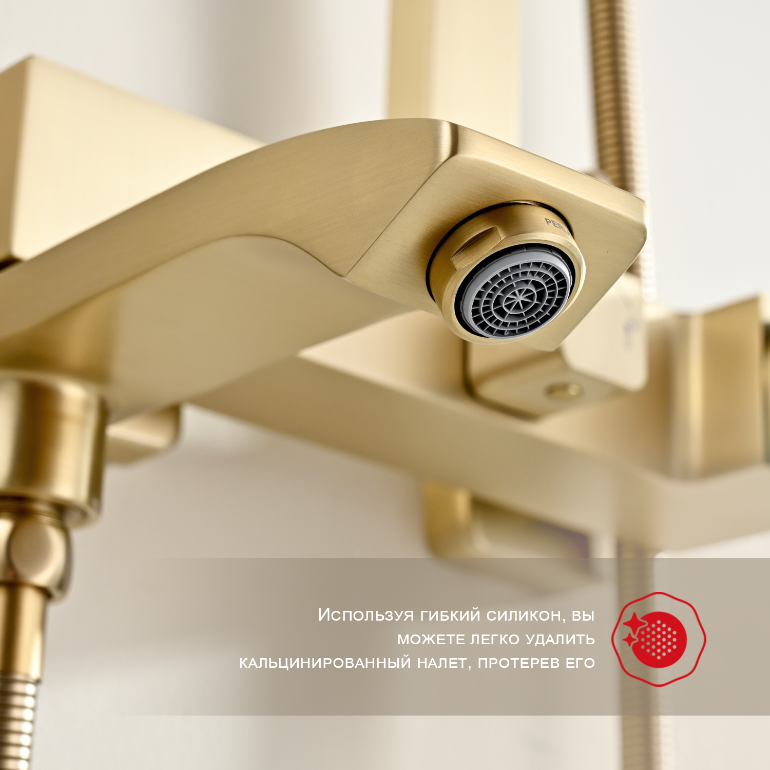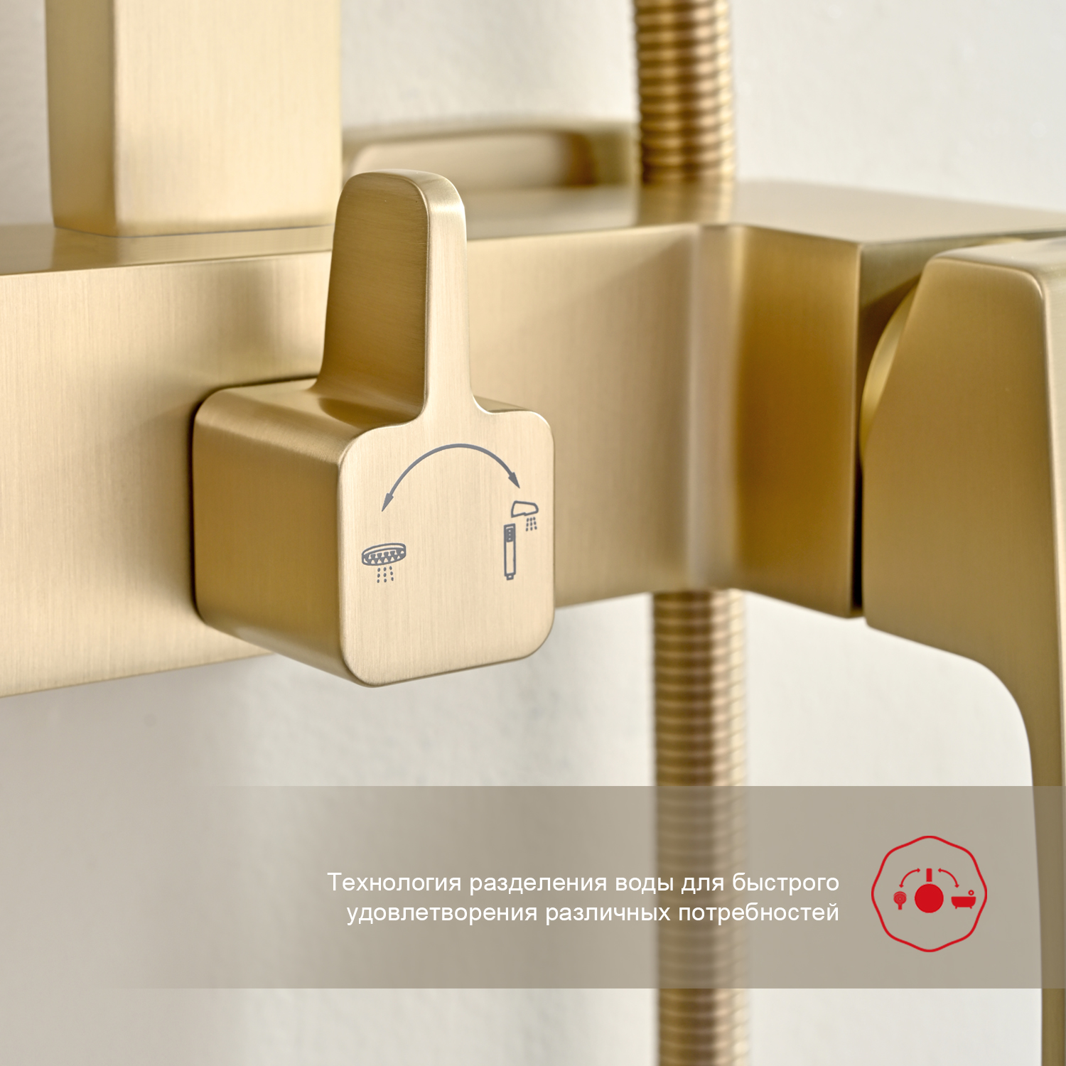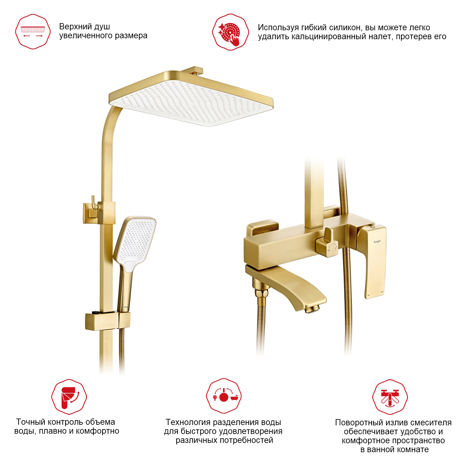 Душевая система Raglo R01.24.03. Цвет: сатин золотой. Материал: латунь. Управление: однорычажное. Механизм: керамический картридж. Излив: поворотный. Аэратор. Регулируемая по высоте душевая штанга: 1026-1566 мм. Форма верхнего душа: прямоугольная. Размер верхнего душа (ШхД): 340х220 мм. Регулируемый по высоте держатель ручного душа. Форма ручного душа: прямоугольная. Количество режимов струи ручного душа: 3. Отверстия для монтажа: 3. Стандарт подводки: G 1/2. Монтаж: на стену.
