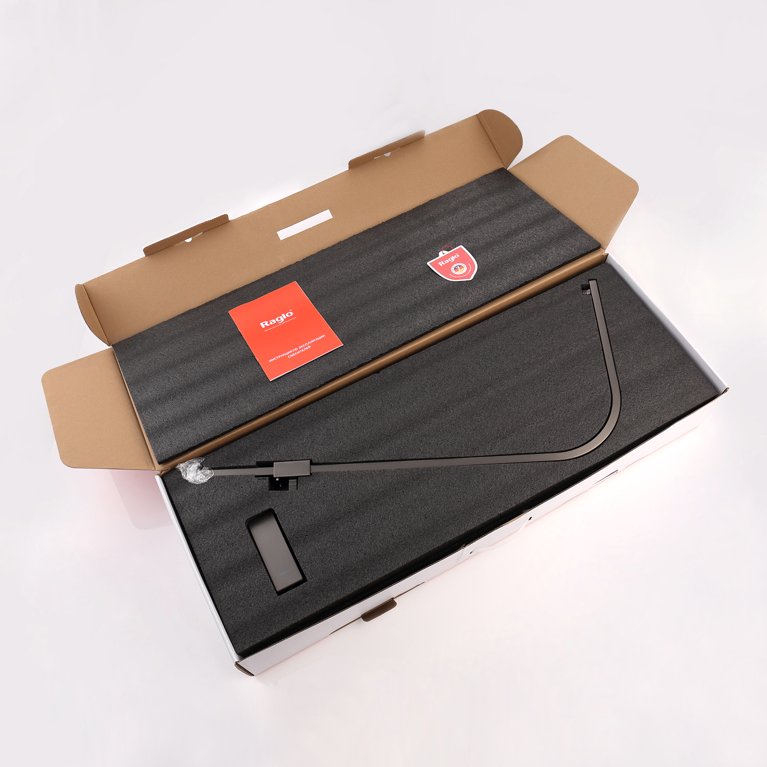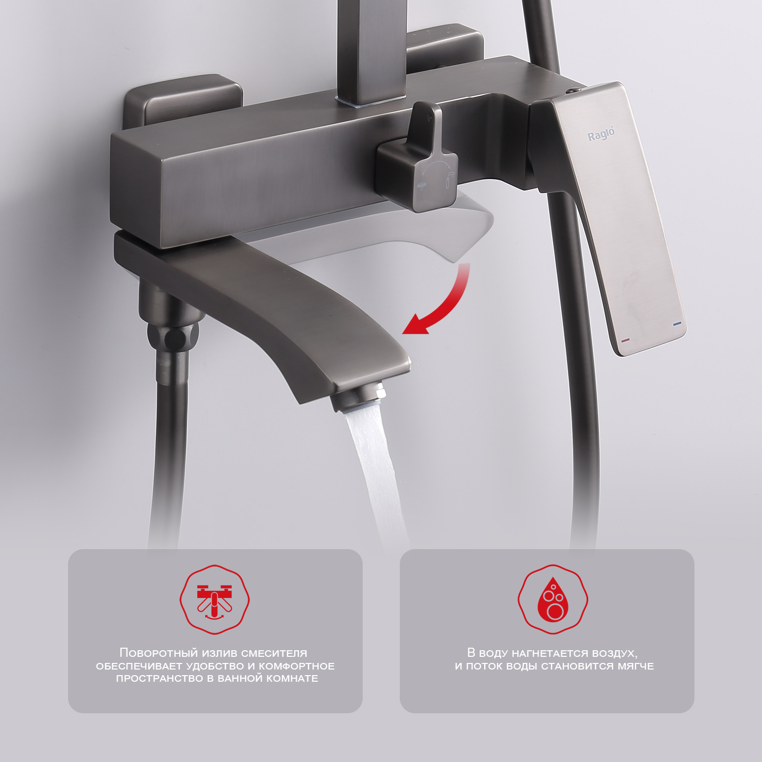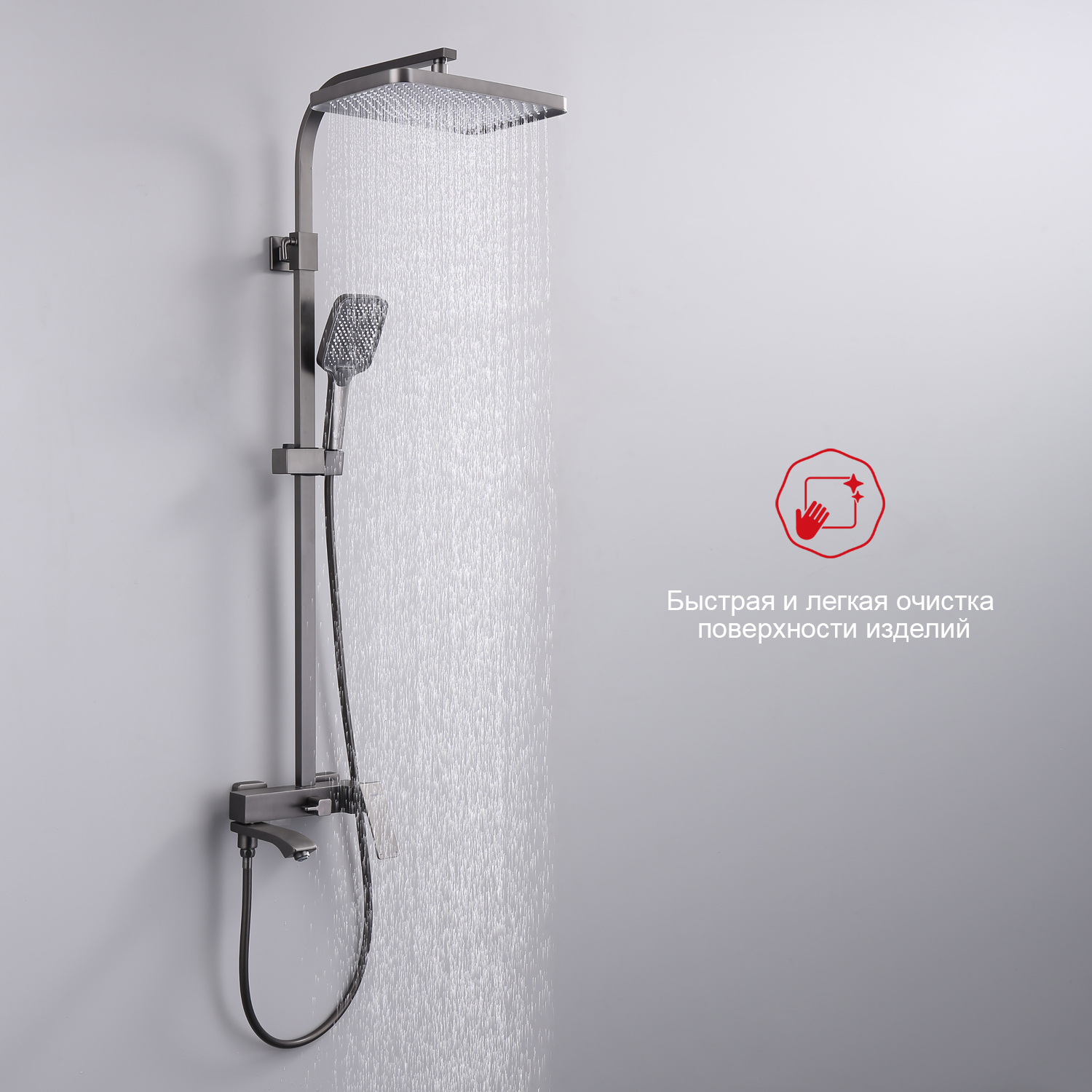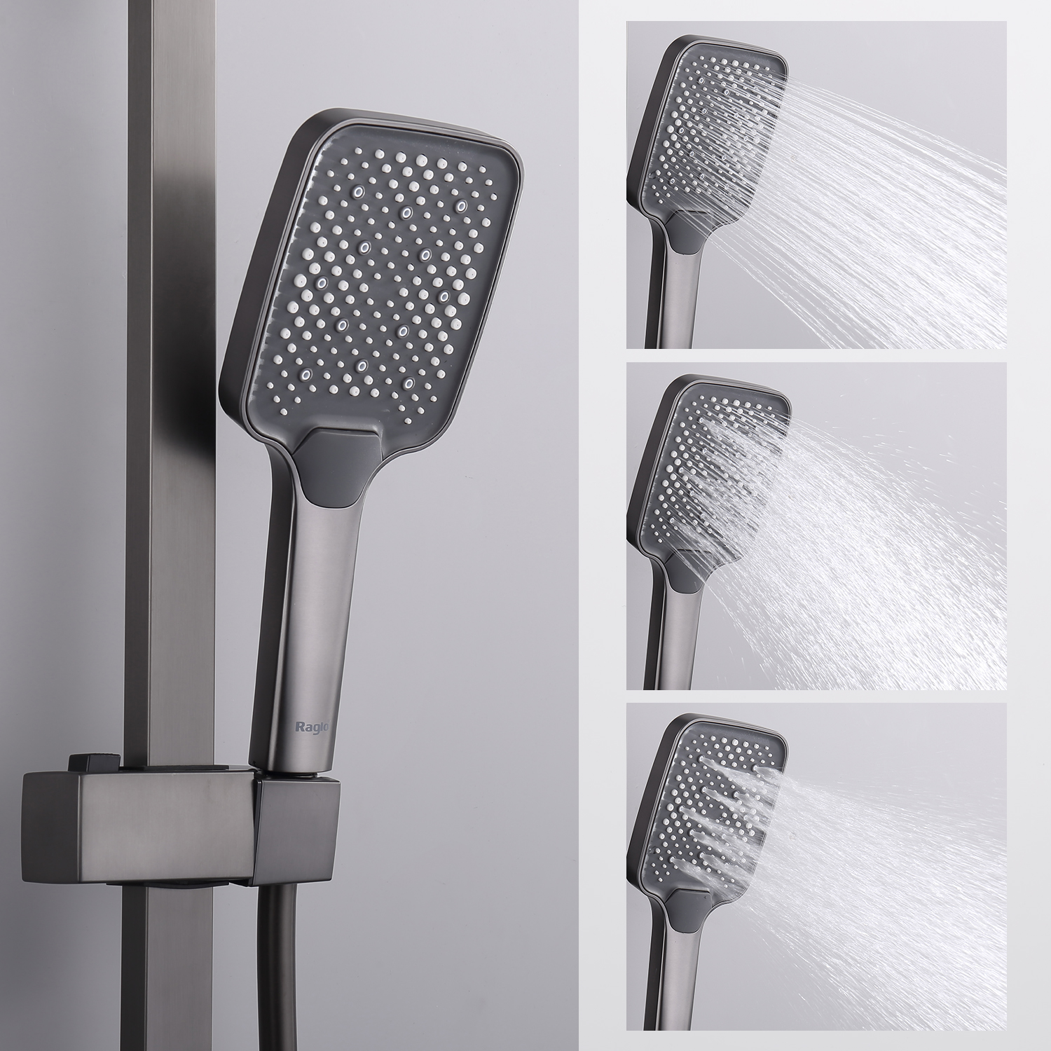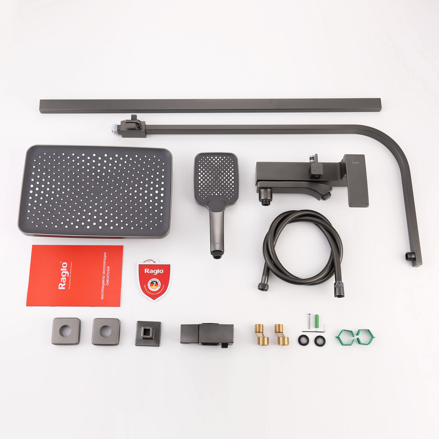 Душевая система Raglo R01.24.09. Цвет: графит. Материал: латунь. Управление: однорычажное. Механизм: керамический картридж. Излив: поворотный. Аэратор. Регулируемая по высоте душевая штанга: 1026-1566 мм. Форма верхнего душа: прямоугольная. Размер верхнего душа (ШхД): 340х220 мм. Регулируемый по высоте держатель ручного душа. Форма ручного душа: прямоугольная. Количество режимов струи ручного душа: 3. Отверстия для монтажа: 3. Стандарт подводки: G 1/2. Монтаж: на стену.