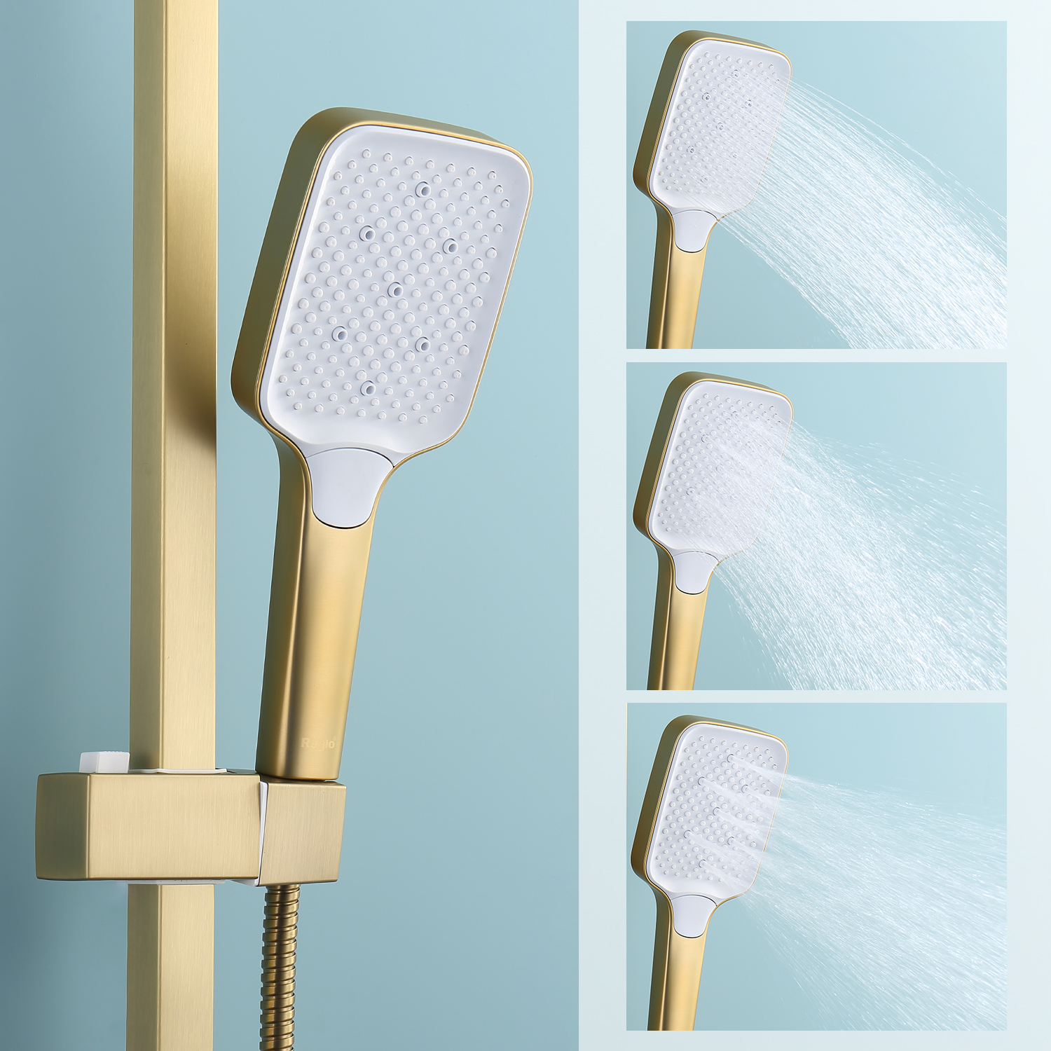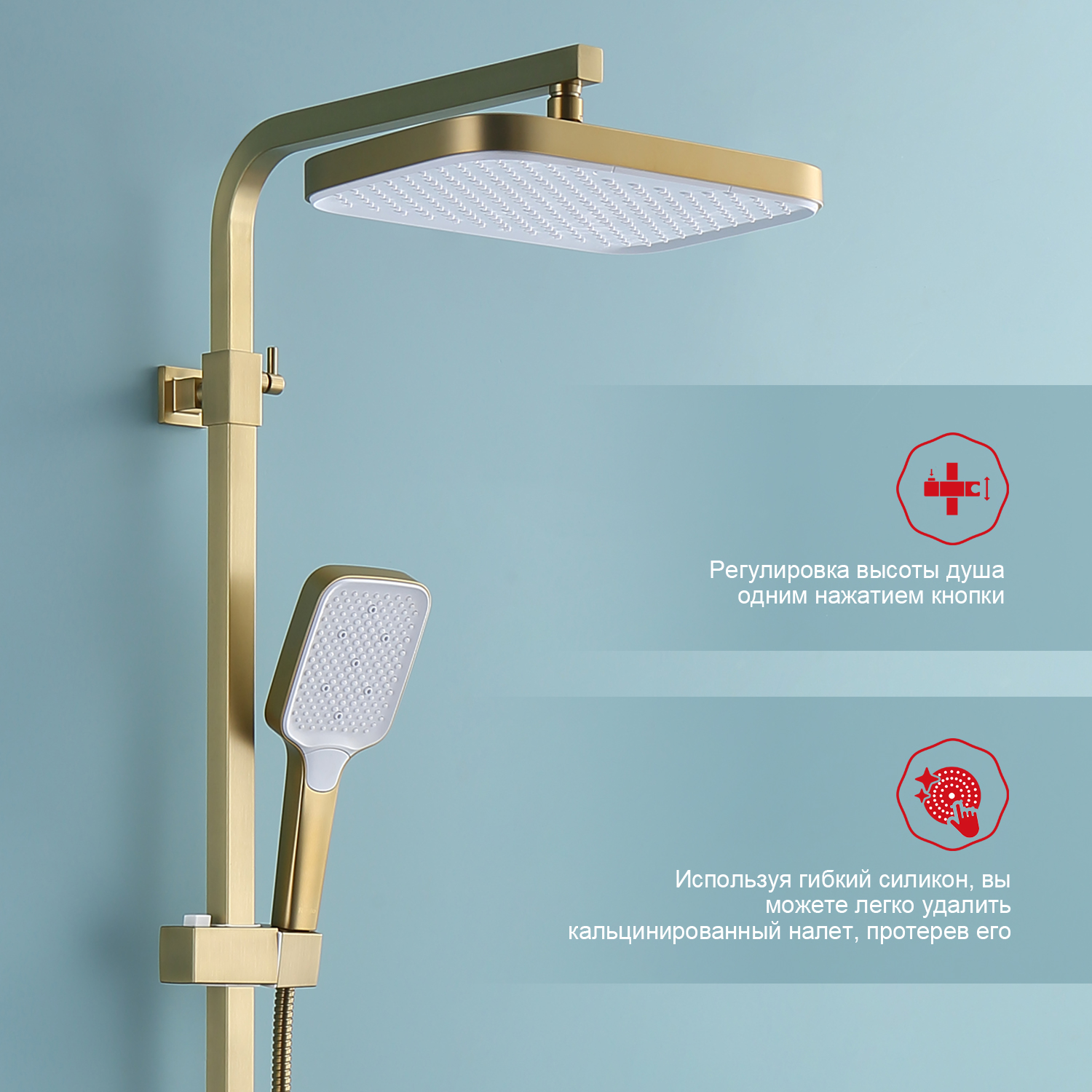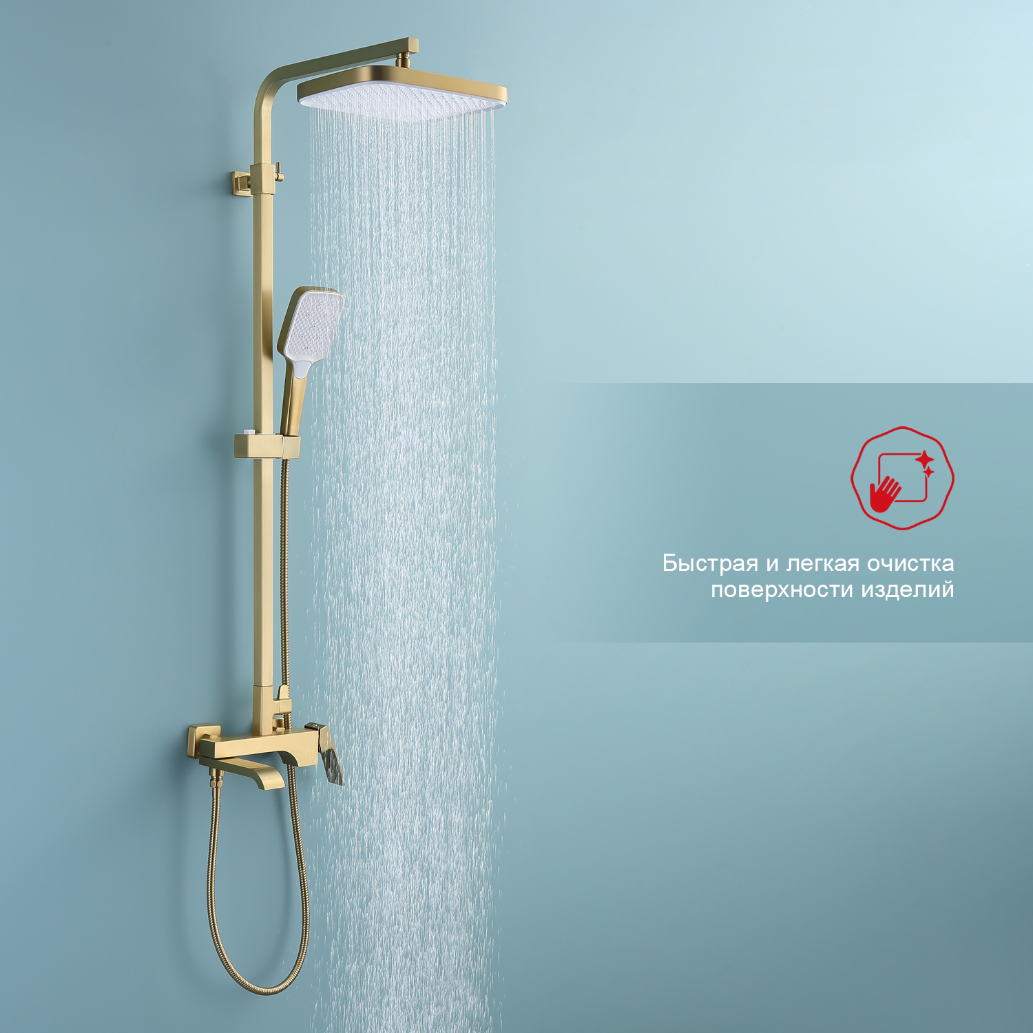 Душевая система Raglo R02.24.03. Цвет: сатин золотой. Материал: латунь. Управление: однорычажное. Механизм: керамический картридж. Излив: поворотный. Аэратор. Тип излива: каскадный. Регулируемая по высоте душевая штанга: 1082-1650 мм. Форма верхнего душа: прямоугольная. Размер верхнего душа (ШхД): 315х208 мм. Регулируемый по высоте и наклону держатель ручного душа. Форма ручного душа: прямоугольная. Количество режимов струи ручного душа: 3. Отверстия для монтажа: 3. Стандарт подводки: G 1/2. Монтаж: на стену.