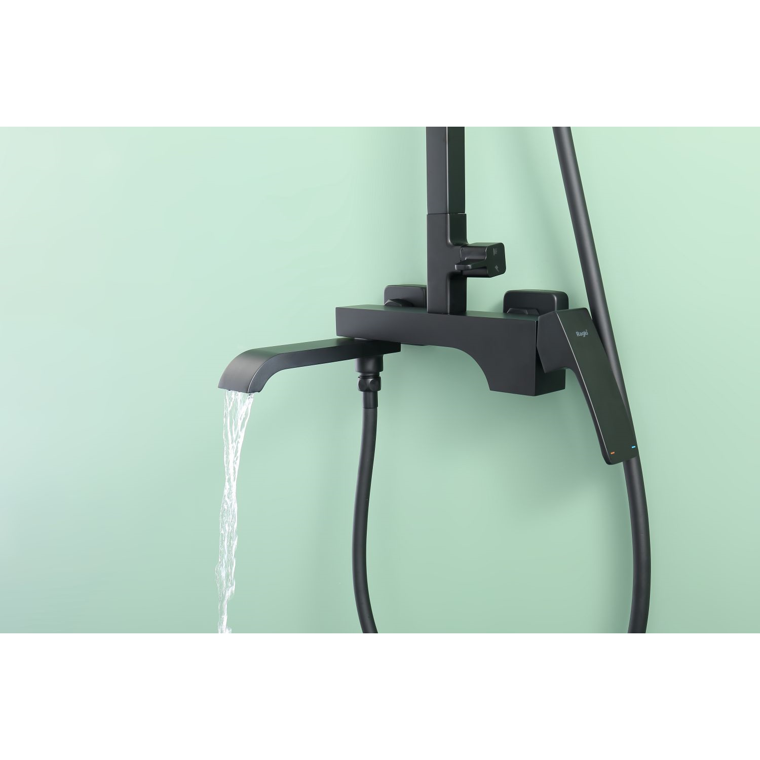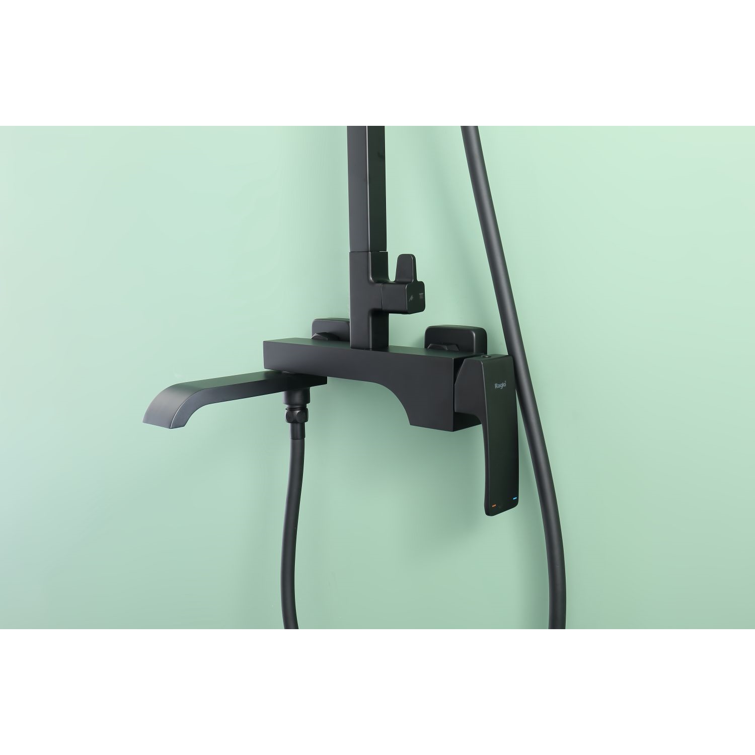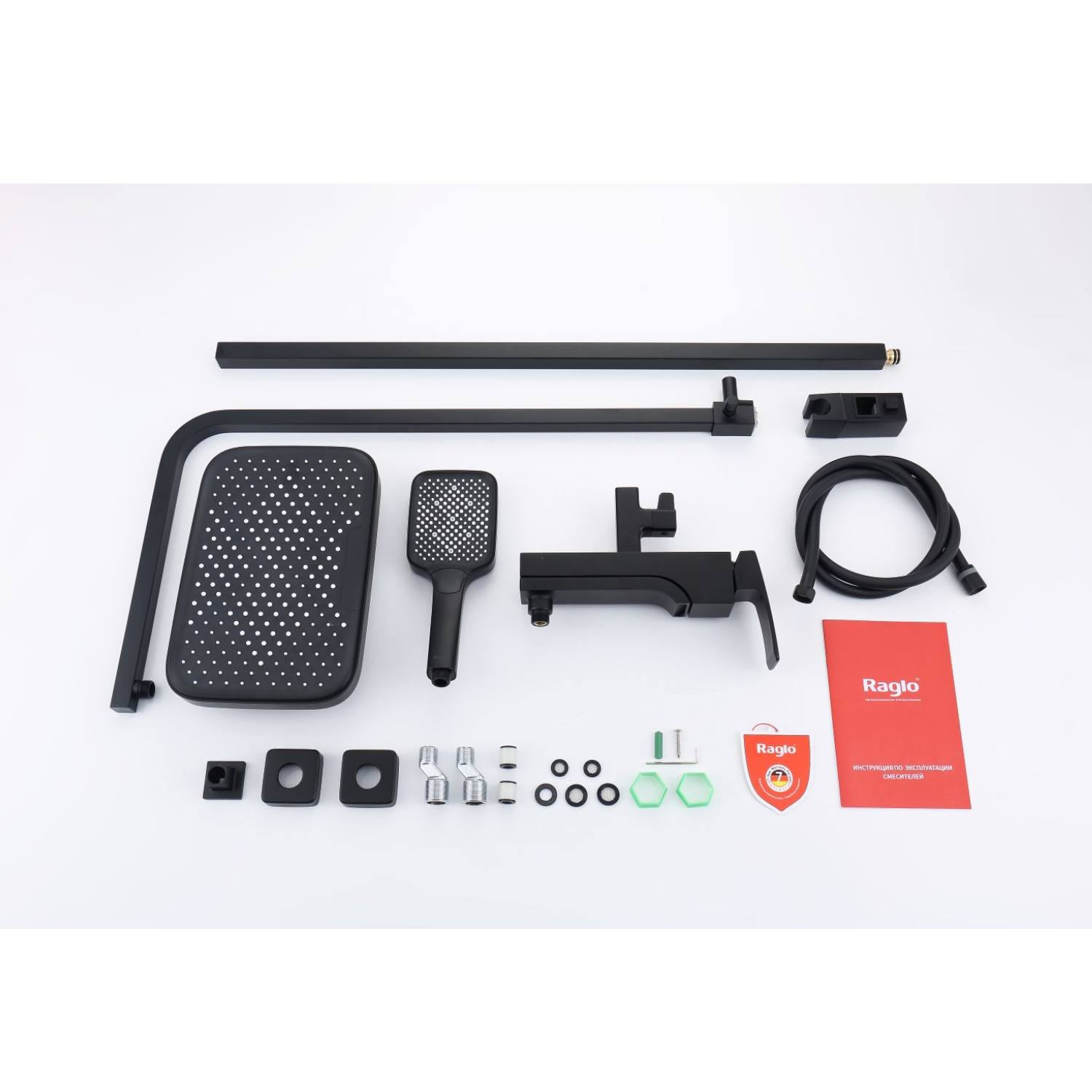 Душевая система Raglo R02.24.06. Цвет: черный. Материал: латунь. Управление: однорычажное. Механизм: керамический картридж. Излив: поворотный. Аэратор. Тип излива: каскадный. Регулируемая по высоте душевая штанга: 1082-1650 мм. Форма верхнего душа: прямоугольная. Размер верхнего душа (ШхД): 315х208 мм. Регулируемый по высоте и наклону держатель ручного душа. Форма ручного душа: прямоугольная. Количество режимов струи ручного душа: 3. Отверстия для монтажа: 3. Стандарт подводки: G 1/2. Монтаж: на стену.