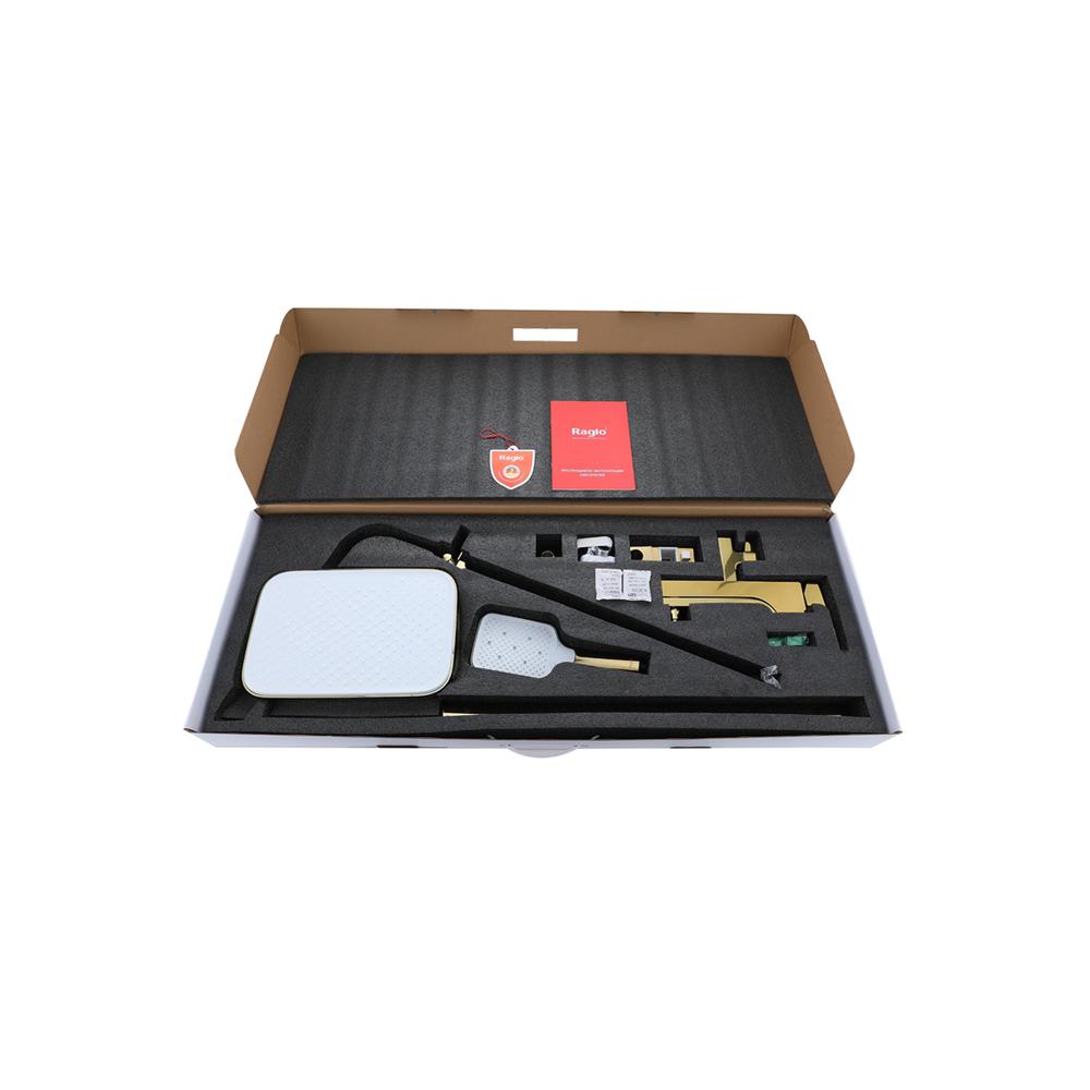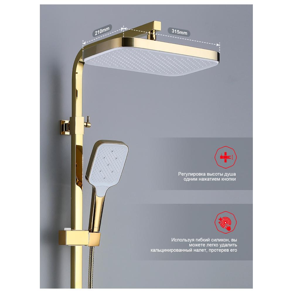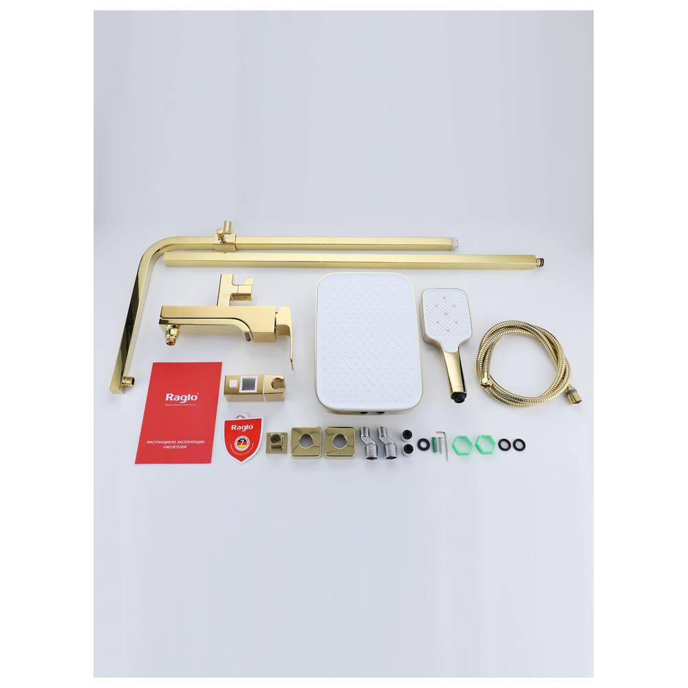 Душевая система Raglo R02.24.23. Цвет: золото. Материал: латунь. Управление: однорычажное. Механизм: керамический картридж. Излив: поворотный. Аэратор. Тип излива: каскадный. Регулируемая по высоте душевая штанга: 1082-1650 мм. Форма верхнего душа: прямоугольная. Регулируемый по высоте и наклону держатель ручного душа. Форма ручного душа: прямоугольная. Количество режимов струи ручного душа: 3. Отверстия для монтажа: 3. Стандарт подводки: G 1/2.