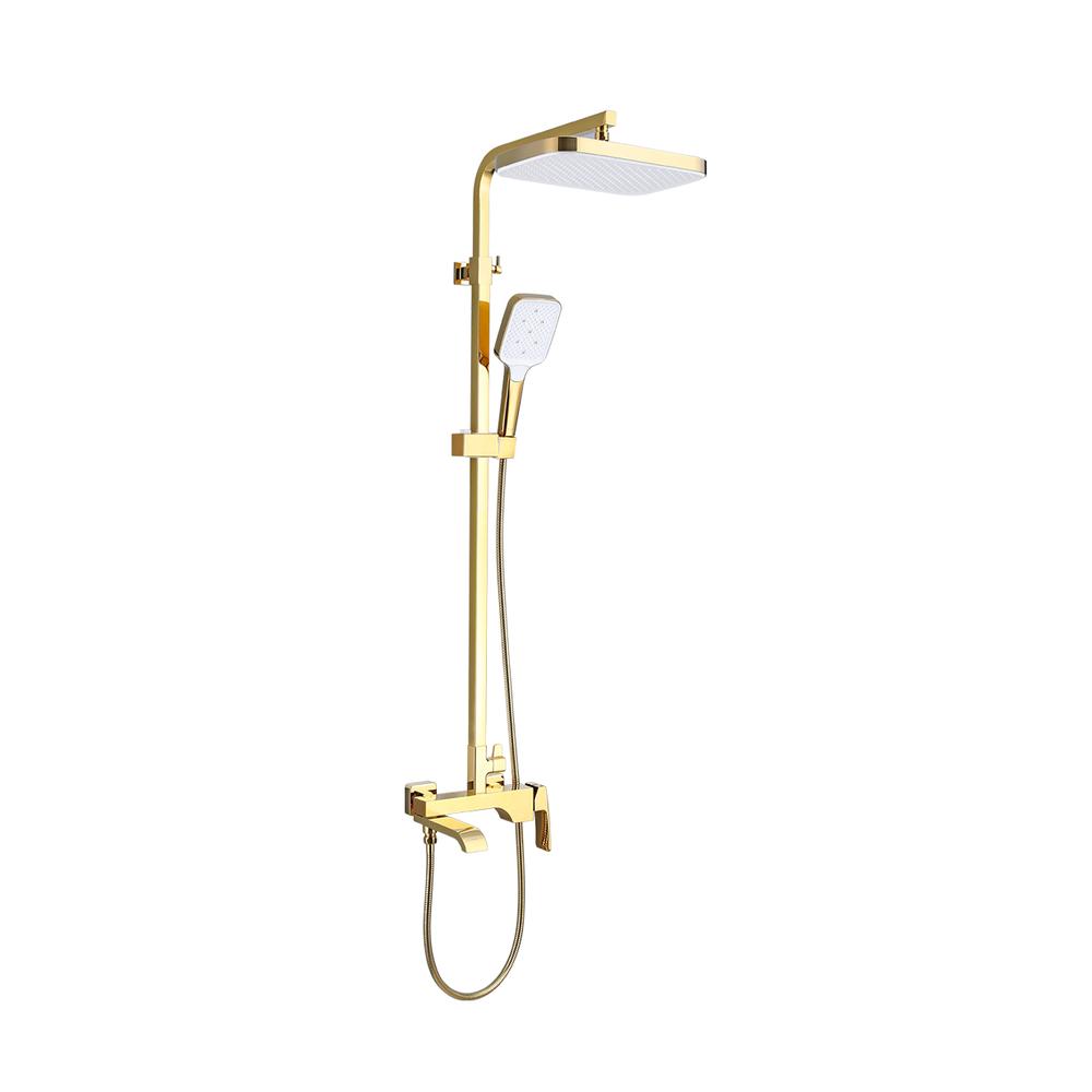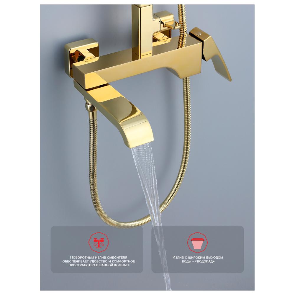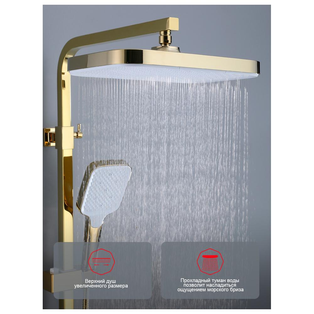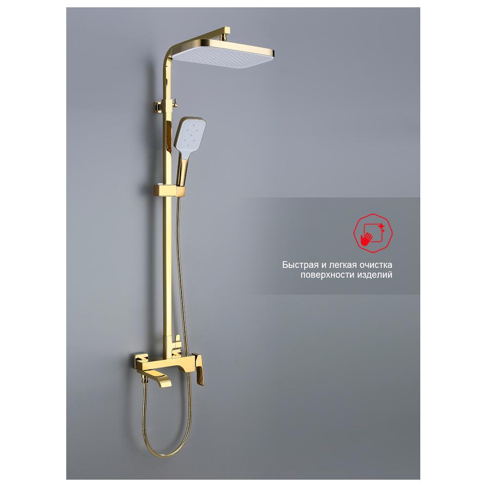 Душевая система Raglo R02.24.23. Цвет: золото. Материал: латунь. Управление: однорычажное. Механизм: керамический картридж. Излив: поворотный. Аэратор. Тип излива: каскадный. Регулируемая по высоте душевая штанга: 1082-1650 мм. Форма верхнего душа: прямоугольная. Регулируемый по высоте и наклону держатель ручного душа. Форма ручного душа: прямоугольная. Количество режимов струи ручного душа: 3. Отверстия для монтажа: 3. Стандарт подводки: G 1/2.