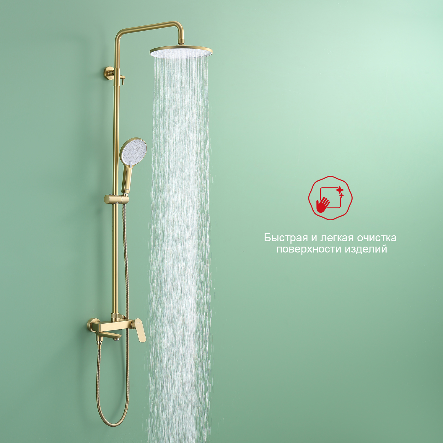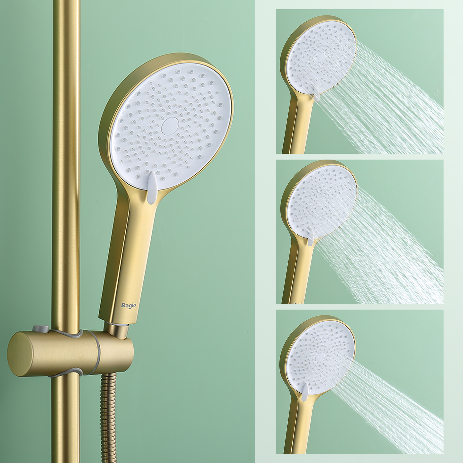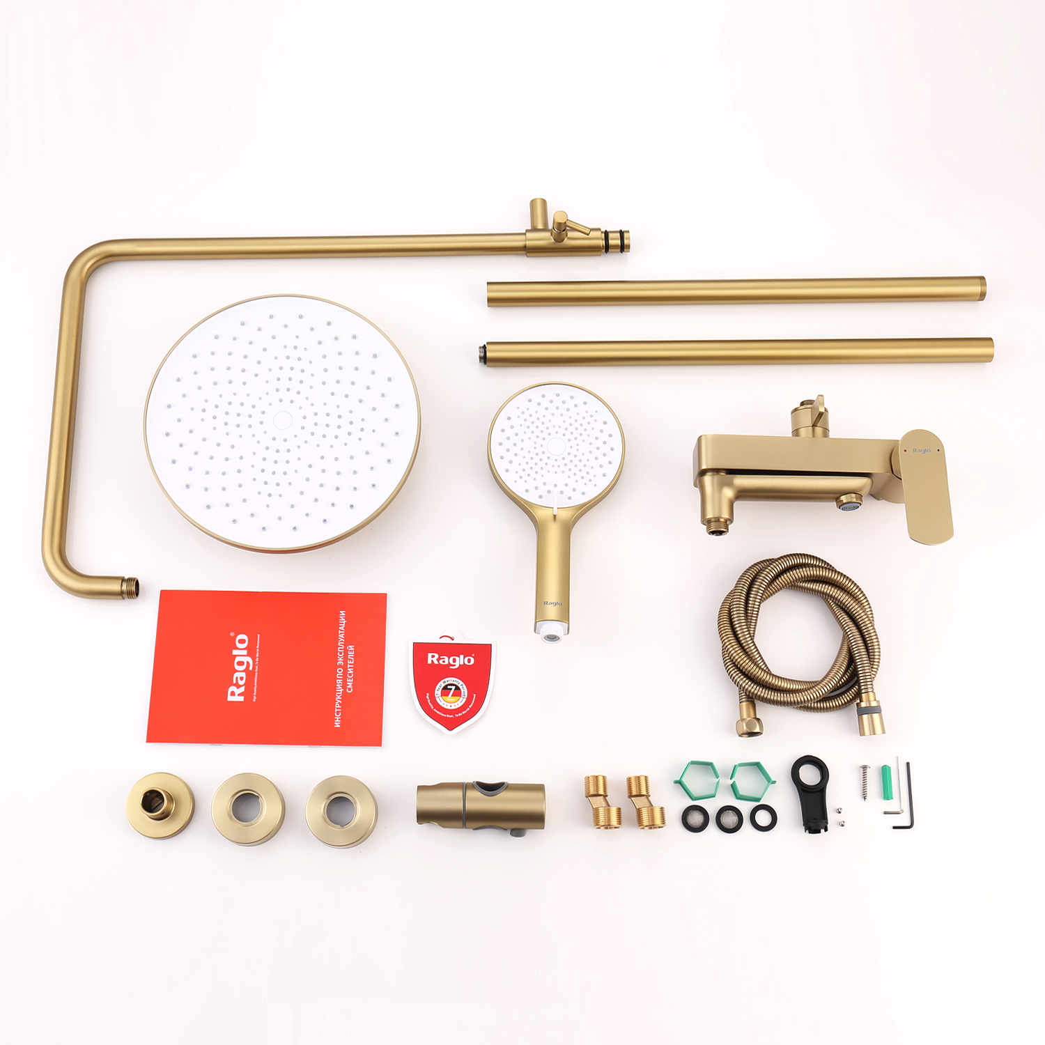 Душевая система Raglo R03.24.03. Цвет: золотой сатин. Материал: латунь. Управление: однорычажное. Механизм: керамический картридж. Излив: поворотный. Аэратор. Регулируемая по высоте душевая штанга: 1065-1565 мм. Форма верхнего душа: круглая. Диаметр верхнего душа: 255 мм. Регулируемый по высоте и наклону держатель ручного душа. Форма ручного душа: круглая. Количество режимов струи ручного душа: 3. Отверстия для монтажа: 3. Стандарт подводки: G 1/2. Монтаж: на стену.