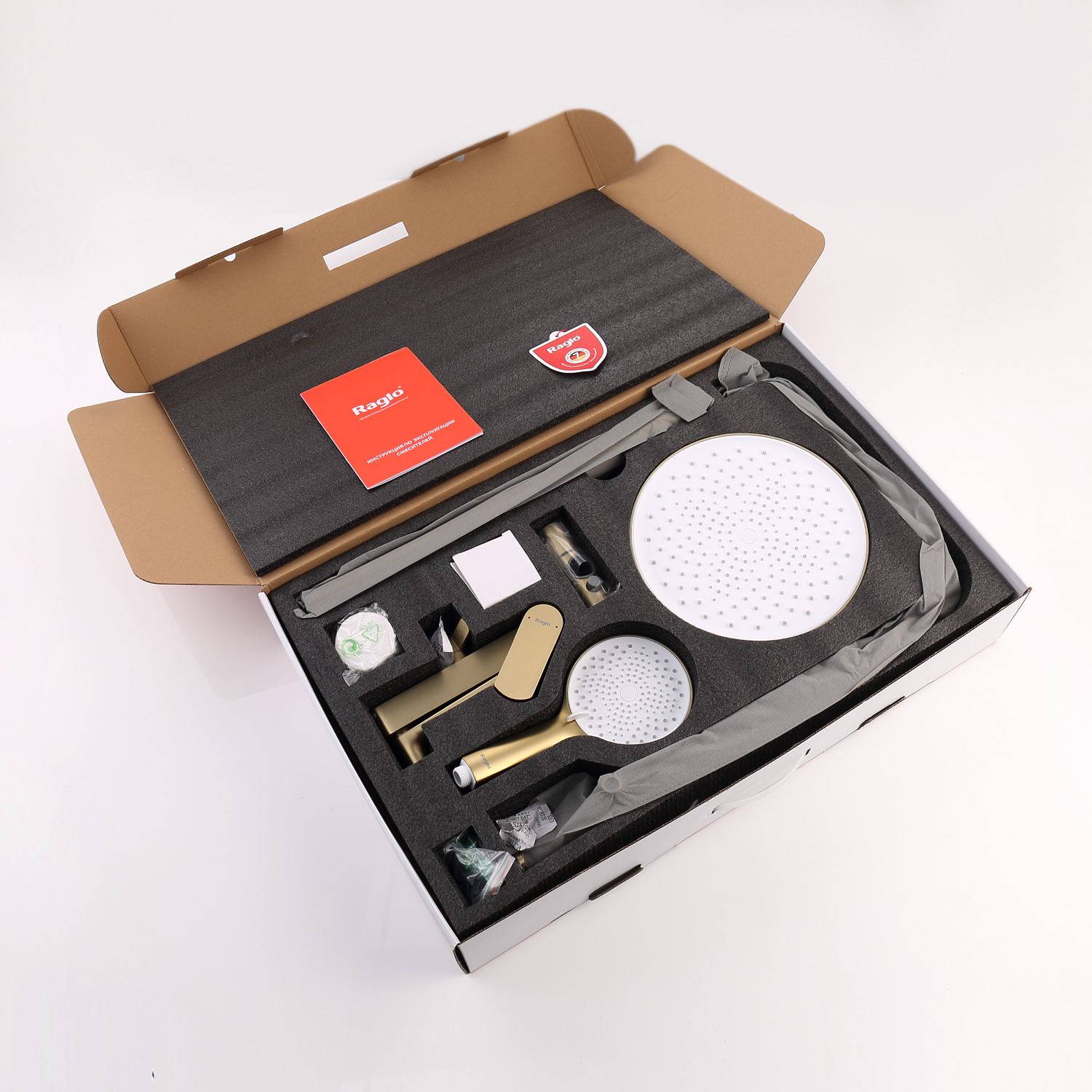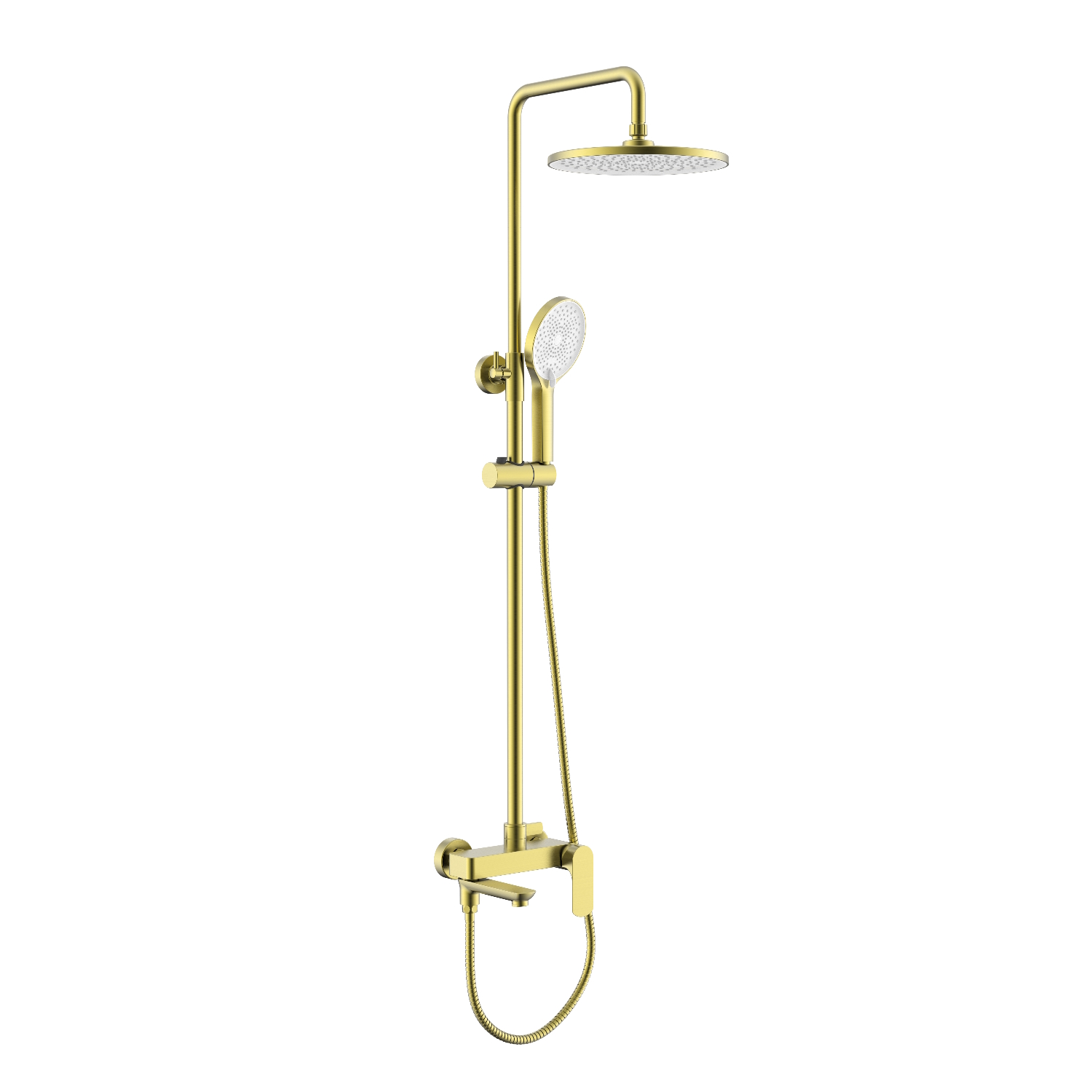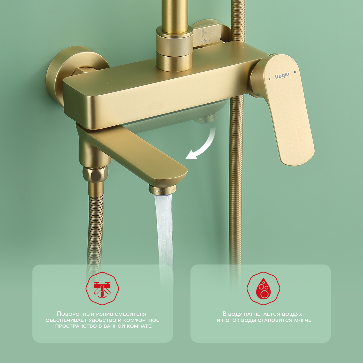 Душевая система Raglo R03.24.03. Цвет: золотой сатин. Материал: латунь. Управление: однорычажное. Механизм: керамический картридж. Излив: поворотный. Аэратор. Регулируемая по высоте душевая штанга: 1065-1565 мм. Форма верхнего душа: круглая. Диаметр верхнего душа: 255 мм. Регулируемый по высоте и наклону держатель ручного душа. Форма ручного душа: круглая. Количество режимов струи ручного душа: 3. Отверстия для монтажа: 3. Стандарт подводки: G 1/2. Монтаж: на стену.