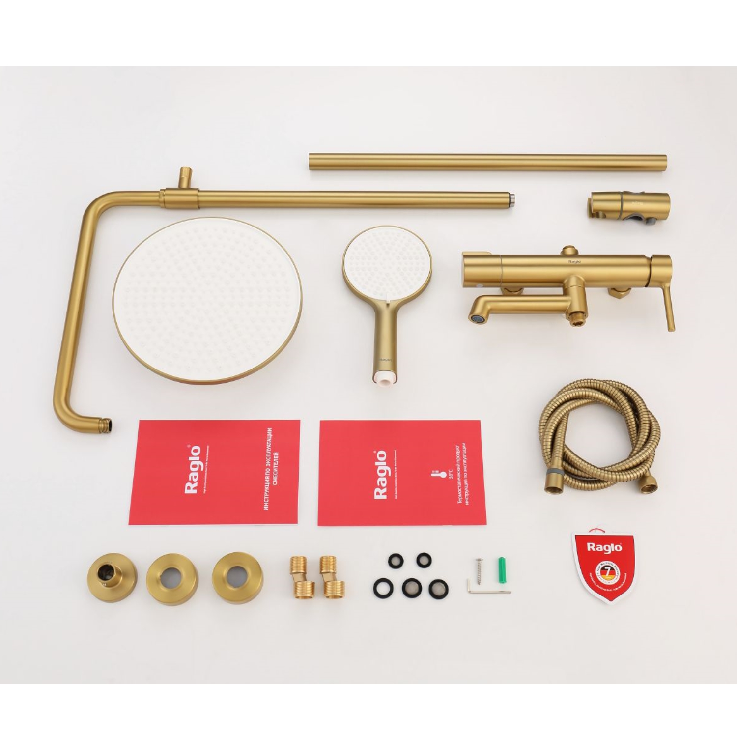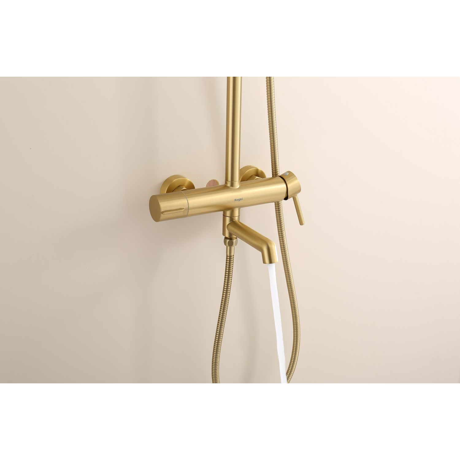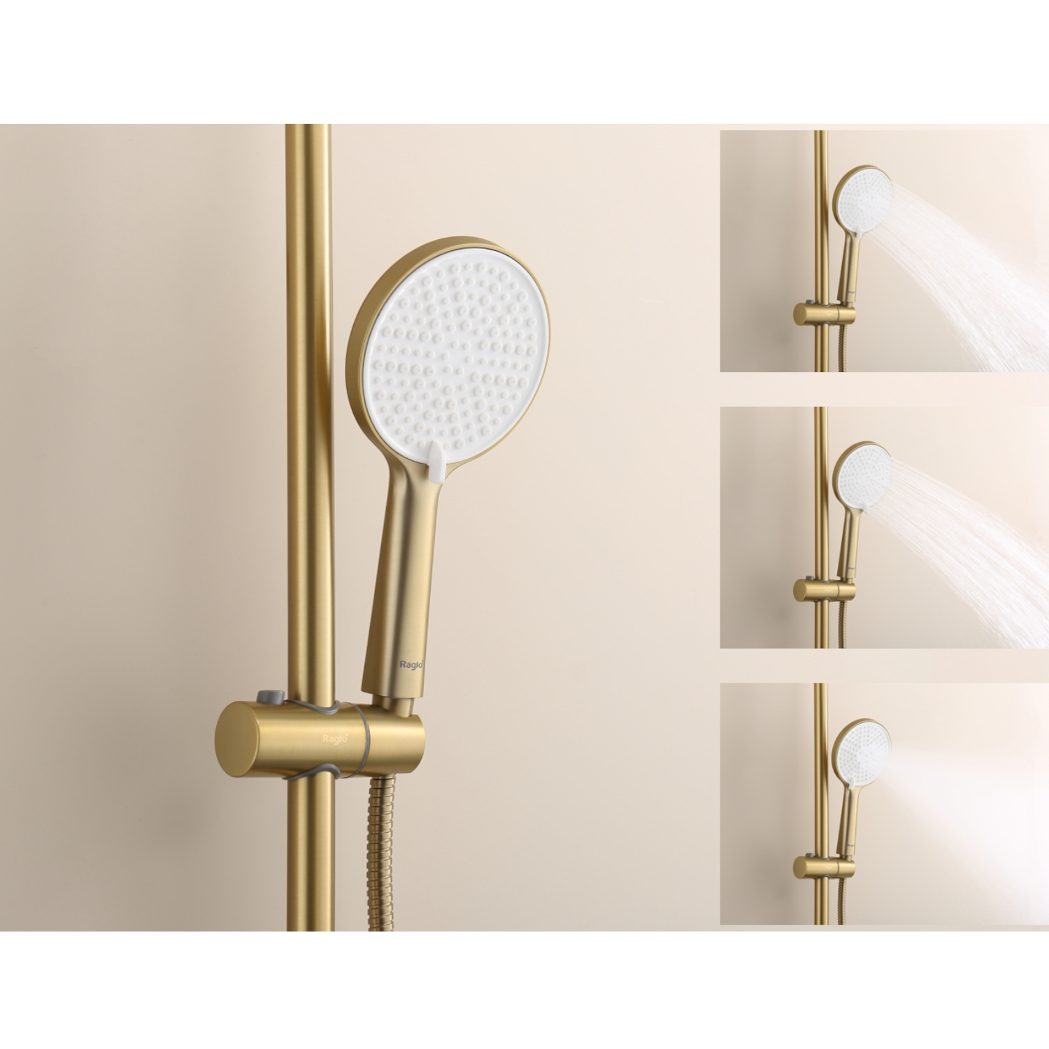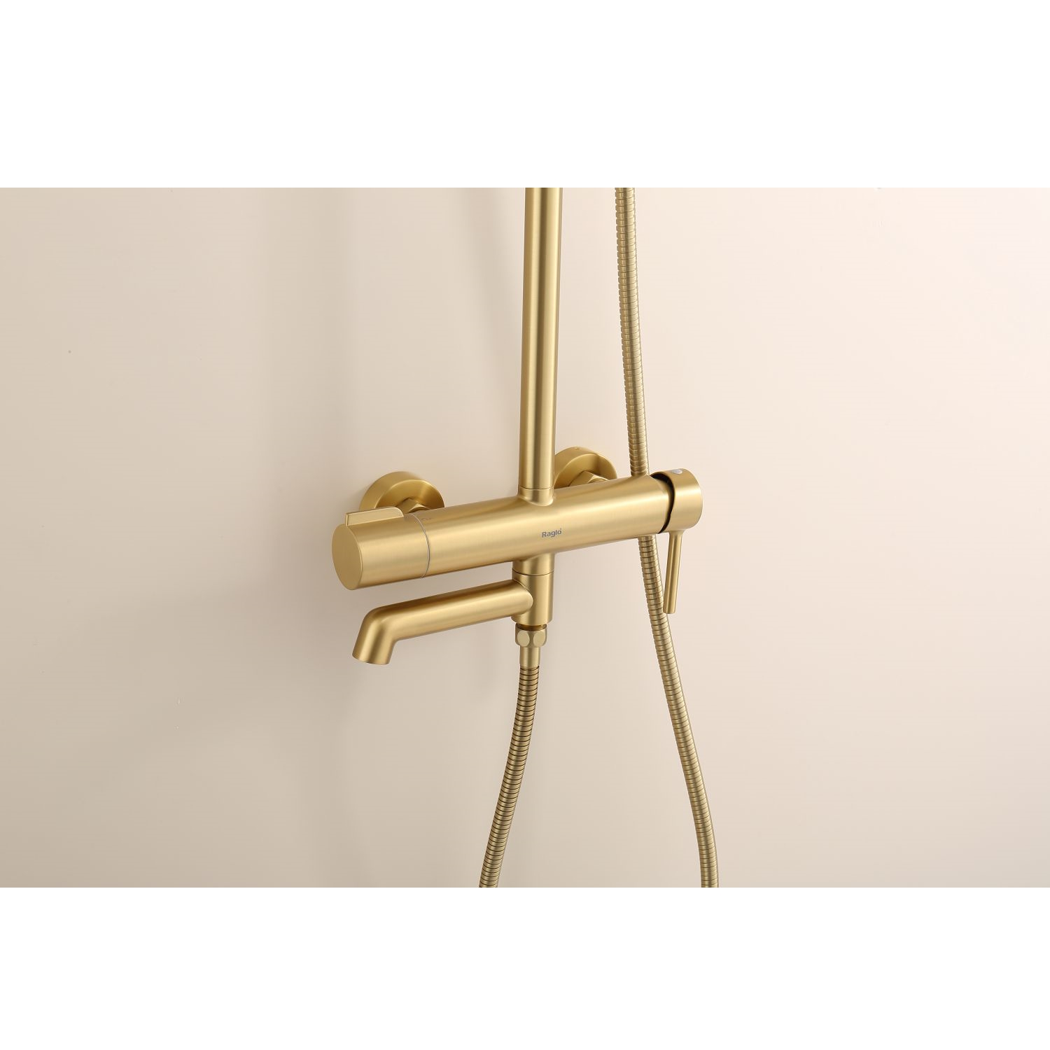 Душевая система Raglo R20.24.03. Цвет: сатин золотой. Материал: латунь. Управление: однорычажное. Механизм: керамический картридж. Излив: поворотный. Аэратор. Регулируемая по высоте душевая штанга: 1130-1480 мм. Форма верхнего душа: круглая. Диаметр верхнего душа: 250 мм. Регулируемый по высоте и наклону держатель ручного душа. Форма ручного душа: круглая. Количество режимов струи ручного душа: 3. Отверстия для монтажа: 3. Стандарт подводки: G 1/2. Монтаж: на стену.