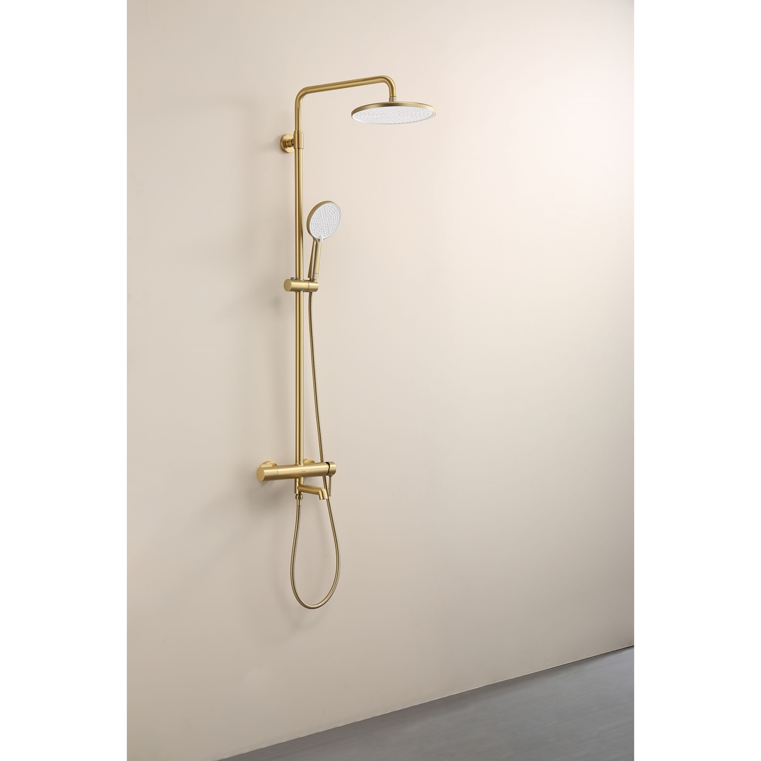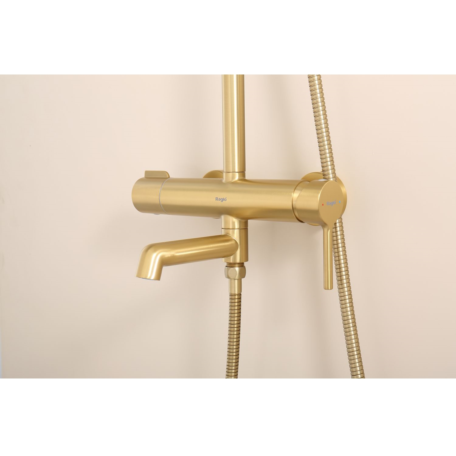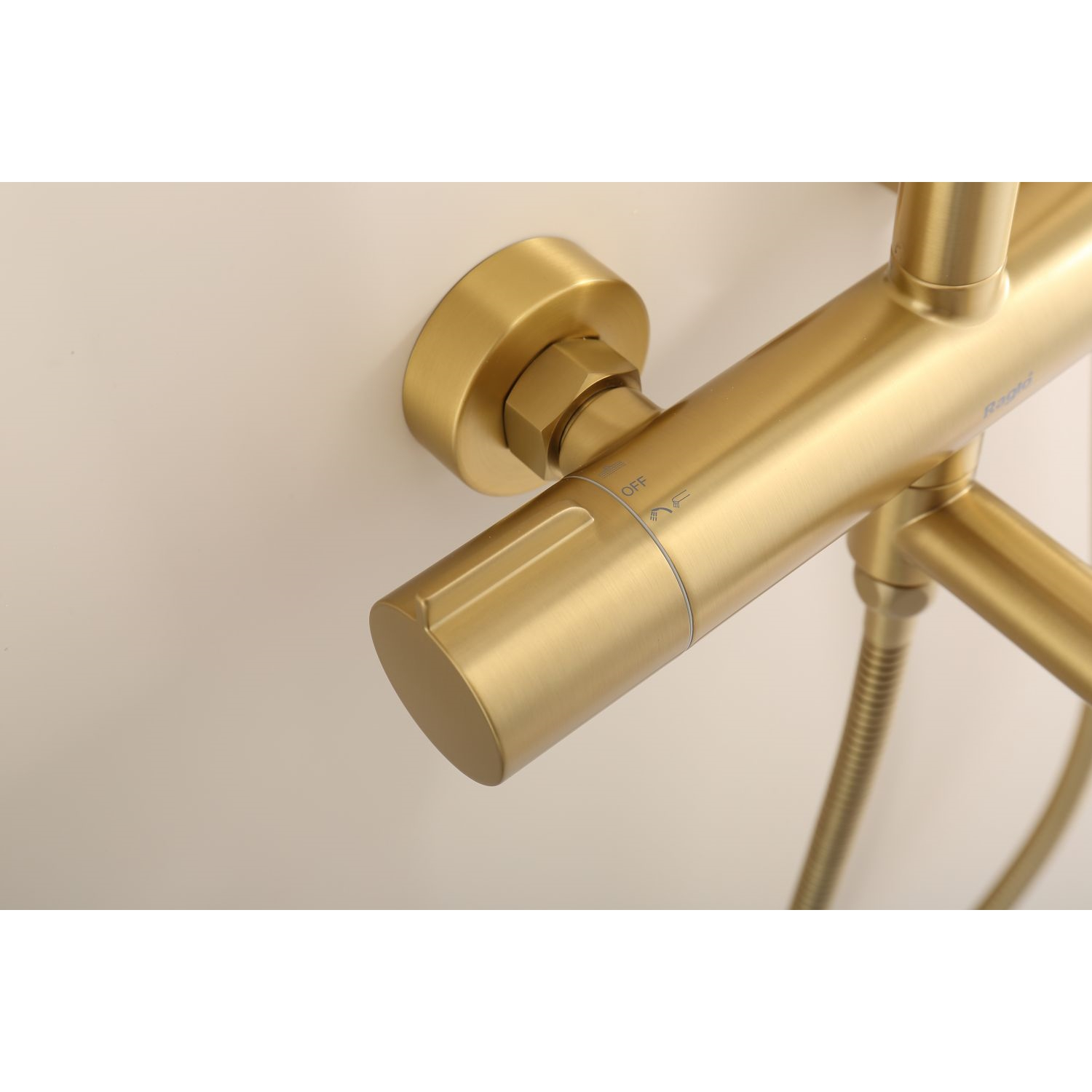 Душевая система Raglo R20.24.03. Цвет: сатин золотой. Материал: латунь. Управление: однорычажное. Механизм: керамический картридж. Излив: поворотный. Аэратор. Регулируемая по высоте душевая штанга: 1130-1480 мм. Форма верхнего душа: круглая. Диаметр верхнего душа: 250 мм. Регулируемый по высоте и наклону держатель ручного душа. Форма ручного душа: круглая. Количество режимов струи ручного душа: 3. Отверстия для монтажа: 3. Стандарт подводки: G 1/2. Монтаж: на стену.