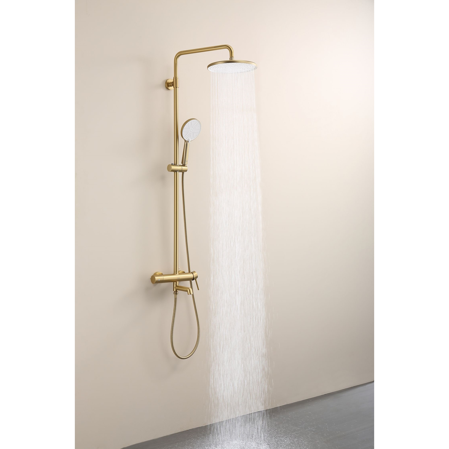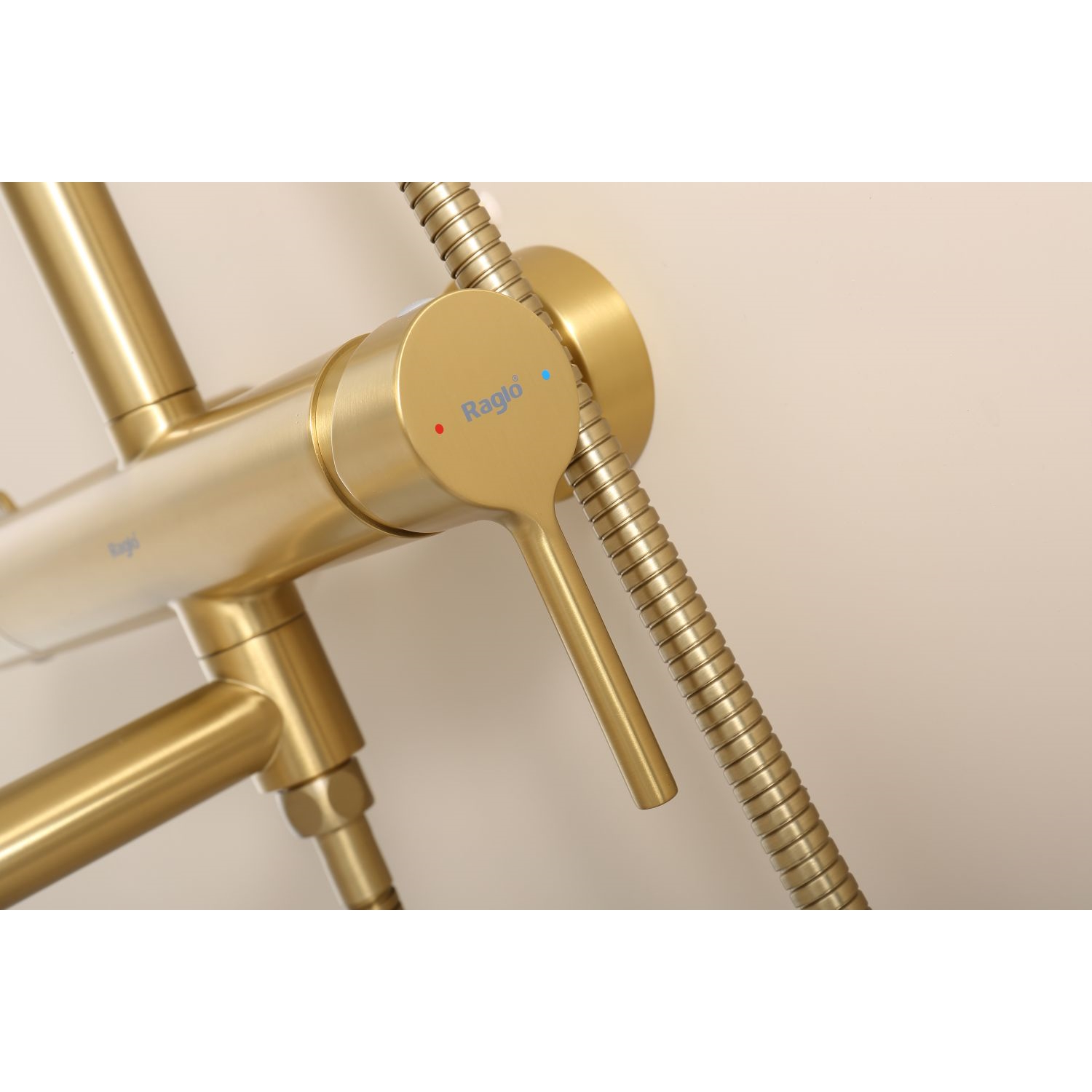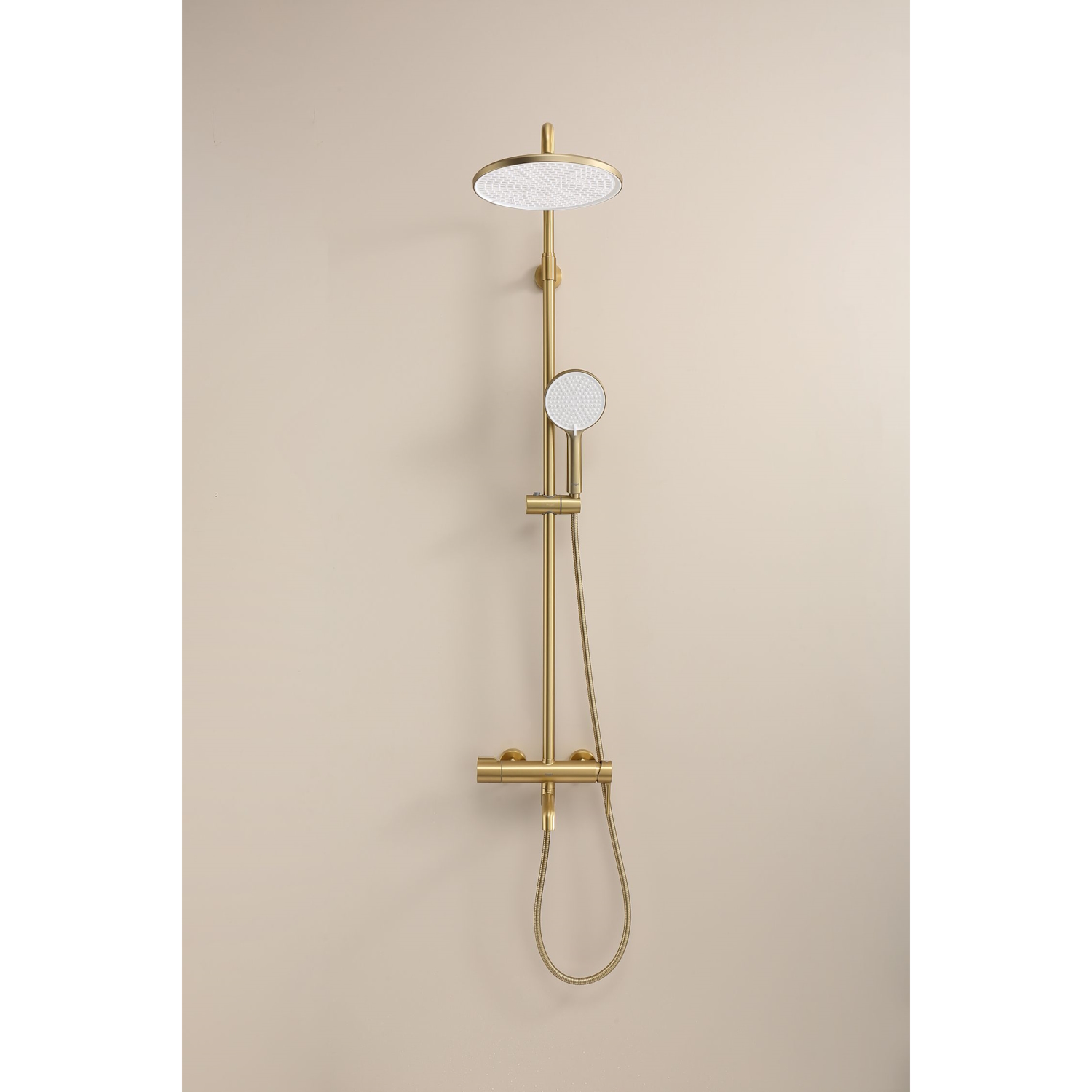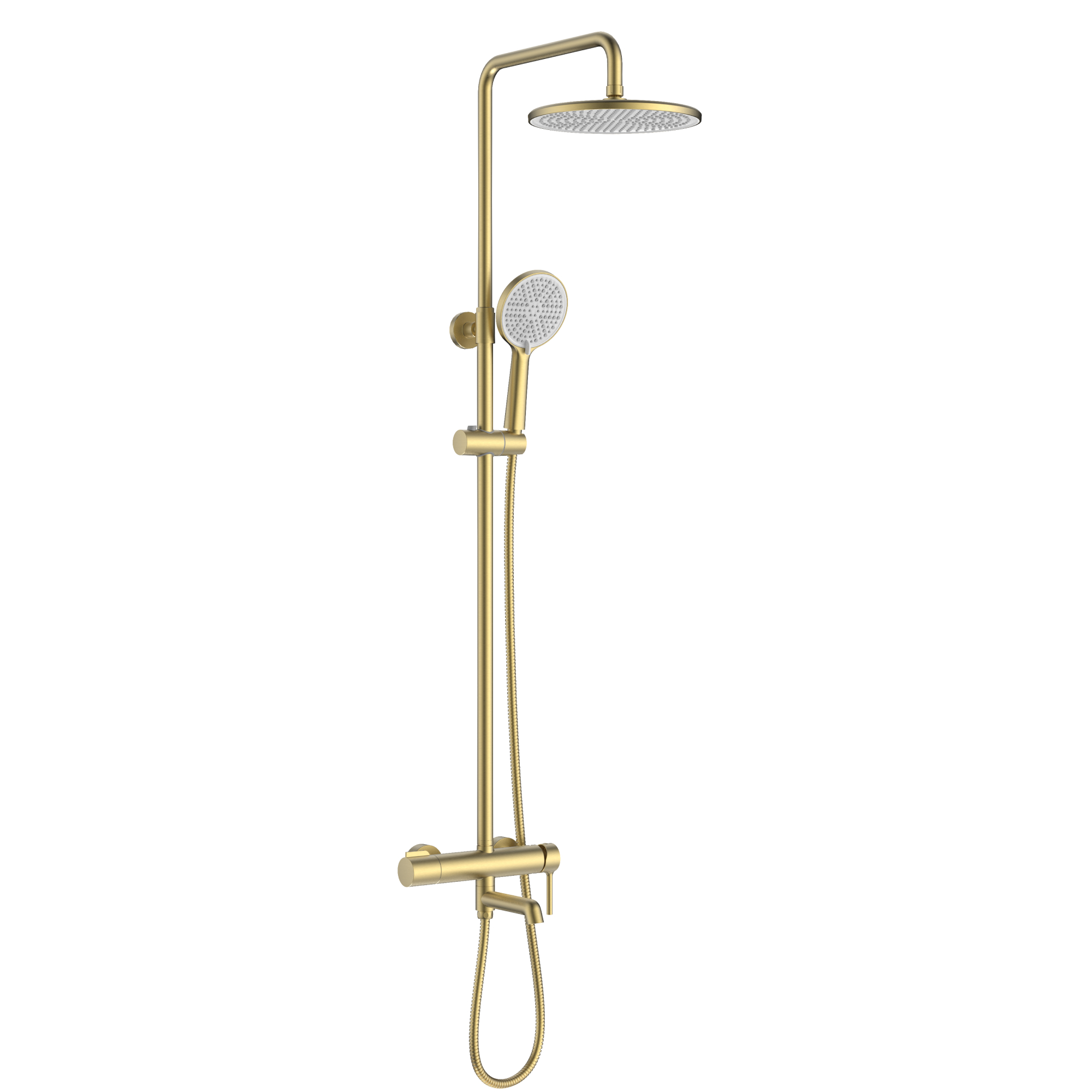 Душевая система Raglo R20.24.03. Цвет: сатин золотой. Материал: латунь. Управление: однорычажное. Механизм: керамический картридж. Излив: поворотный. Аэратор. Регулируемая по высоте душевая штанга: 1130-1480 мм. Форма верхнего душа: круглая. Диаметр верхнего душа: 250 мм. Регулируемый по высоте и наклону держатель ручного душа. Форма ручного душа: круглая. Количество режимов струи ручного душа: 3. Отверстия для монтажа: 3. Стандарт подводки: G 1/2. Монтаж: на стену.