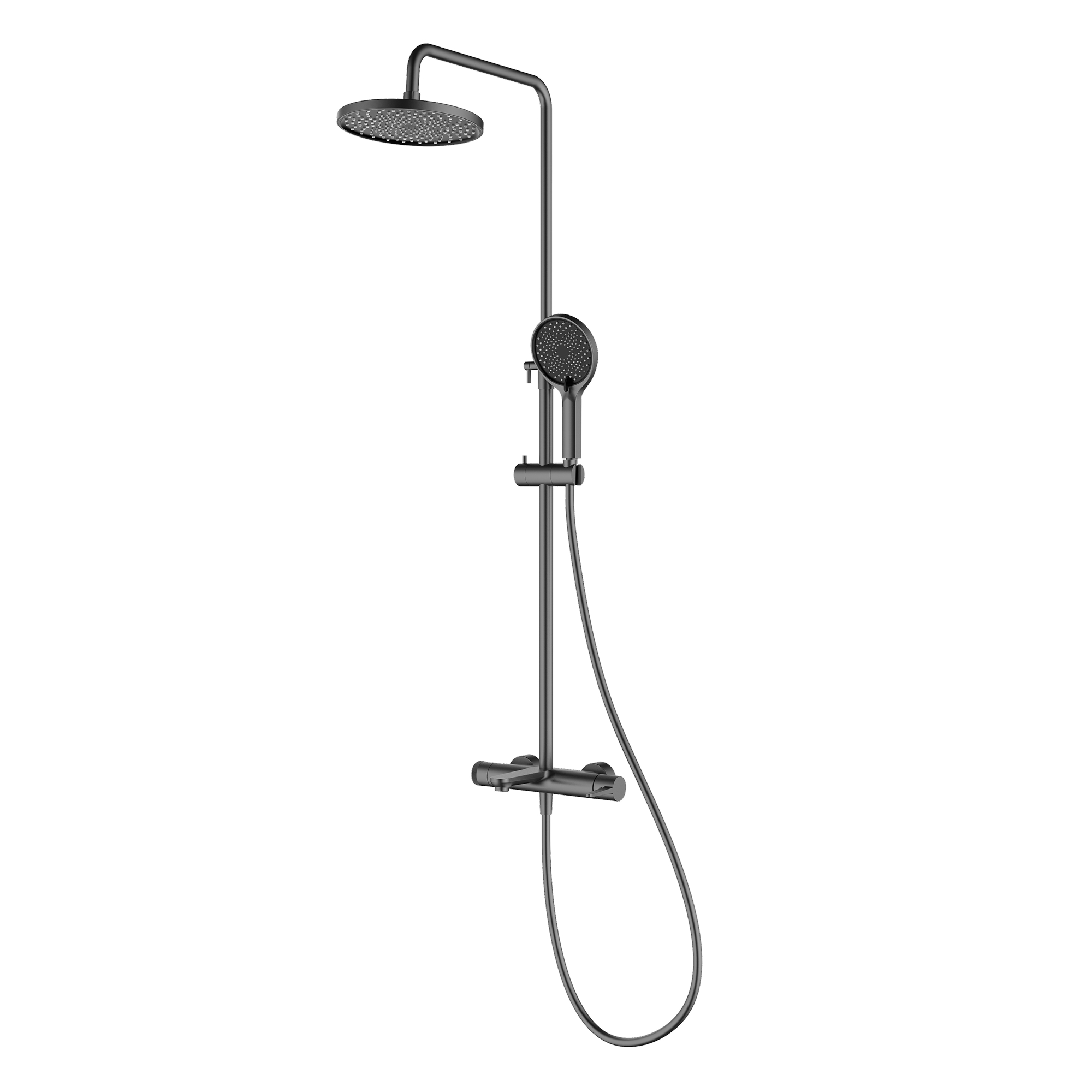 Душевая система Raglo R32.24.09. Цвет: графит. Материал: латунь. Управление: однорычажное. Механизм: керамический картридж. Излив: фиксированный. Аэратор. Регулируемая по высоте душевая штанга: 635-1285 мм. Форма верхнего душа: круглая. Диаметр верхнего душа: 225 мм. Регулируемый по высоте держатель ручного душа. Высота ручного душа: 240 мм. Количество режимов струи ручного душа: 3. Переключение режимов ручного душа: флажковое. Отверстия для монтажа: 3. Стандарт подводки: G 1/2. Монтаж: на стену.