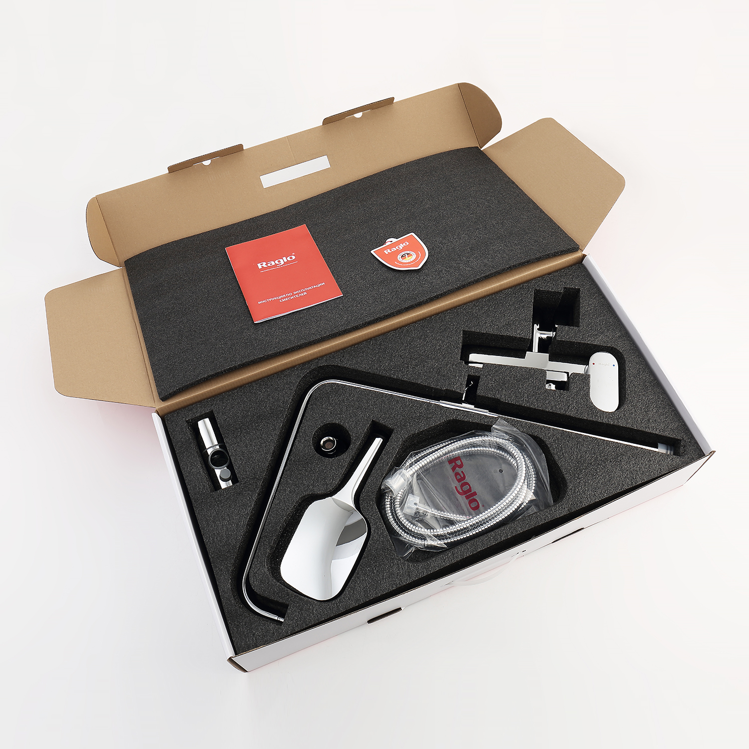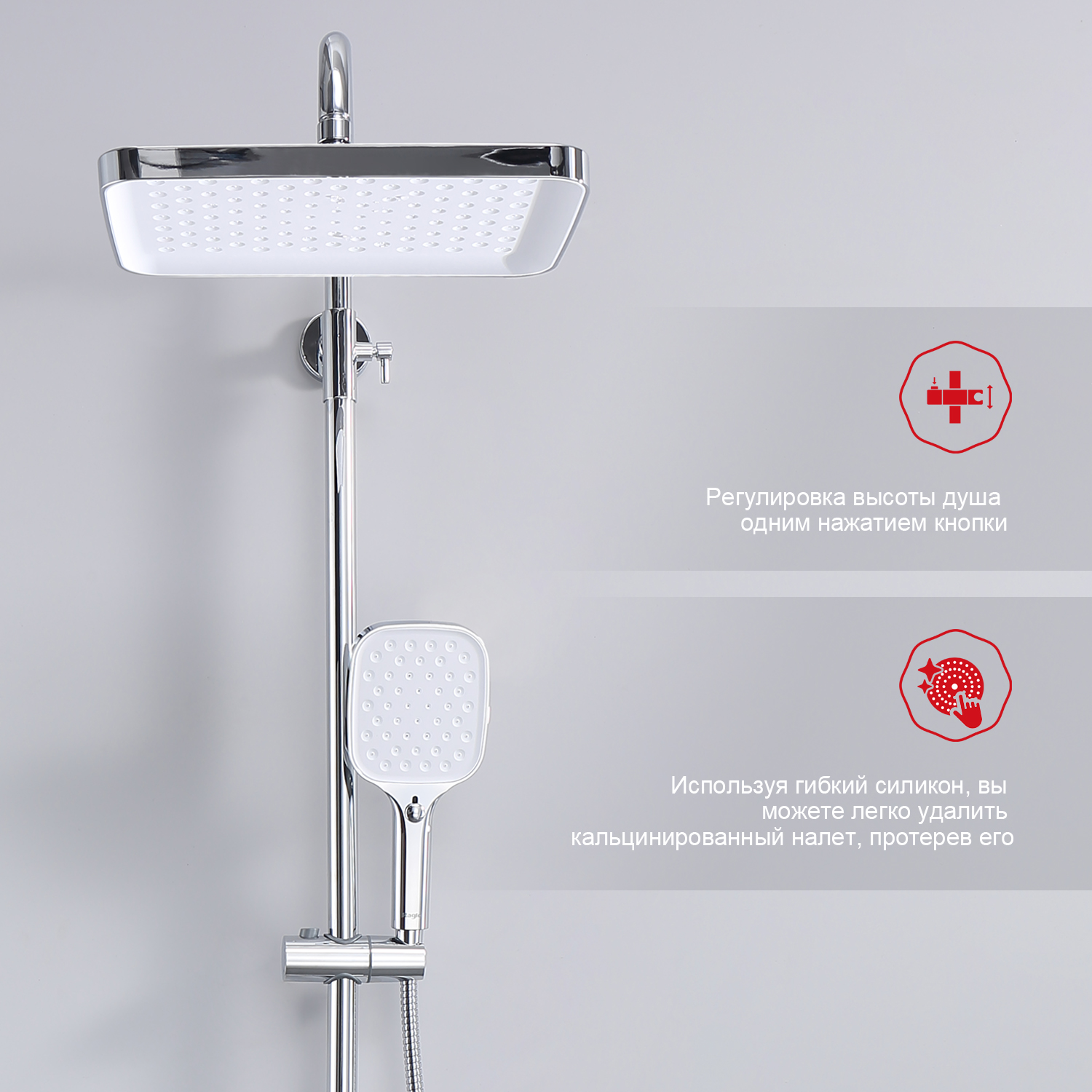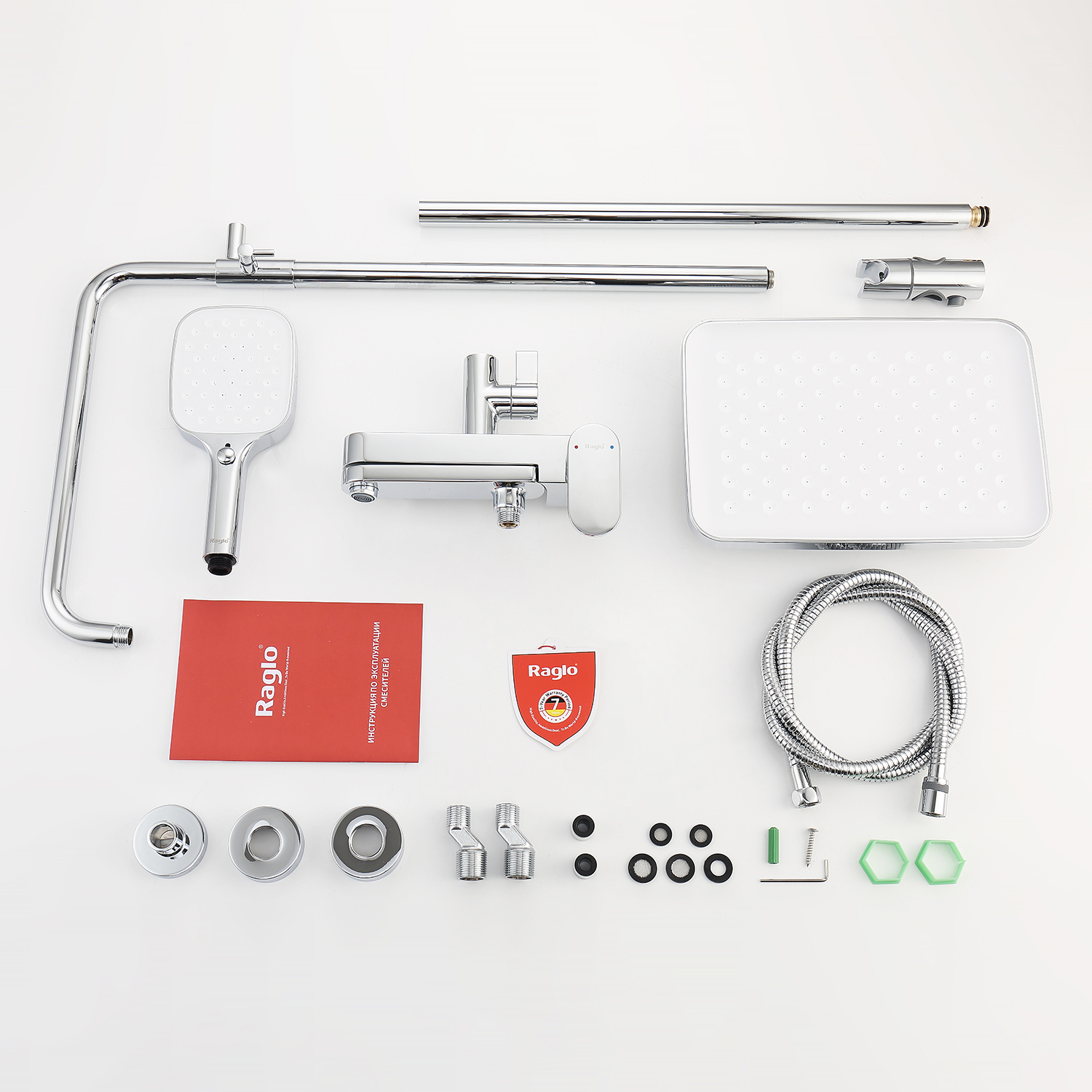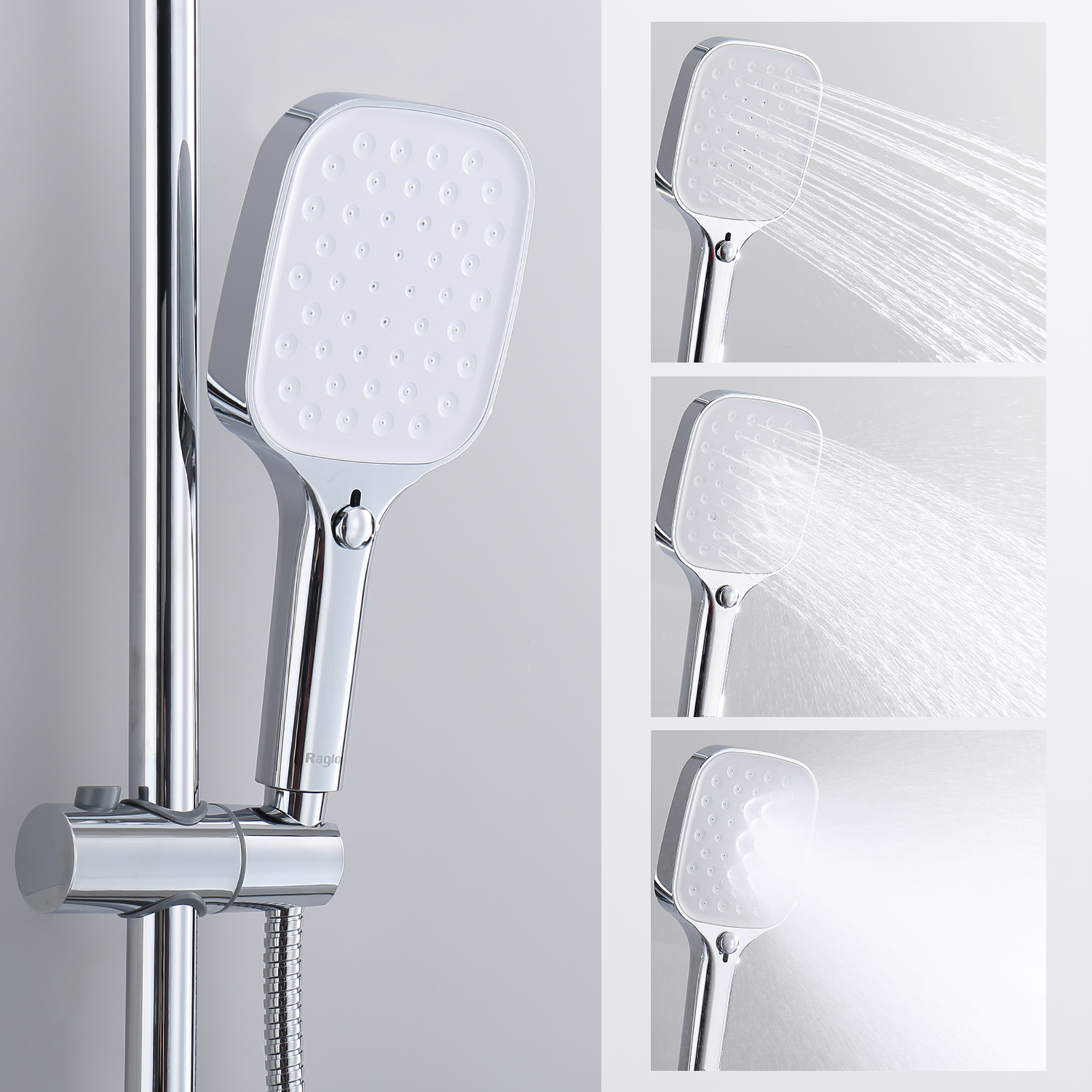 Душевая система Raglo R50.24. Цвет: хром. Материал: латунь. Управление: однорычажное. Механизм: керамический картридж. Излив: поворотный. Аэратор. Регулируемая по высоте душевая штанга: 1225-1675 мм. Форма верхнего душа: прямоугольная. Размер верхнего душа 312х212 мм. Регулируемый по высоте держатель ручного душа. Количество режимов струи ручного душа: 3. Отверстия для монтажа: 3. Стандарт подводки: G 1/2. Монтаж: на стену.