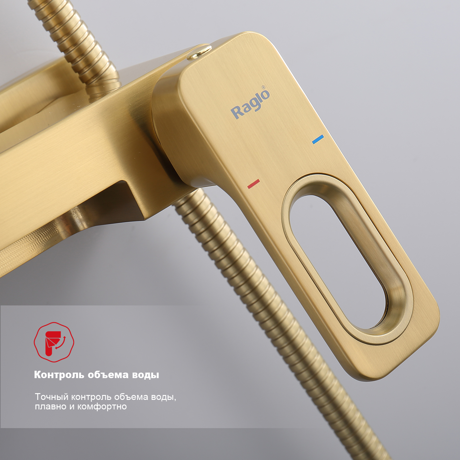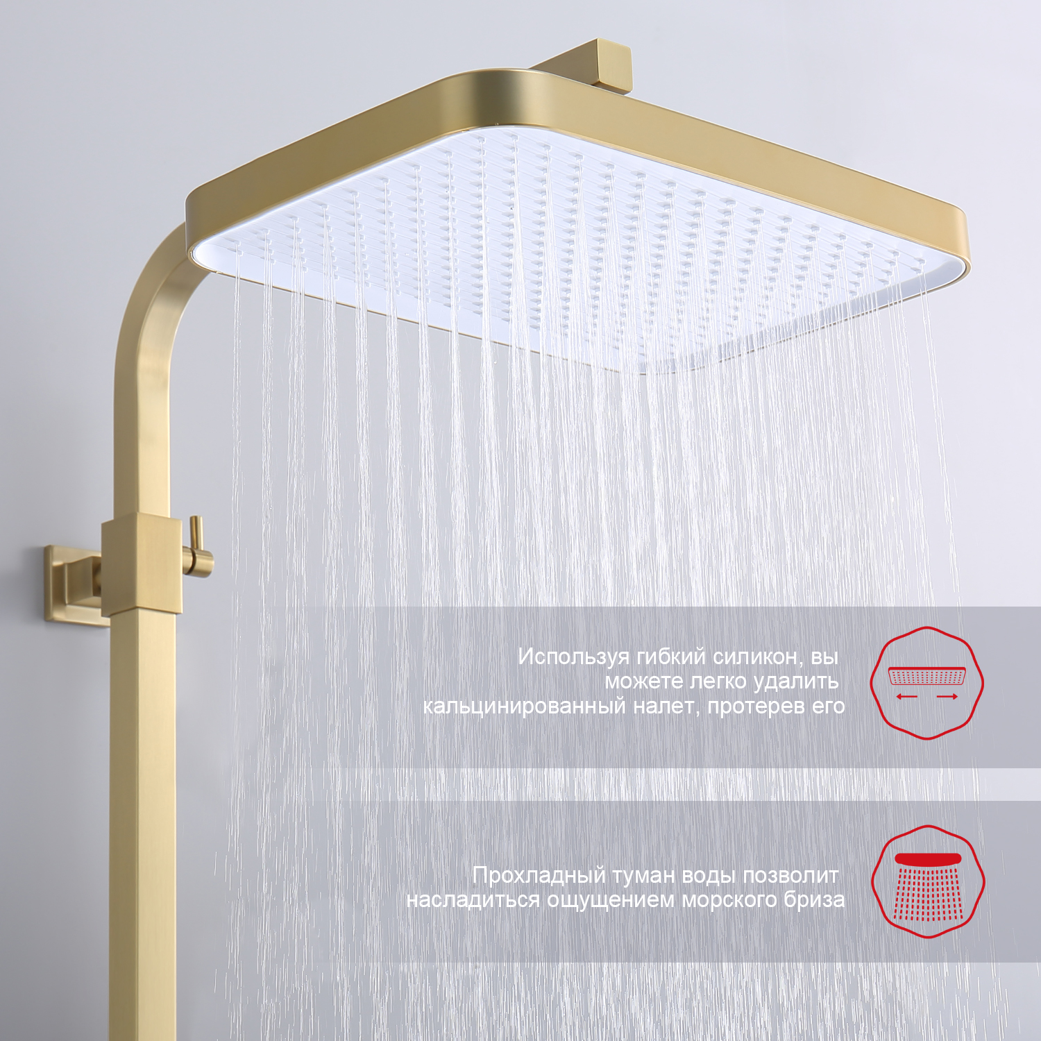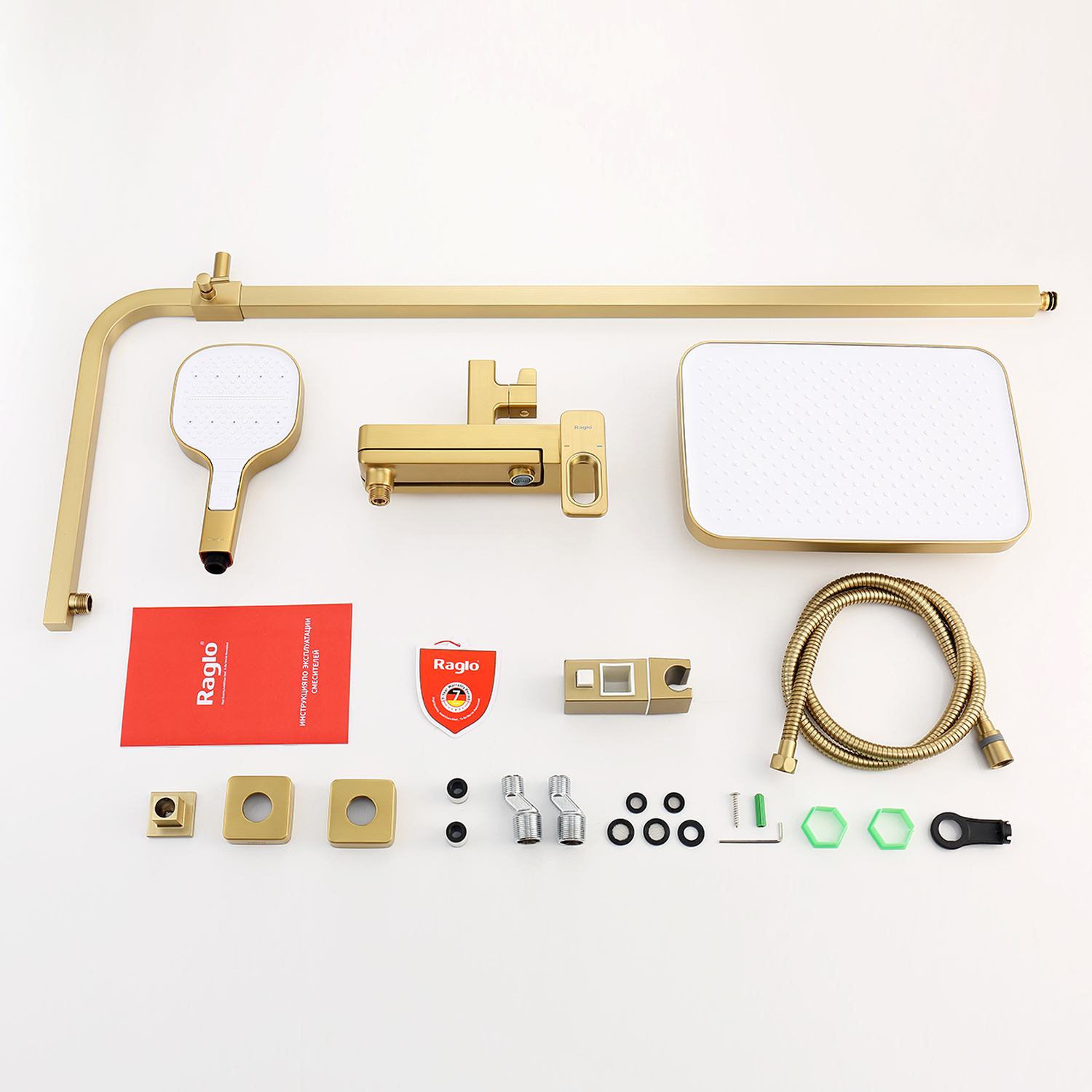 Душевая система Raglo R51.24.03. Цвет: сатин золотой. Материал: латунь. Управление: однорычажное. Механизм: керамический картридж. Излив: поворотный. Аэратор. Регулируемая по высоте душевая штанга: 1087-1655 мм. Форма верхнего душа: прямоугольная. Размер верхнего душа (ШхД): 330х220 мм. Регулируемый по высоте и наклону держатель ручного душа. Количество режимов струи ручного душа: 4. Отверстия для монтажа: 3. Стандарт подводки: G 1/2. Монтаж: на стену.