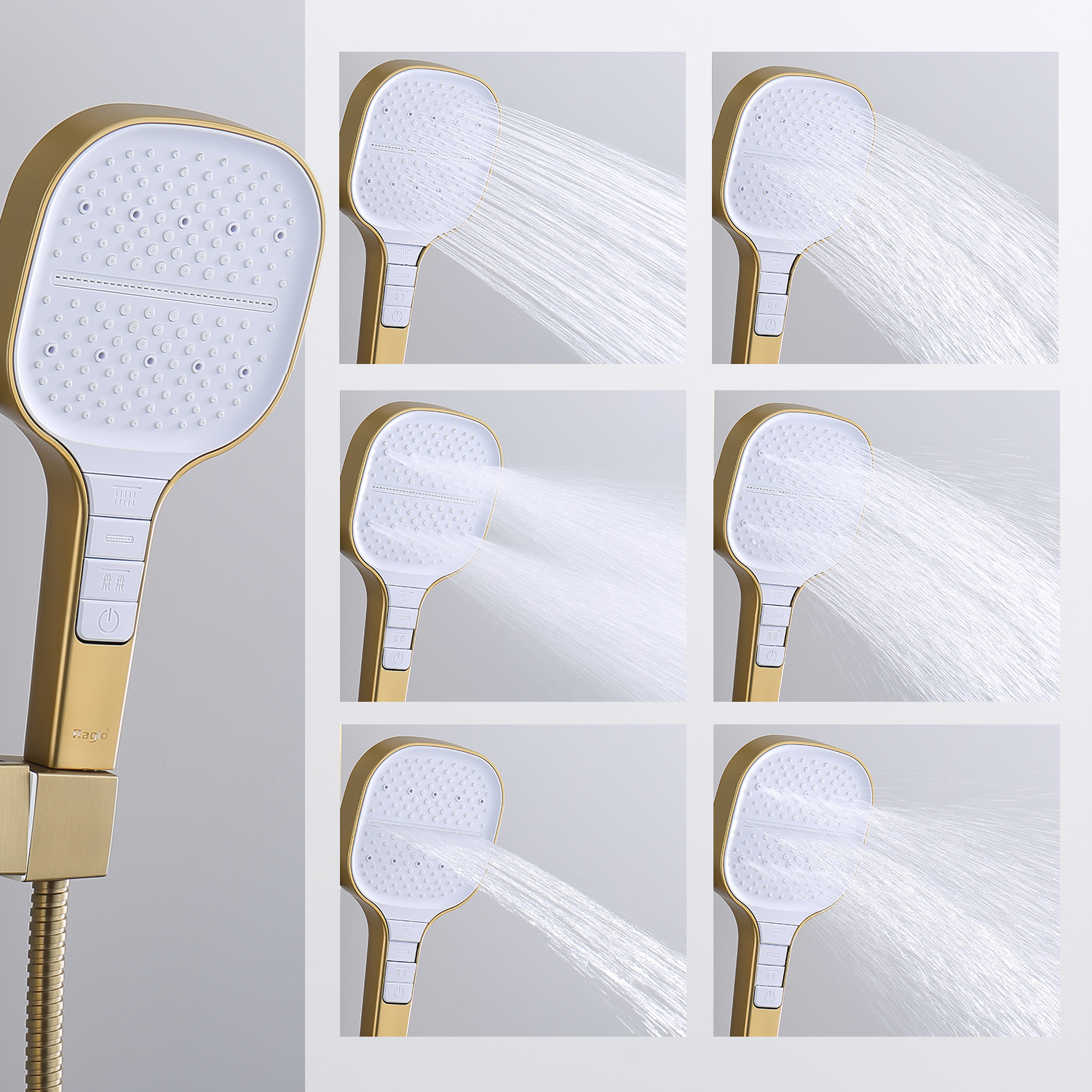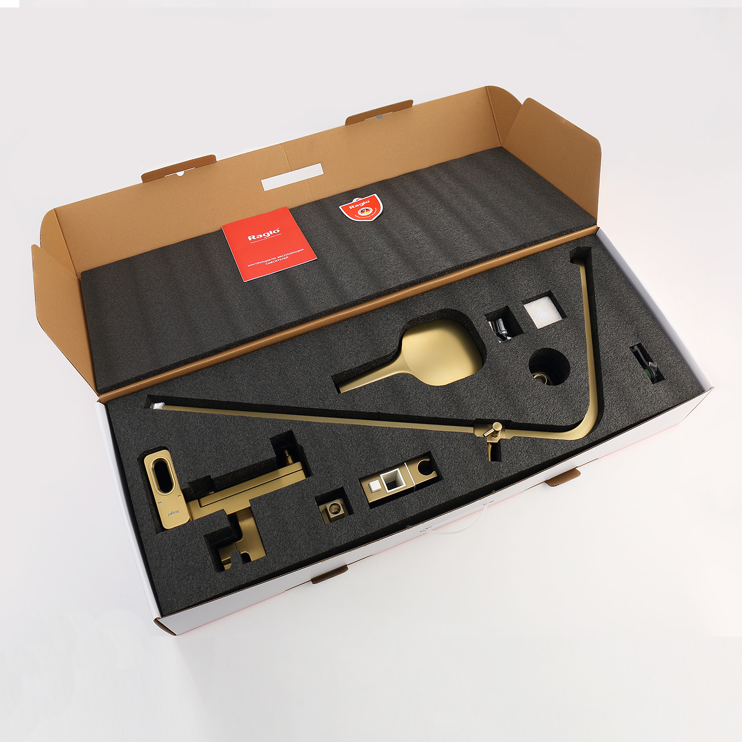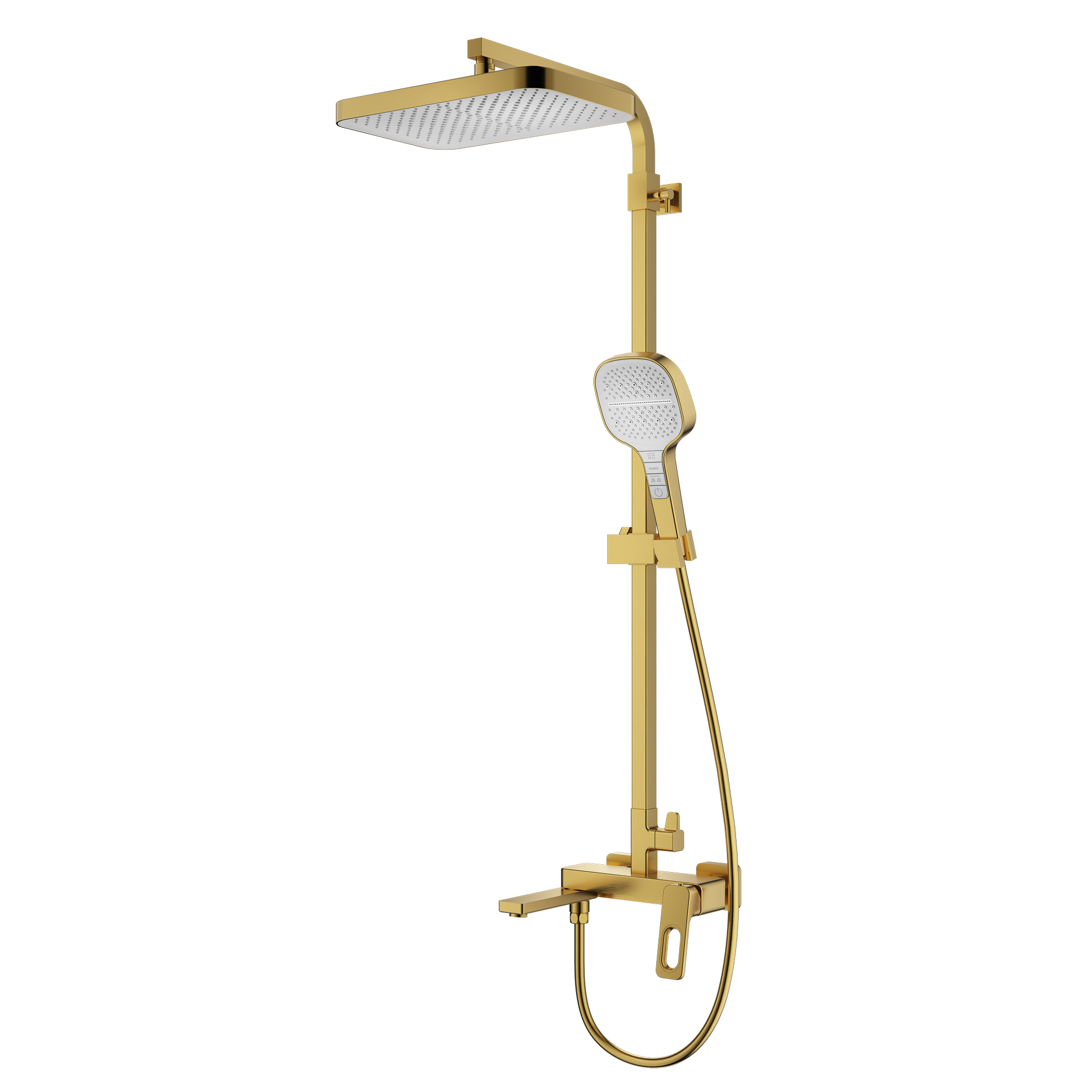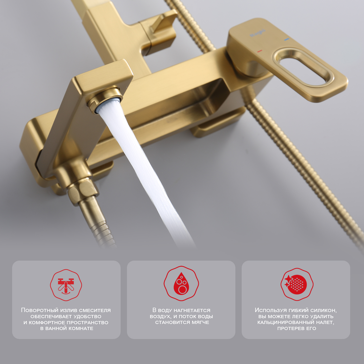 Душевая система Raglo R51.24.03. Цвет: сатин золотой. Материал: латунь. Управление: однорычажное. Механизм: керамический картридж. Излив: поворотный. Аэратор. Регулируемая по высоте душевая штанга: 1087-1655 мм. Форма верхнего душа: прямоугольная. Размер верхнего душа (ШхД): 330х220 мм. Регулируемый по высоте и наклону держатель ручного душа. Количество режимов струи ручного душа: 4. Отверстия для монтажа: 3. Стандарт подводки: G 1/2. Монтаж: на стену.