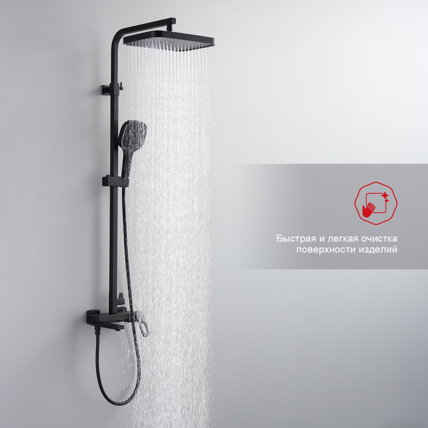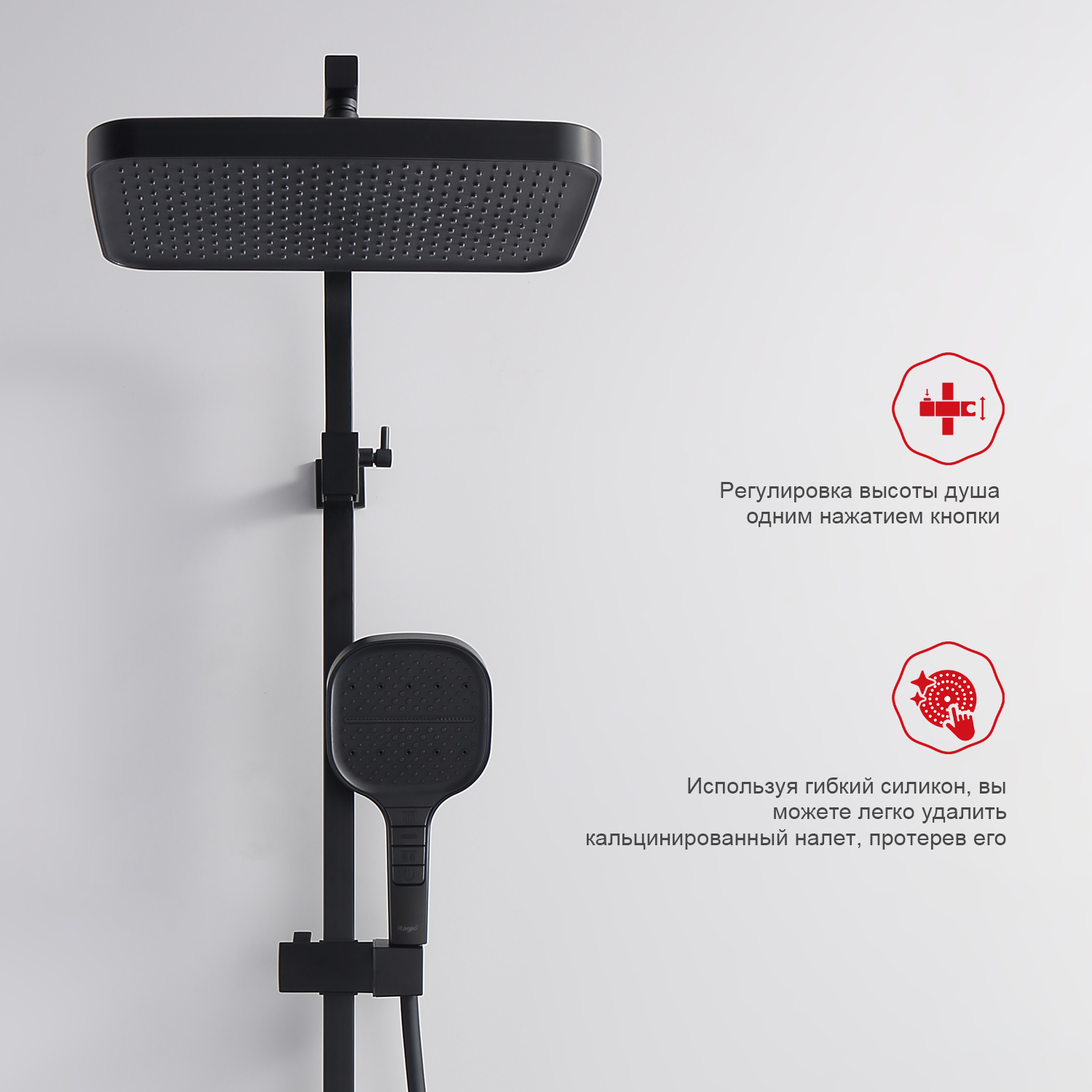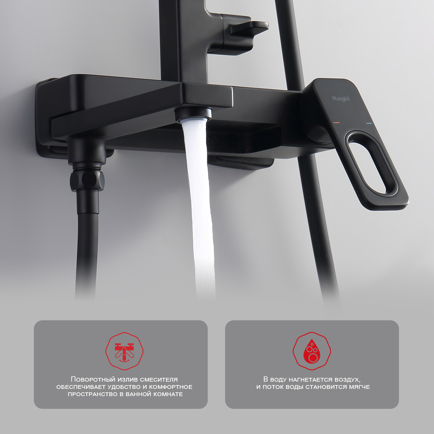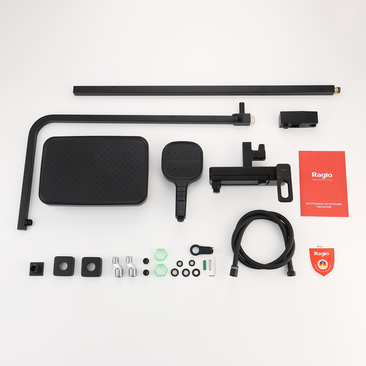 Душевая система Raglo R51.24.06. Цвет: черный. Материал: латунь. Управление: однорычажное. Механизм: керамический картридж. Излив: поворотный. Аэратор. Регулируемая по высоте душевая штанга: 1087-1655 мм. Форма верхнего душа: прямоугольная. Размер верхнего душа (ШхД): 330х220 мм. Регулируемый по высоте и наклону держатель ручного душа. Количество режимов струи ручного душа: 4. Отверстия для монтажа: 3. Стандарт подводки: G 1/2. Монтаж: на стену.