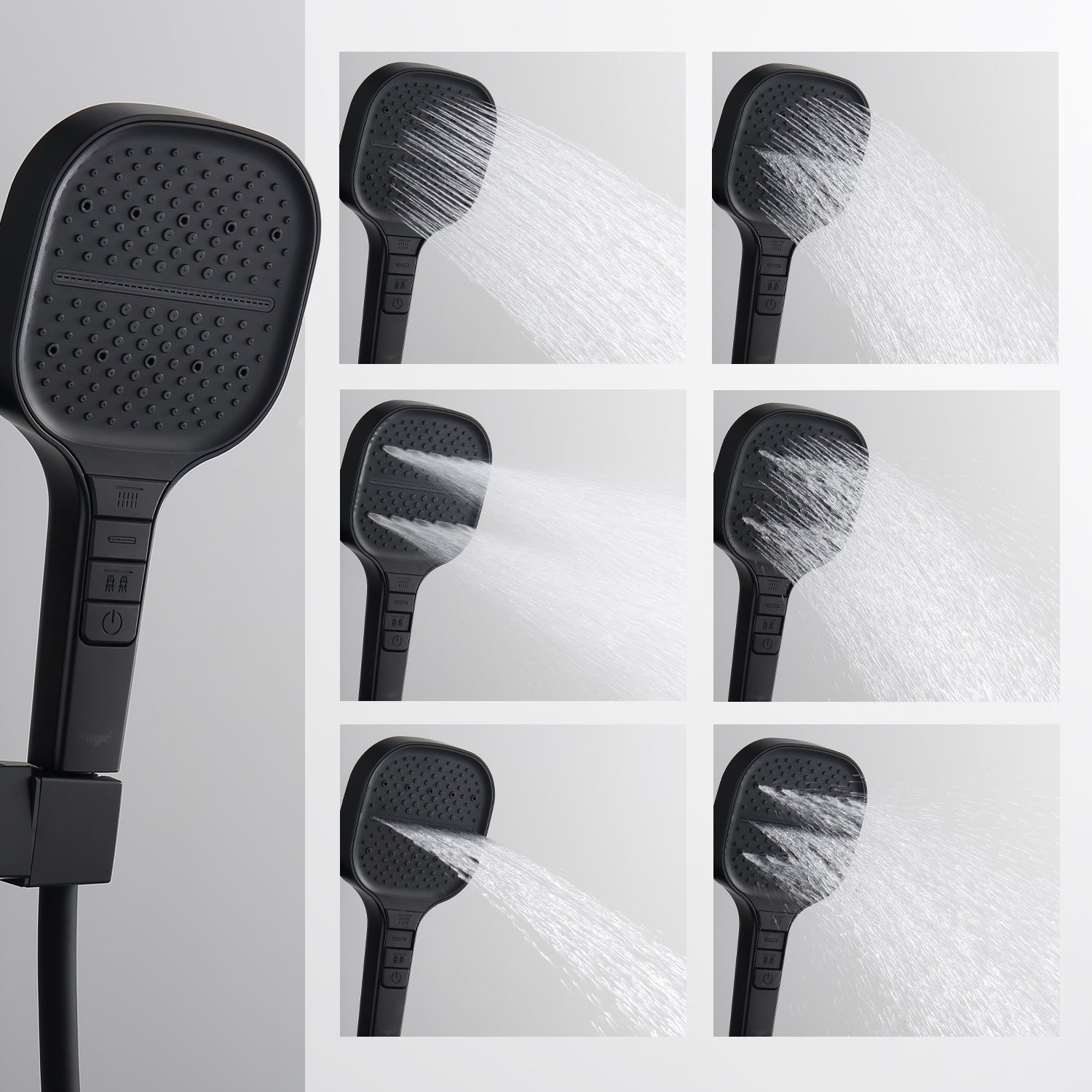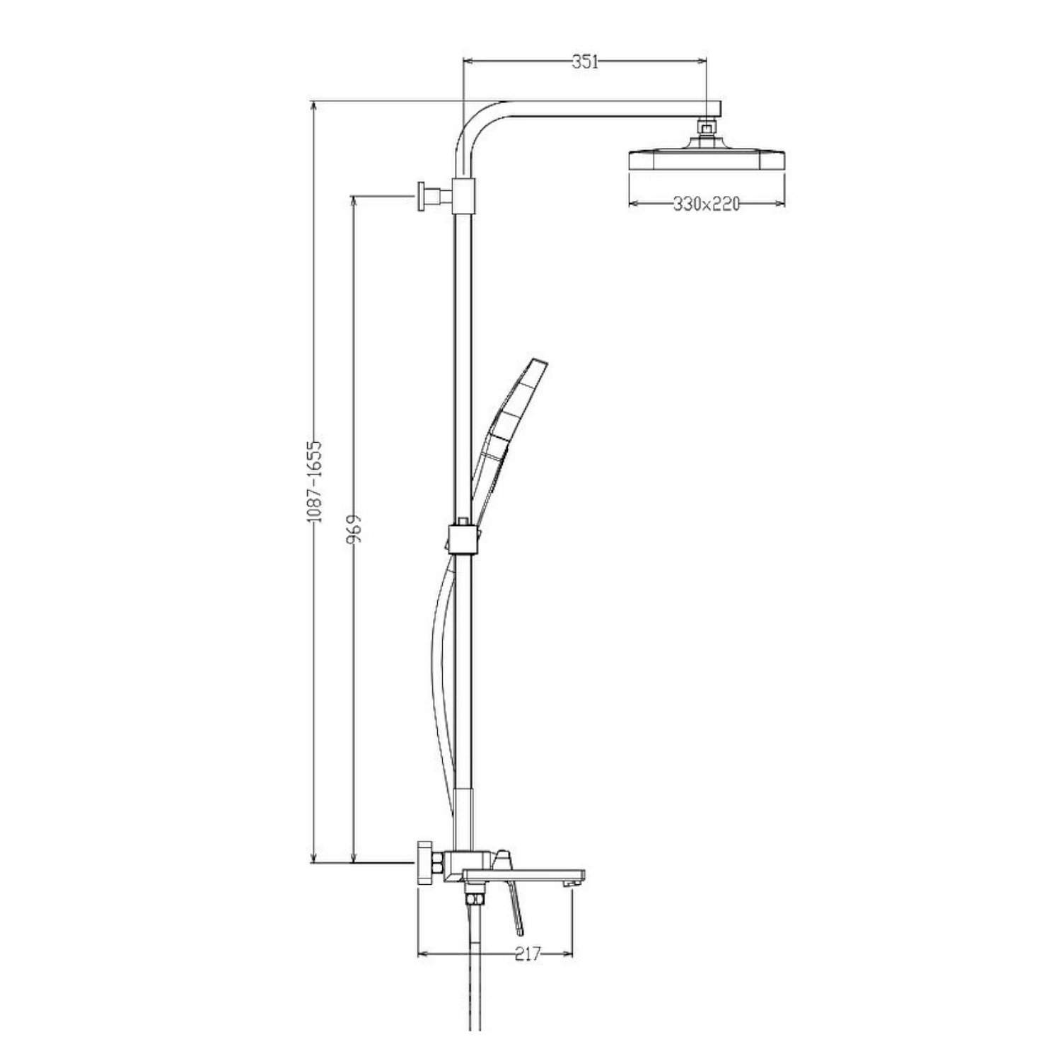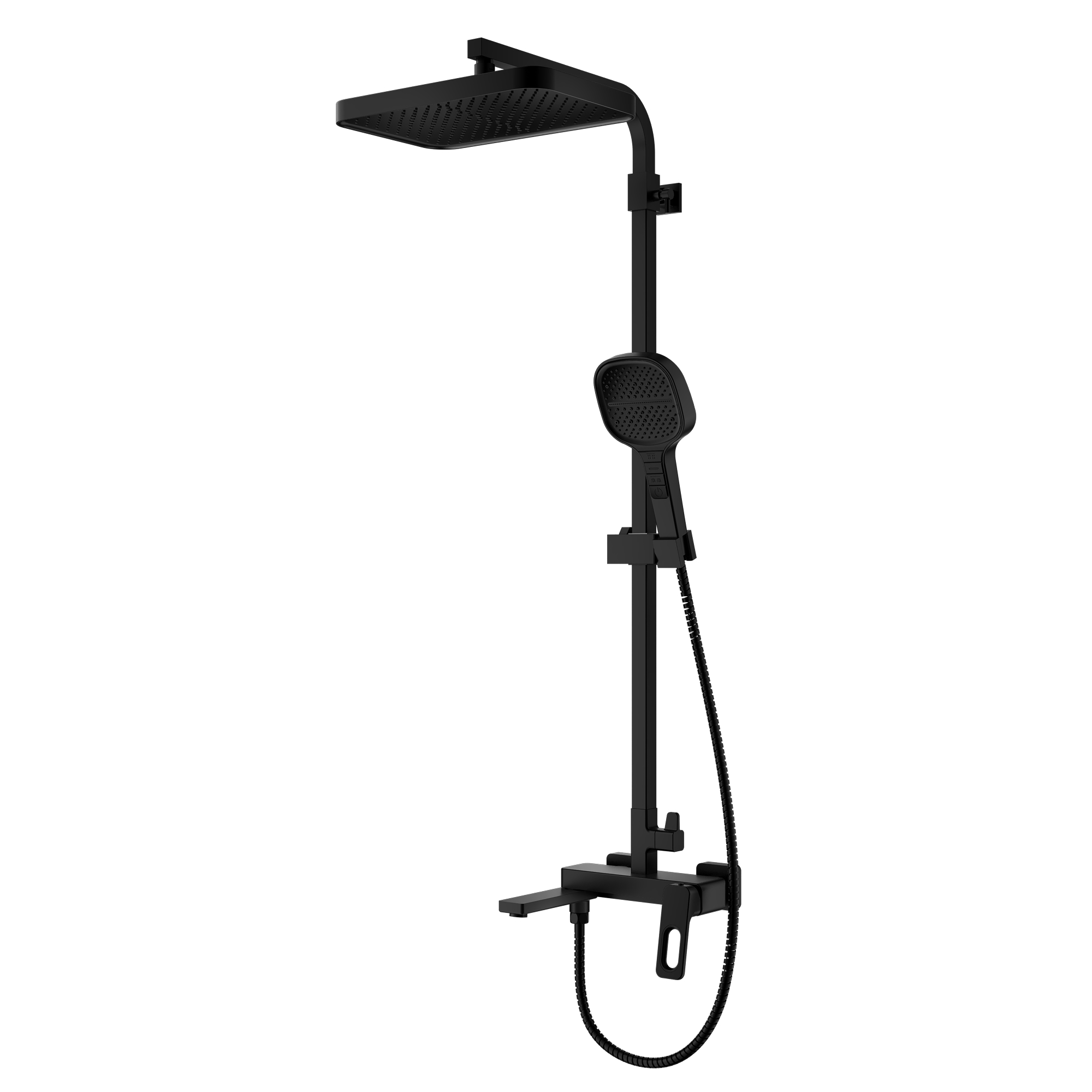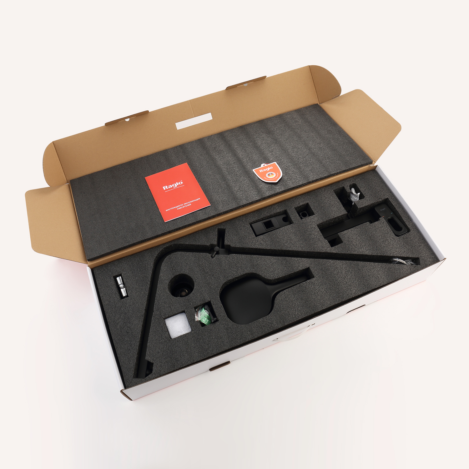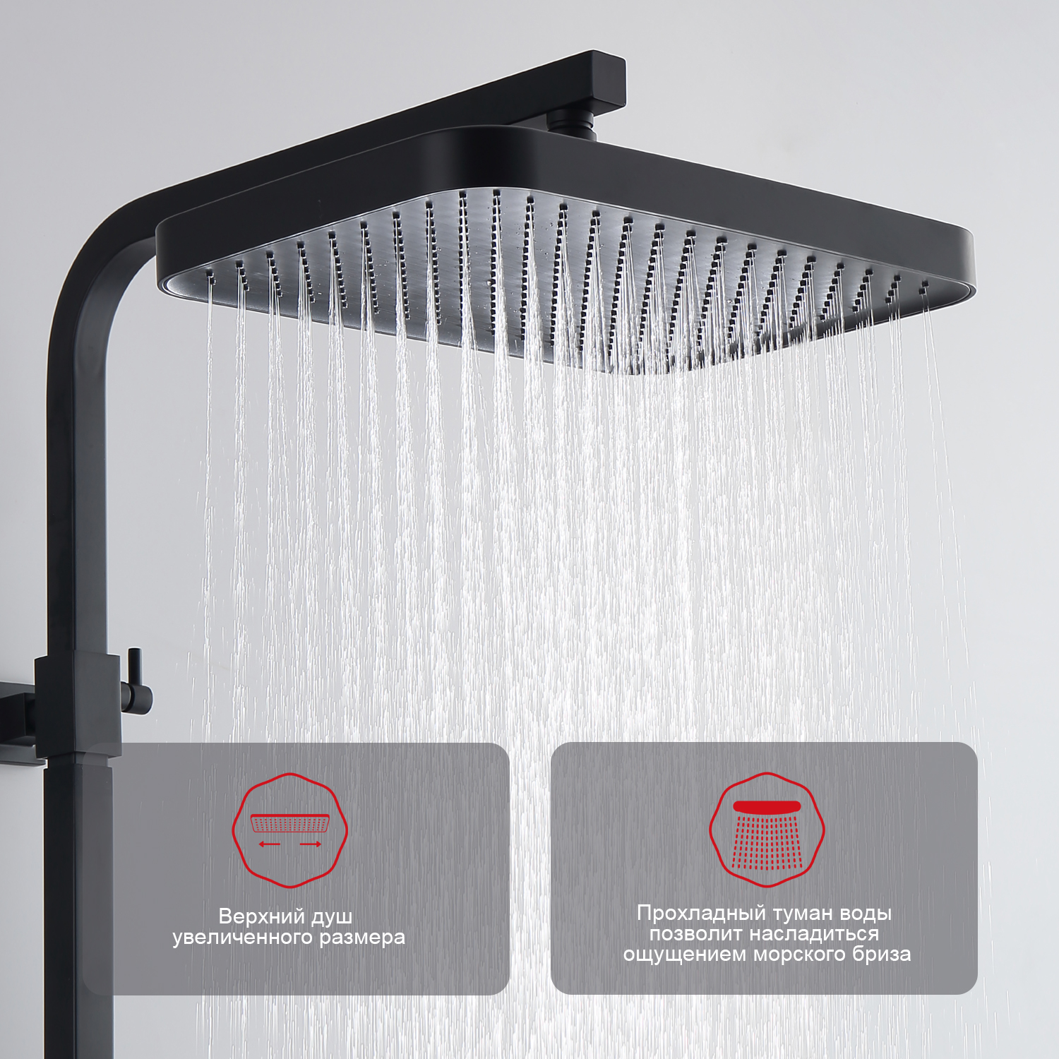 Душевая система Raglo R51.24.06. Цвет: черный. Материал: латунь. Управление: однорычажное. Механизм: керамический картридж. Излив: поворотный. Аэратор. Регулируемая по высоте душевая штанга: 1087-1655 мм. Форма верхнего душа: прямоугольная. Размер верхнего душа (ШхД): 330х220 мм. Регулируемый по высоте и наклону держатель ручного душа. Количество режимов струи ручного душа: 4. Отверстия для монтажа: 3. Стандарт подводки: G 1/2. Монтаж: на стену.