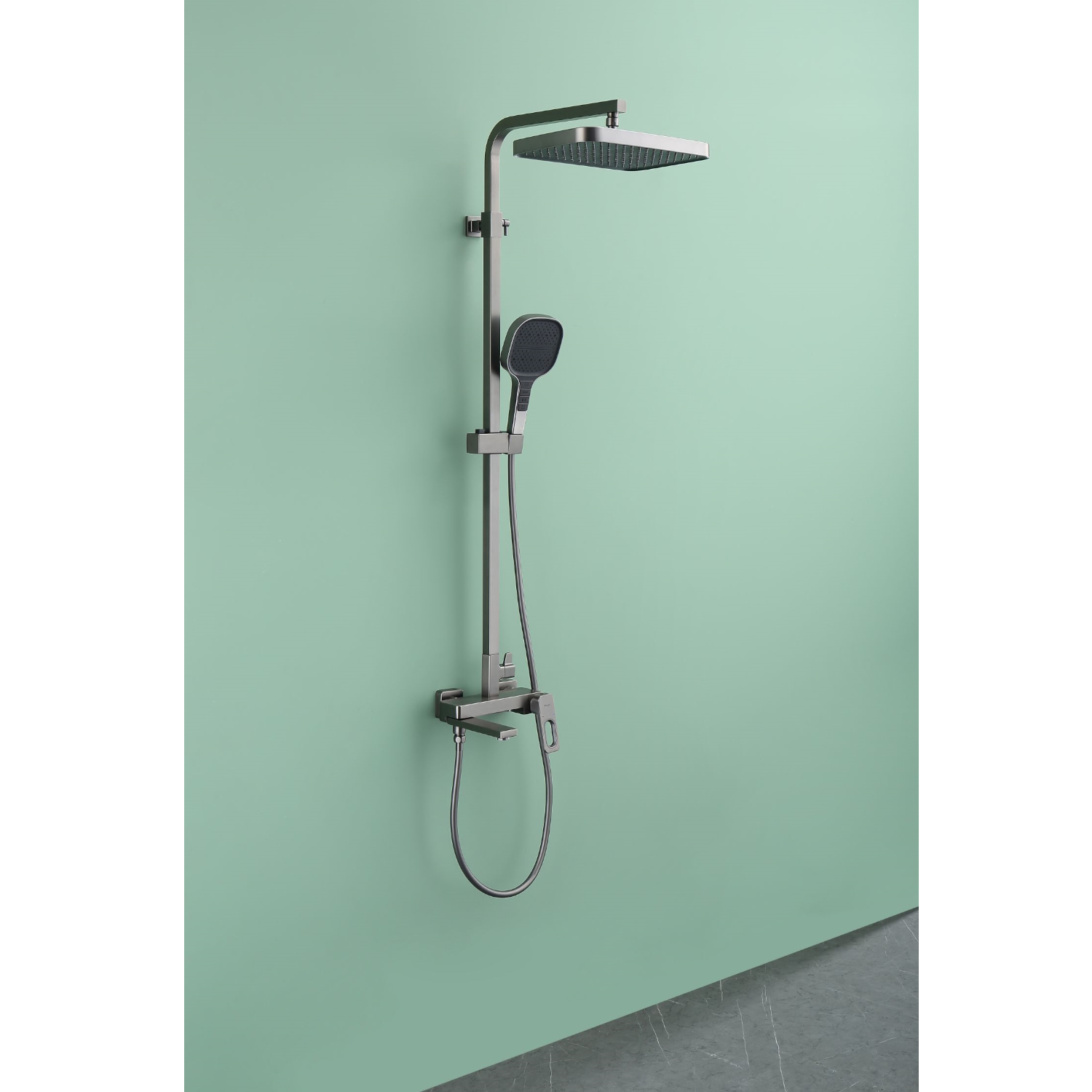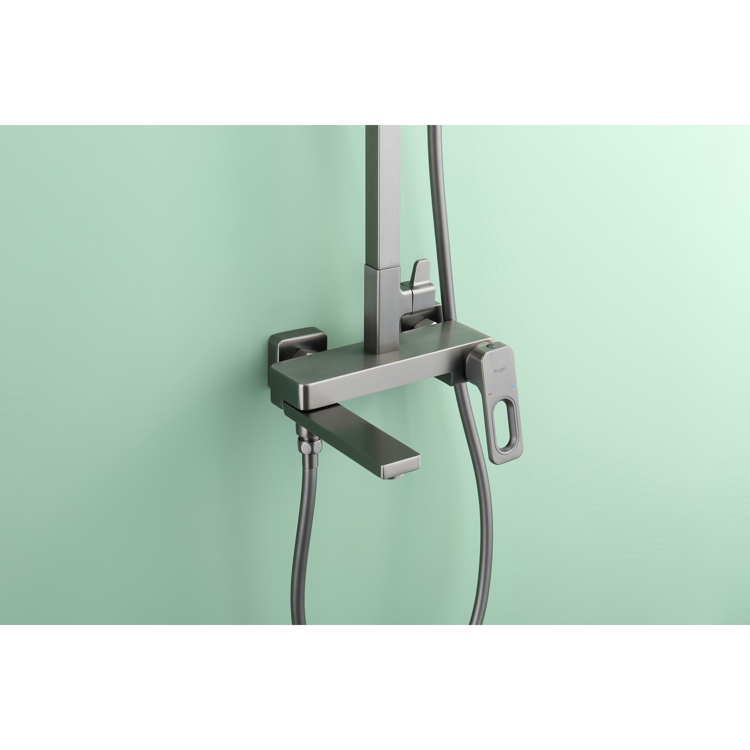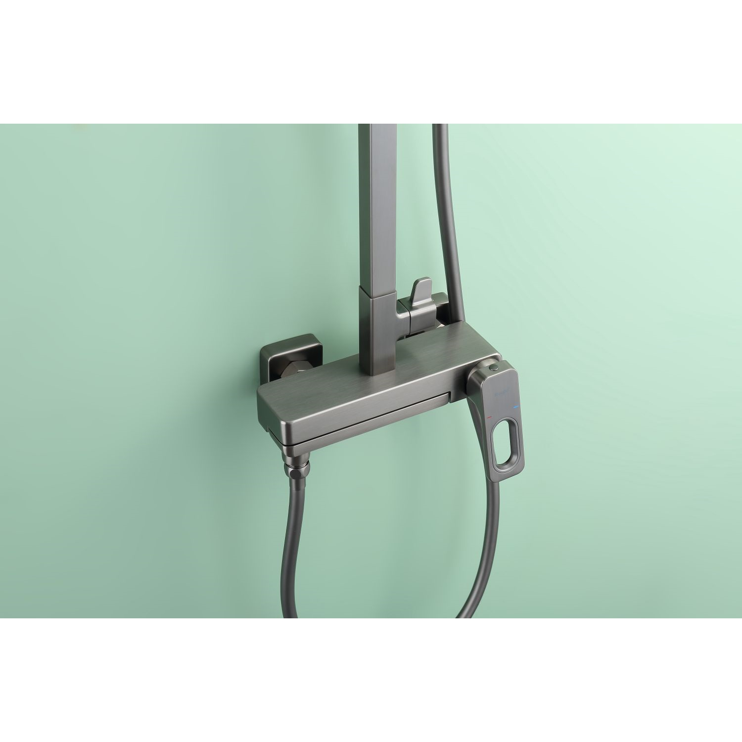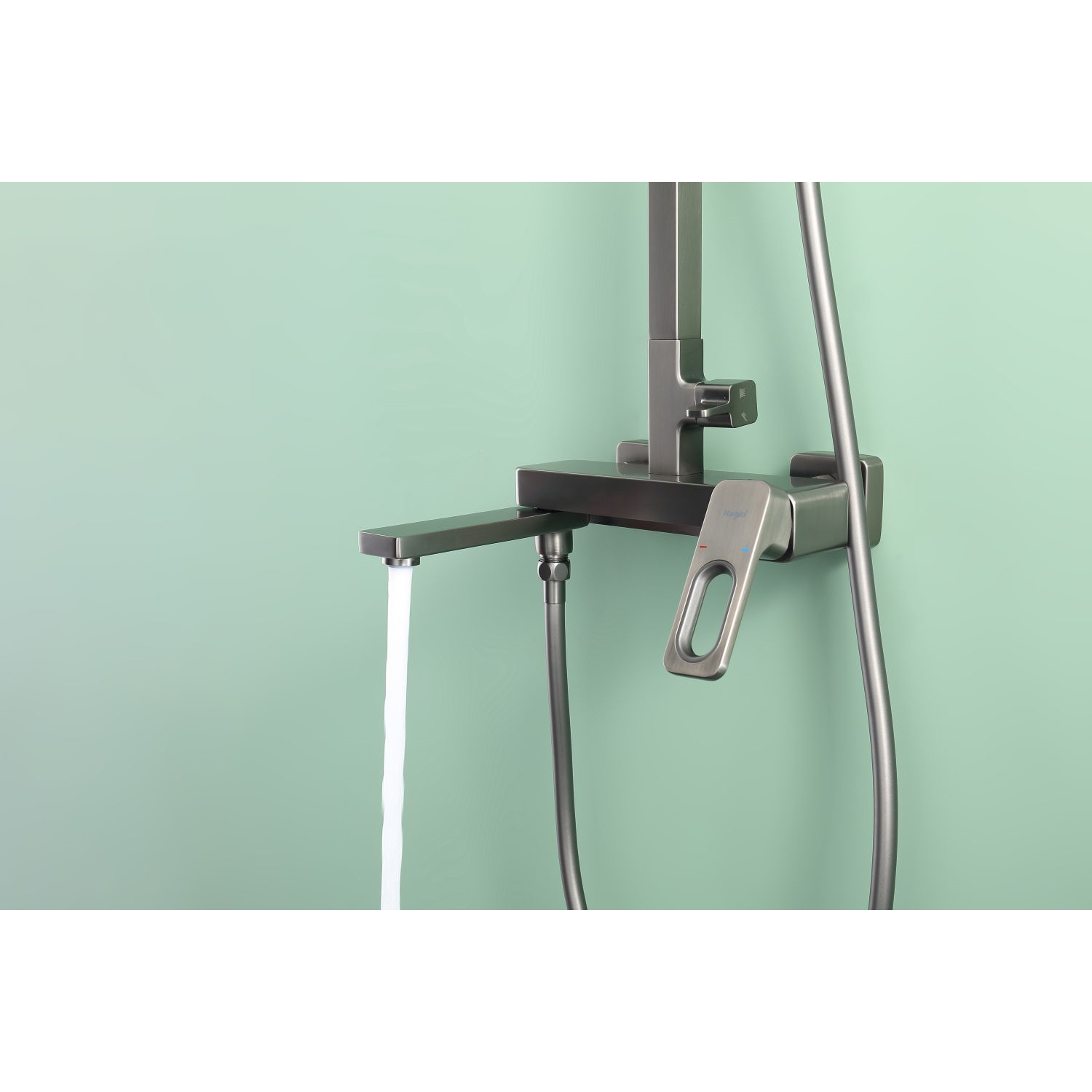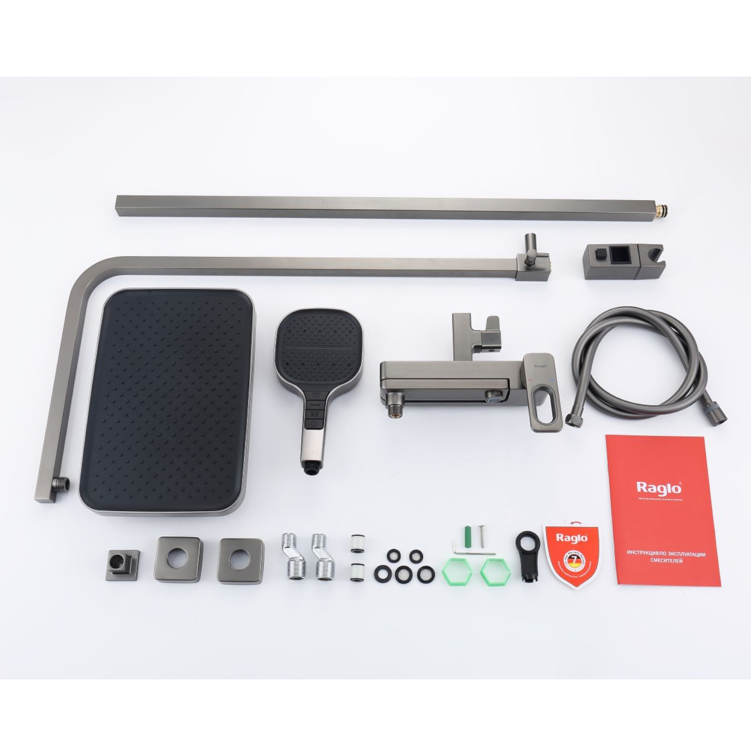 Душевая система Raglo R51.24.09. Цвет: графит. Материал: латунь. Управление: однорычажное. Механизм: керамический картридж. Излив: поворотный. Аэратор. Регулируемая по высоте душевая штанга: 1087-1655 мм. Форма верхнего душа: прямоугольная. Размер верхнего душа (ШхД): 330х220 мм. Регулируемый по высоте и наклону держатель ручного душа. Количество режимов струи ручного душа: 4. Отверстия для монтажа: 3. Стандарт подводки: G 1/2. Монтаж: на стену.