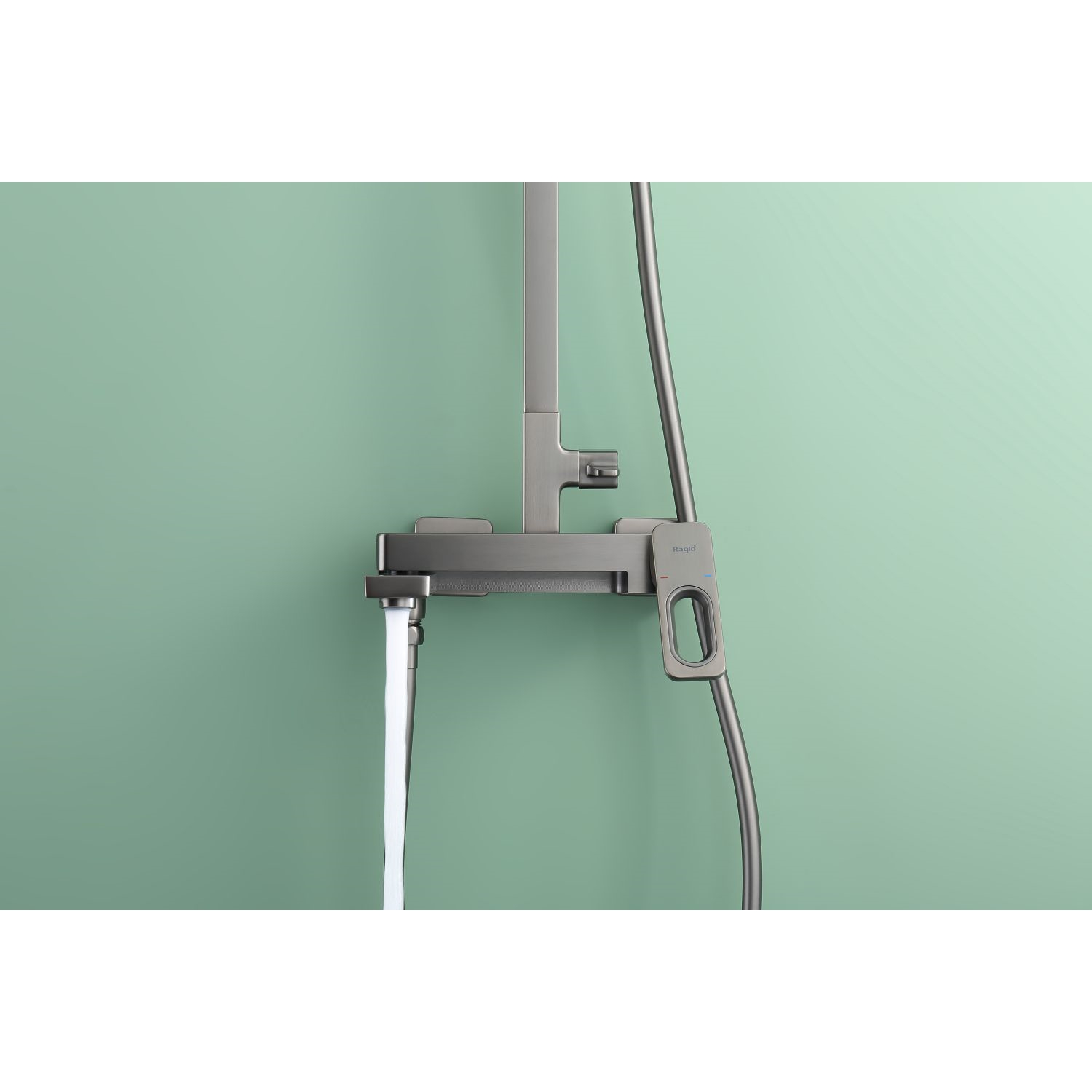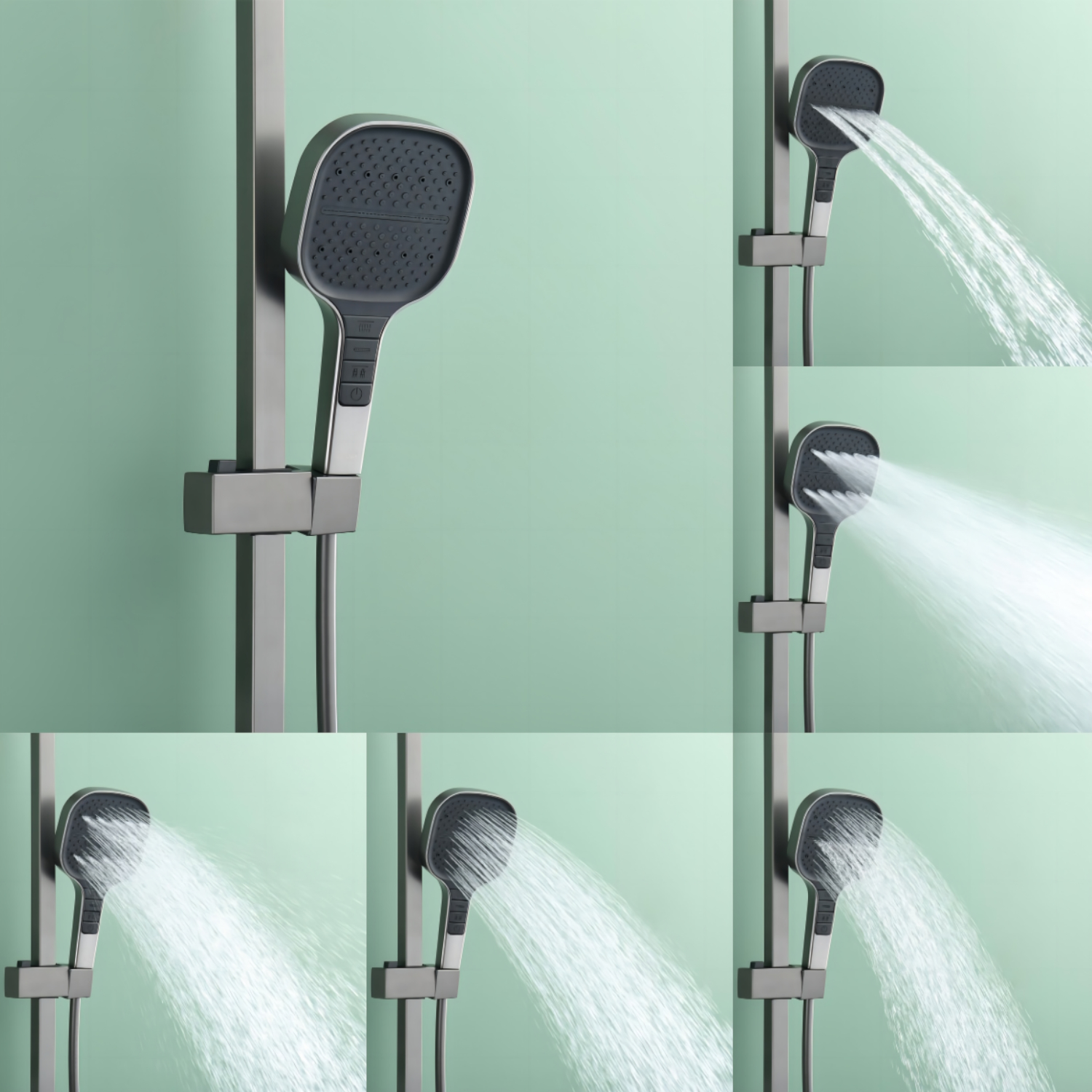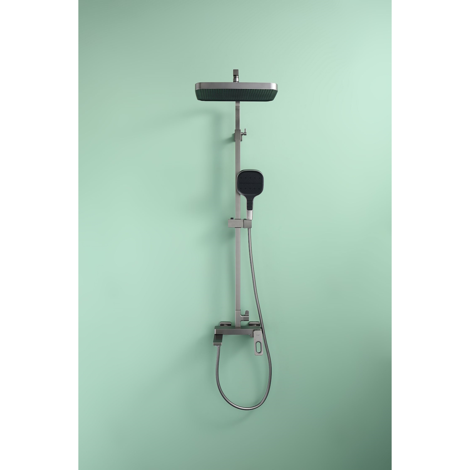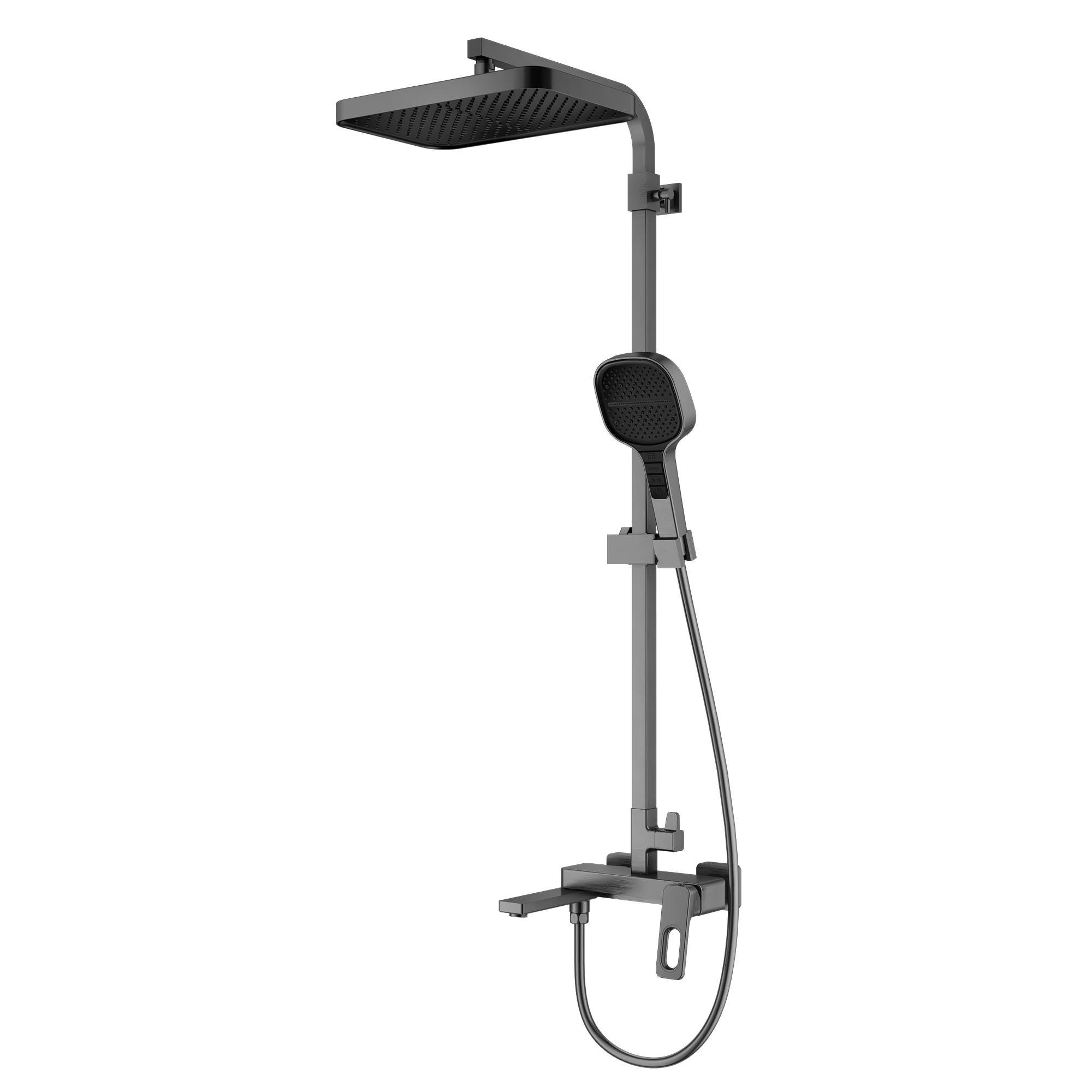 Душевая система Raglo R51.24.09. Цвет: графит. Материал: латунь. Управление: однорычажное. Механизм: керамический картридж. Излив: поворотный. Аэратор. Регулируемая по высоте душевая штанга: 1087-1655 мм. Форма верхнего душа: прямоугольная. Размер верхнего душа (ШхД): 330х220 мм. Регулируемый по высоте и наклону держатель ручного душа. Количество режимов струи ручного душа: 4. Отверстия для монтажа: 3. Стандарт подводки: G 1/2. Монтаж: на стену.