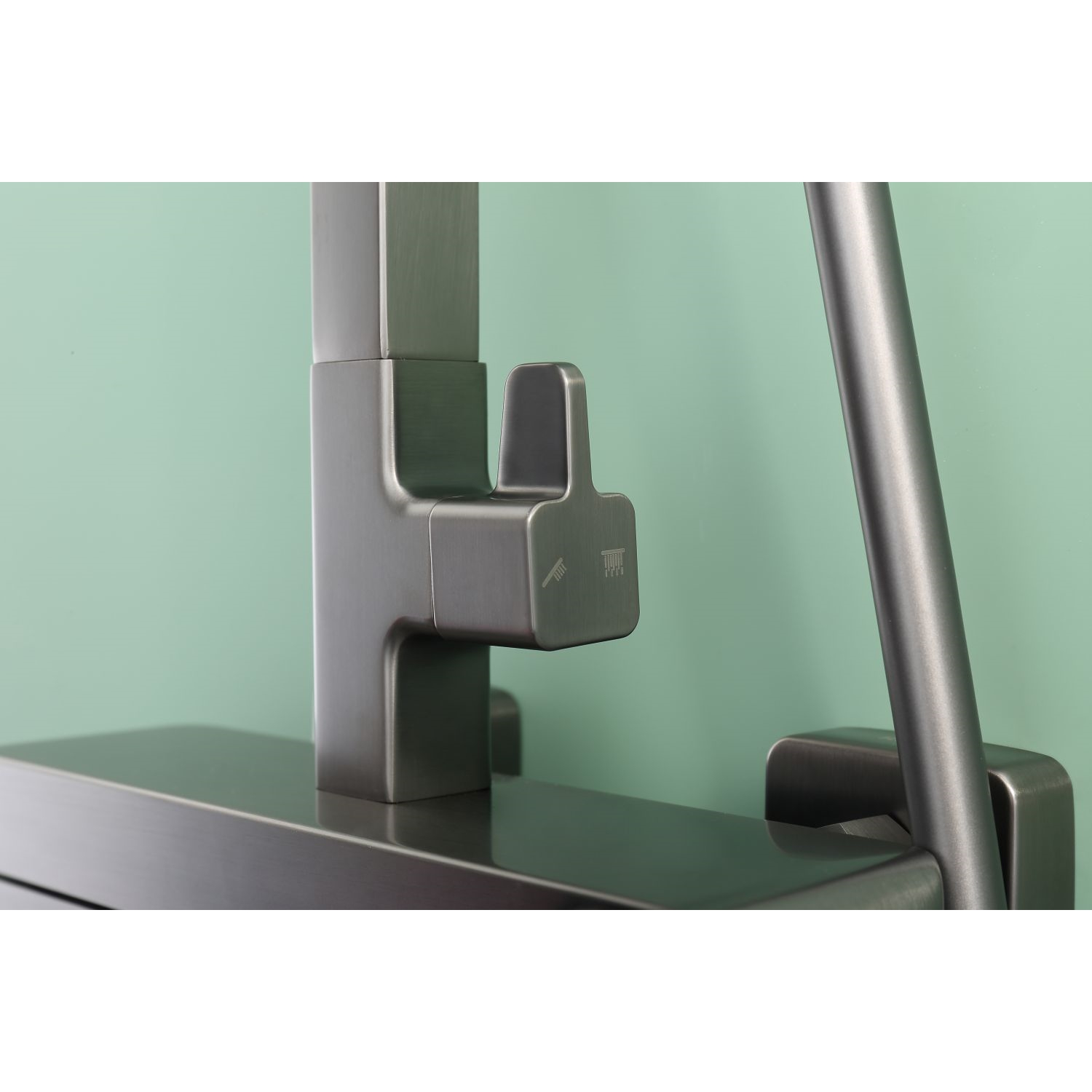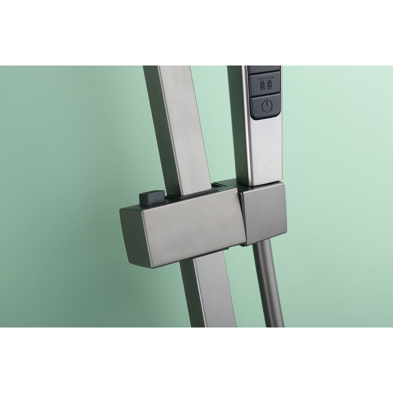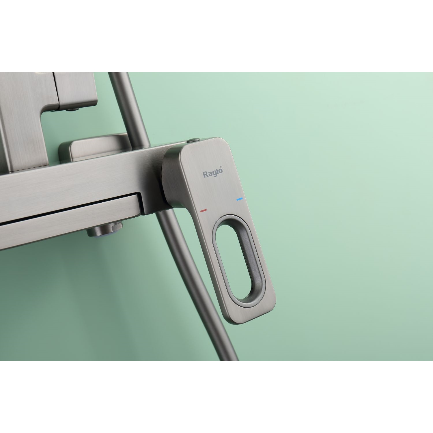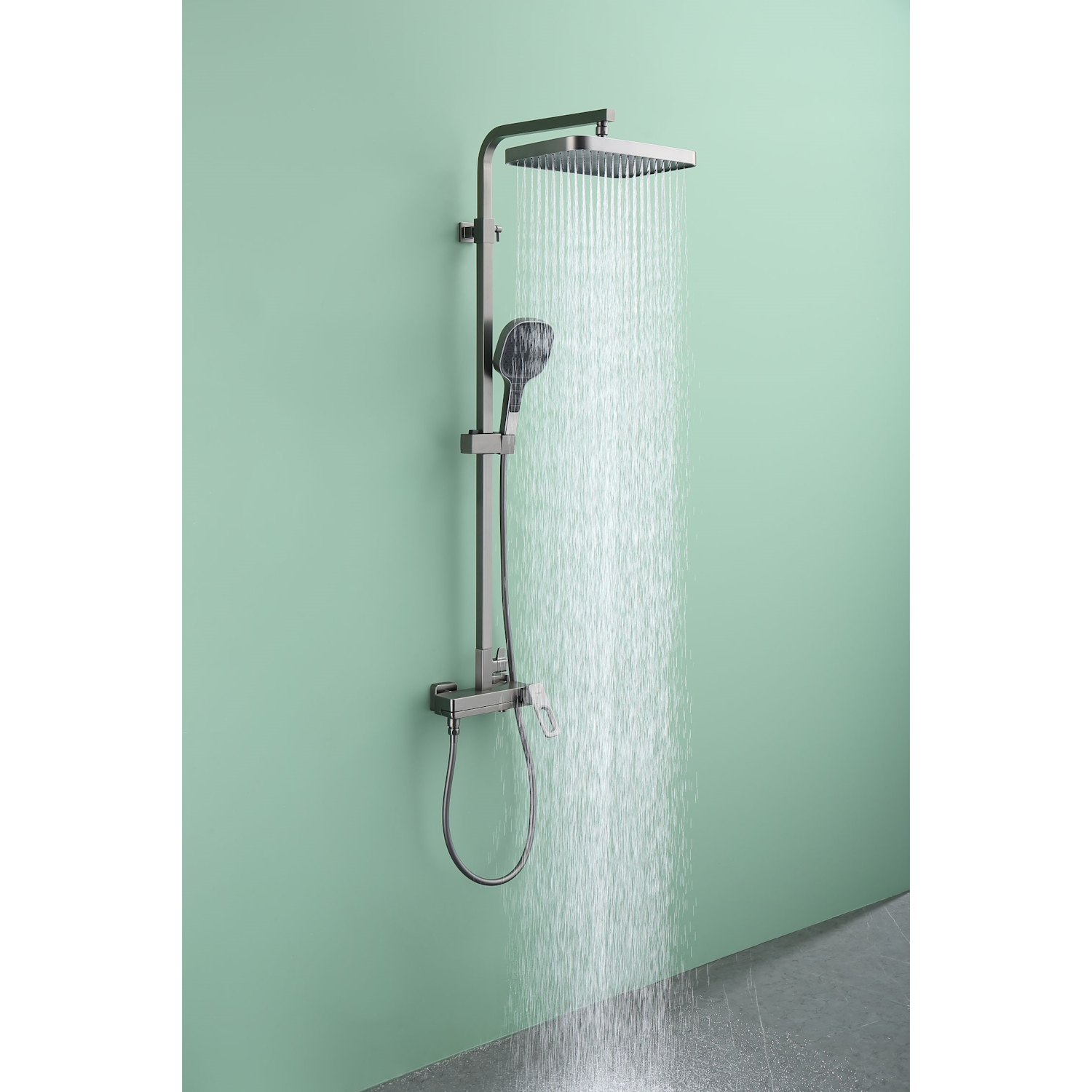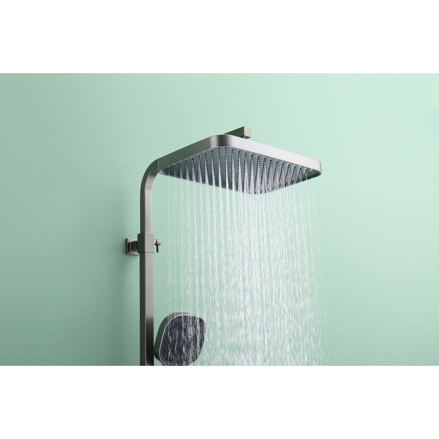 Душевая система Raglo R51.24.09. Цвет: графит. Материал: латунь. Управление: однорычажное. Механизм: керамический картридж. Излив: поворотный. Аэратор. Регулируемая по высоте душевая штанга: 1087-1655 мм. Форма верхнего душа: прямоугольная. Размер верхнего душа (ШхД): 330х220 мм. Регулируемый по высоте и наклону держатель ручного душа. Количество режимов струи ручного душа: 4. Отверстия для монтажа: 3. Стандарт подводки: G 1/2. Монтаж: на стену.