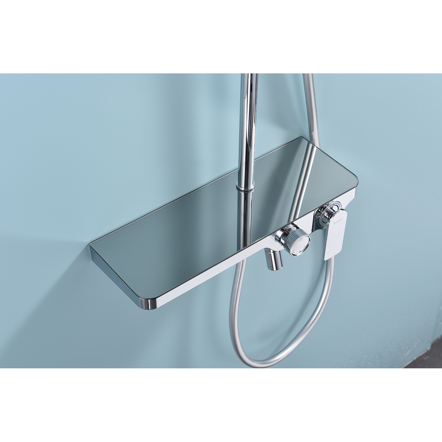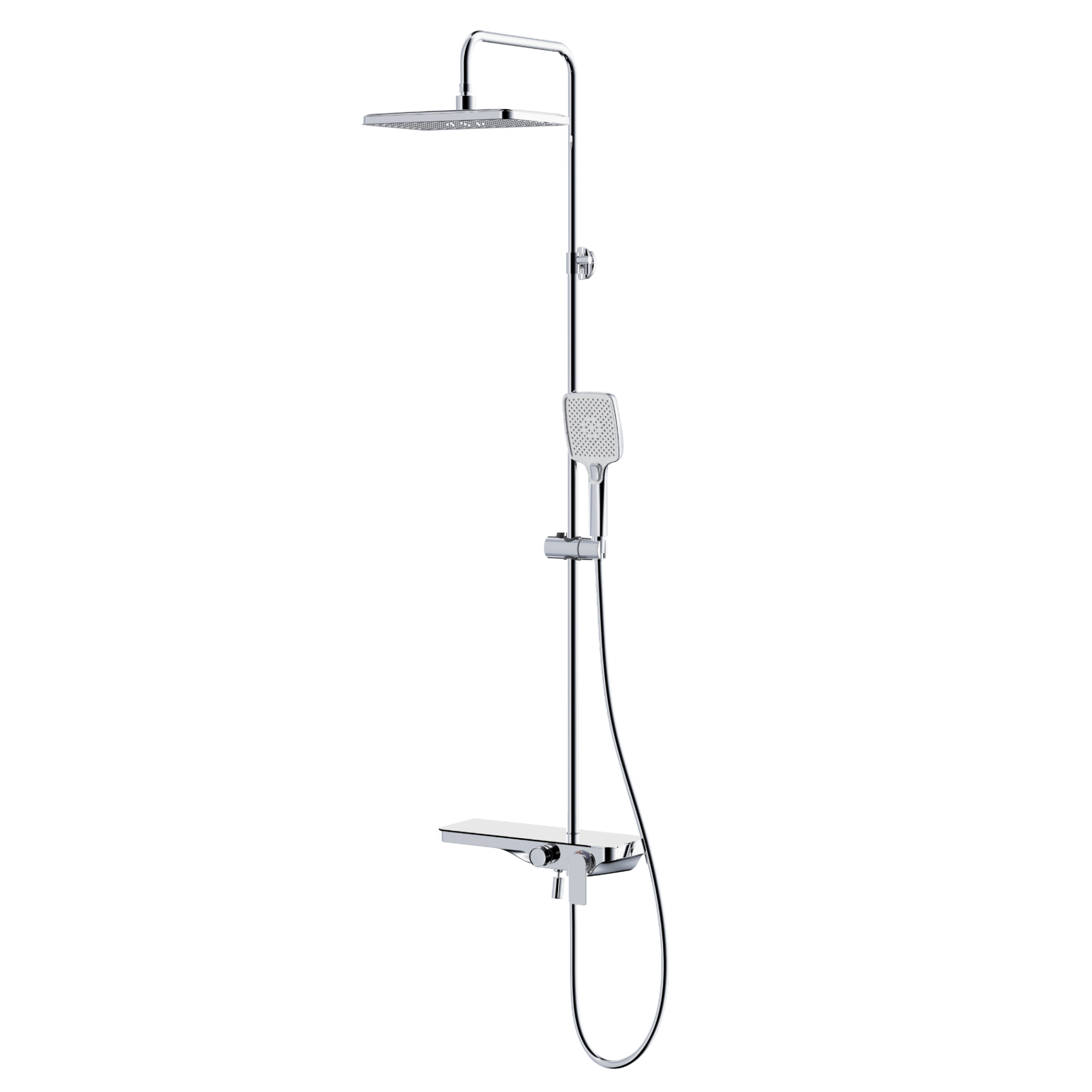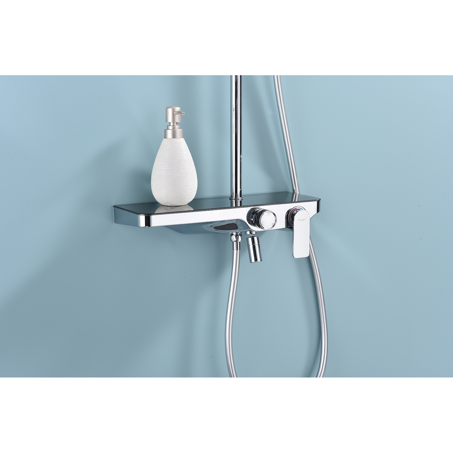 Душевая система Raglo R60.24. Цвет: хром. Материал: латунь. Управление: однорычажное. Механизм: керамический картридж. Скрытый излив с аэратором. Полка из стекла. Регулируемая по высоте душевая штанга: 1100-1530 мм. Форма верхнего душа: прямоугольная. Размер верхнего душа (ШхД): 300х200 мм. Регулируемый по высоте держатель ручного душа. Количество режимов струи ручного душа: 3. Переключение режимов ручного душа: кнопочное. Отверстия для монтажа: 3. Стандарт подводки: G 1/2. Монтаж: на стену.