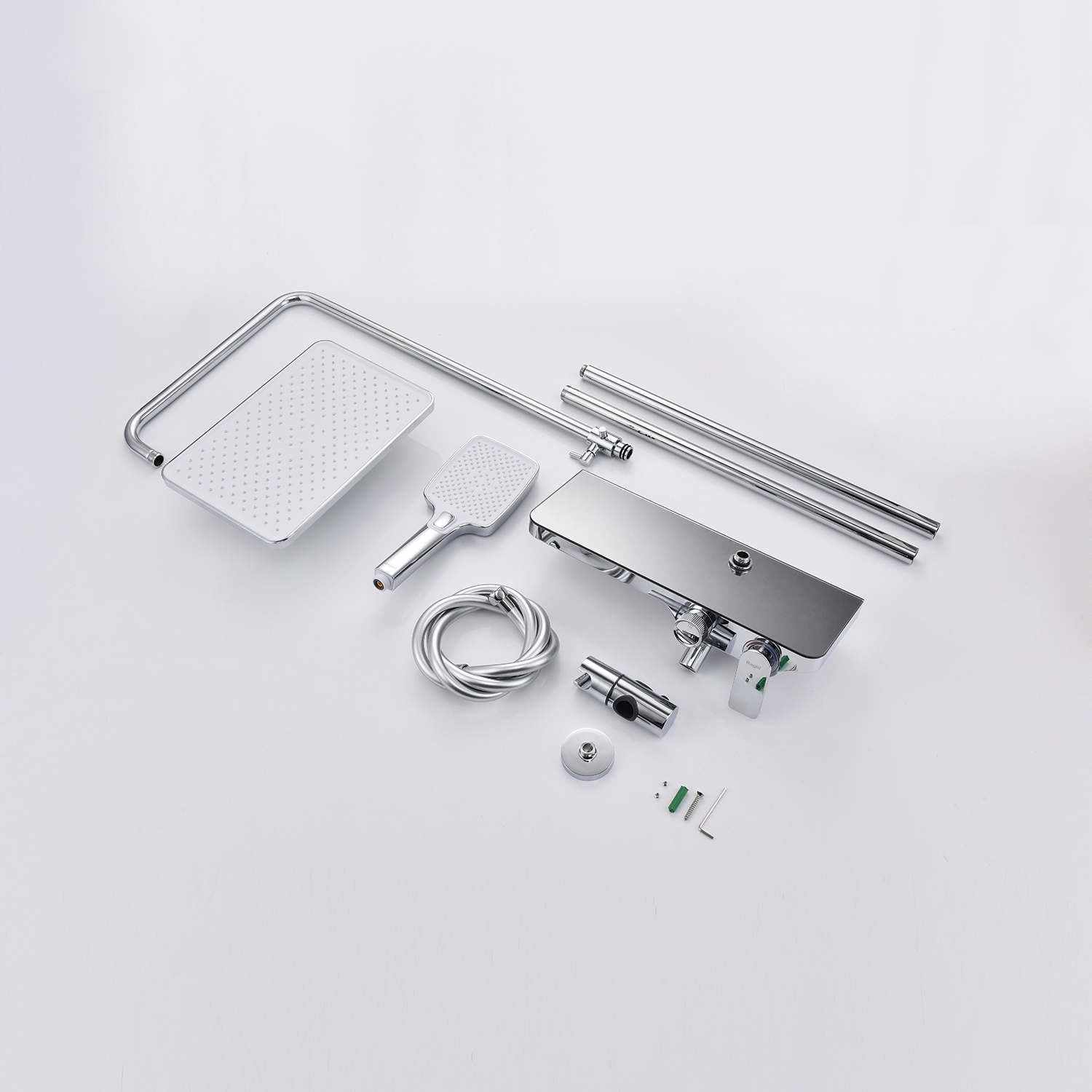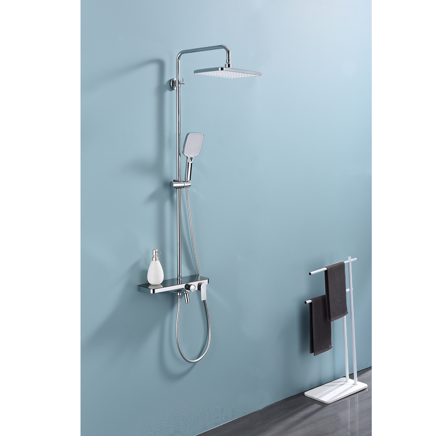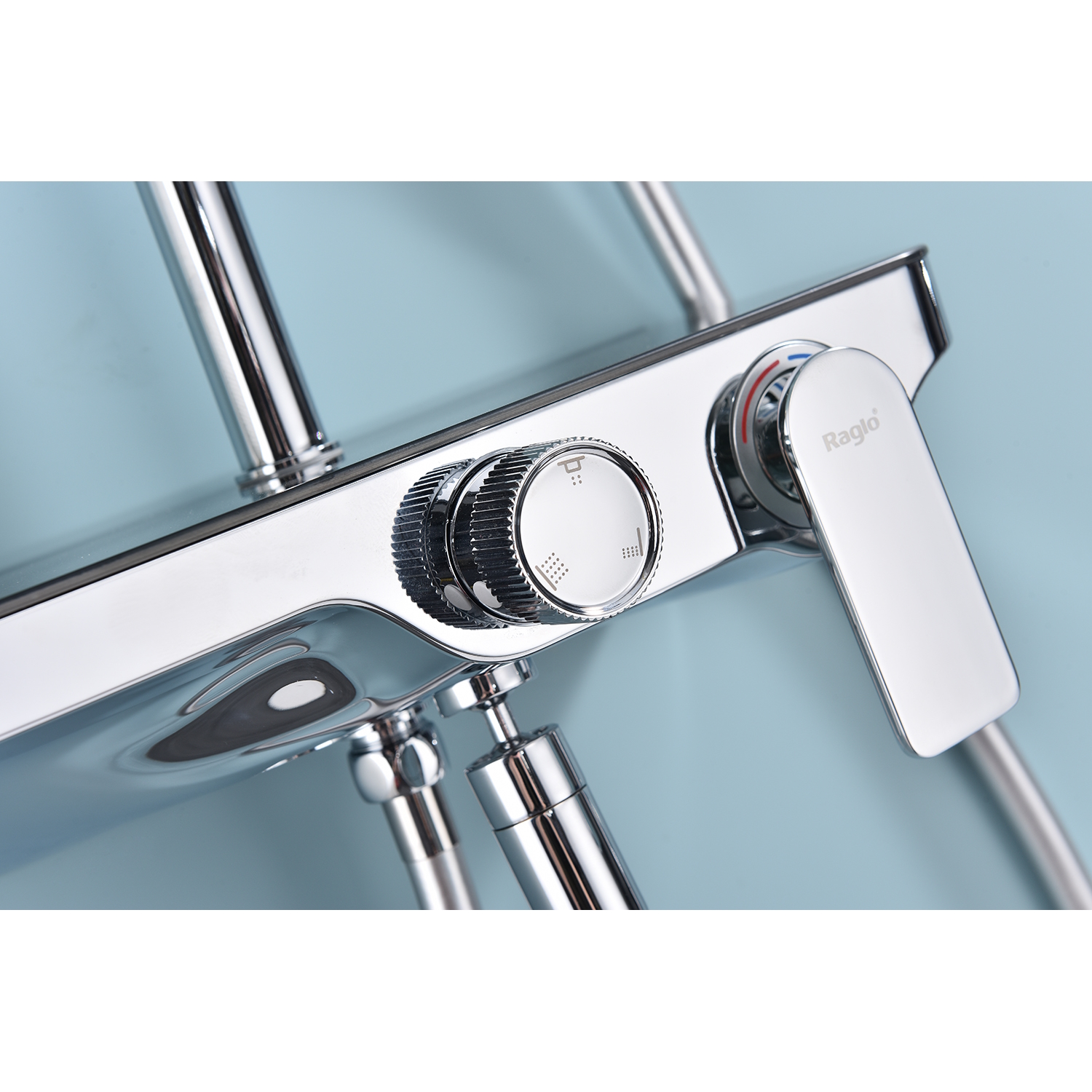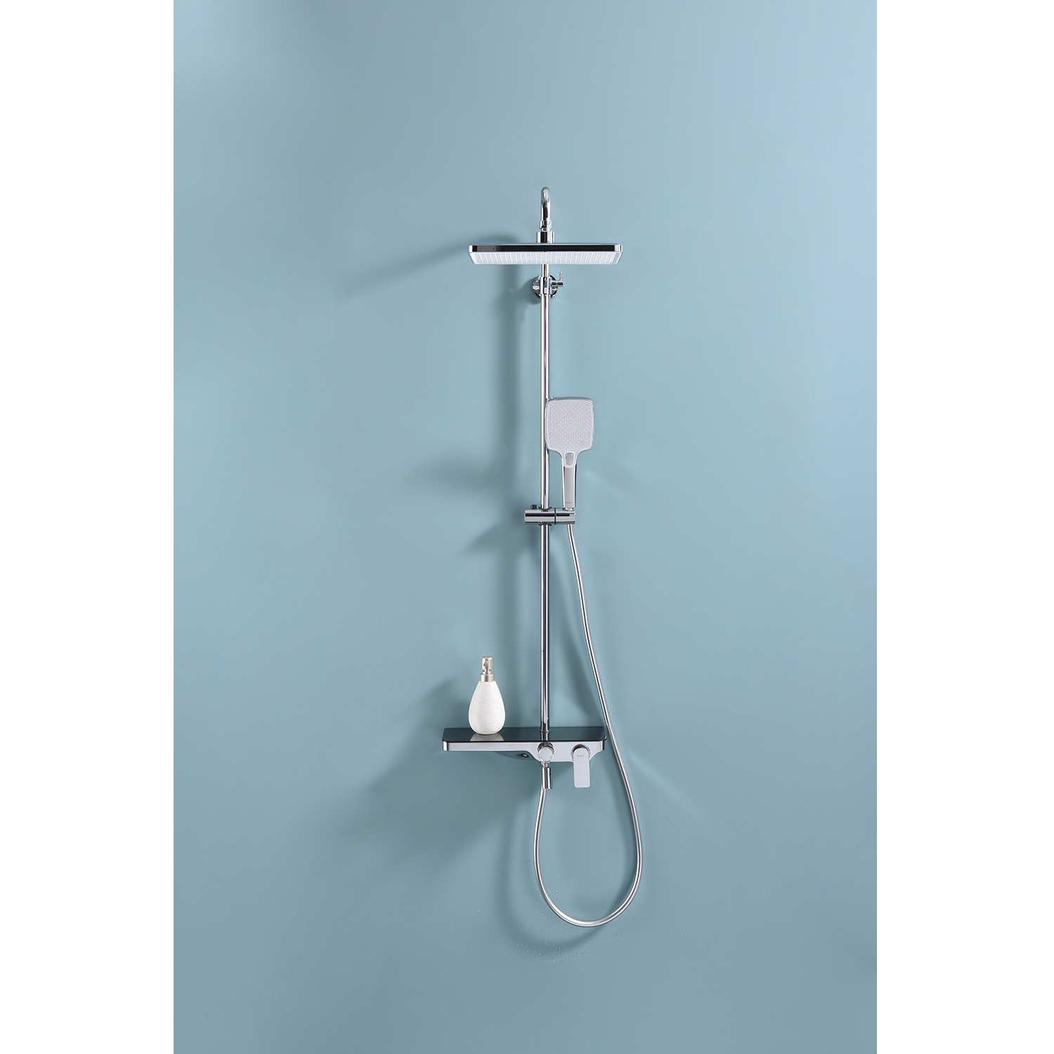 Душевая система Raglo R60.24. Цвет: хром. Материал: латунь. Управление: однорычажное. Механизм: керамический картридж. Скрытый излив с аэратором. Полка из стекла. Регулируемая по высоте душевая штанга: 1100-1530 мм. Форма верхнего душа: прямоугольная. Размер верхнего душа (ШхД): 300х200 мм. Регулируемый по высоте держатель ручного душа. Количество режимов струи ручного душа: 3. Переключение режимов ручного душа: кнопочное. Отверстия для монтажа: 3. Стандарт подводки: G 1/2. Монтаж: на стену.