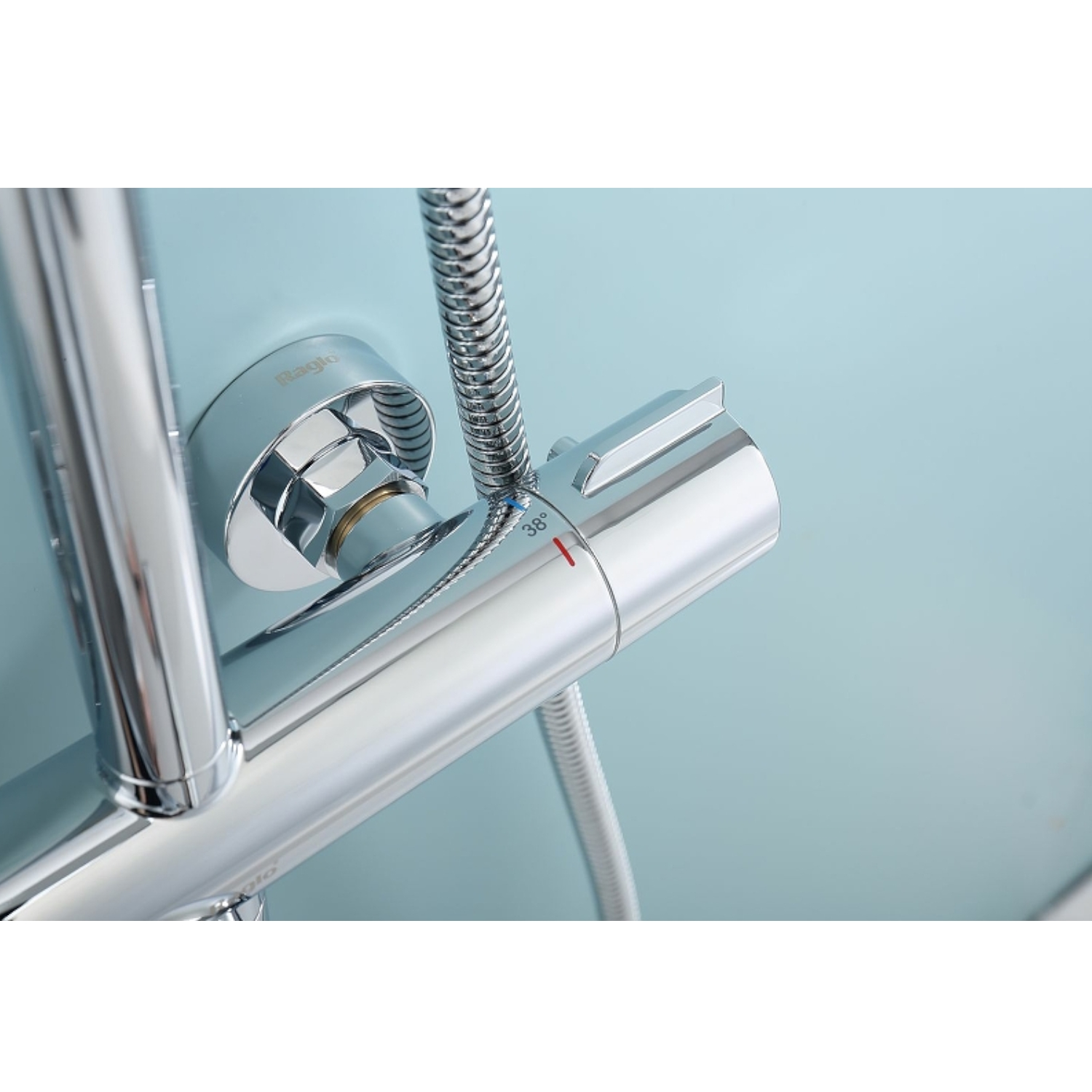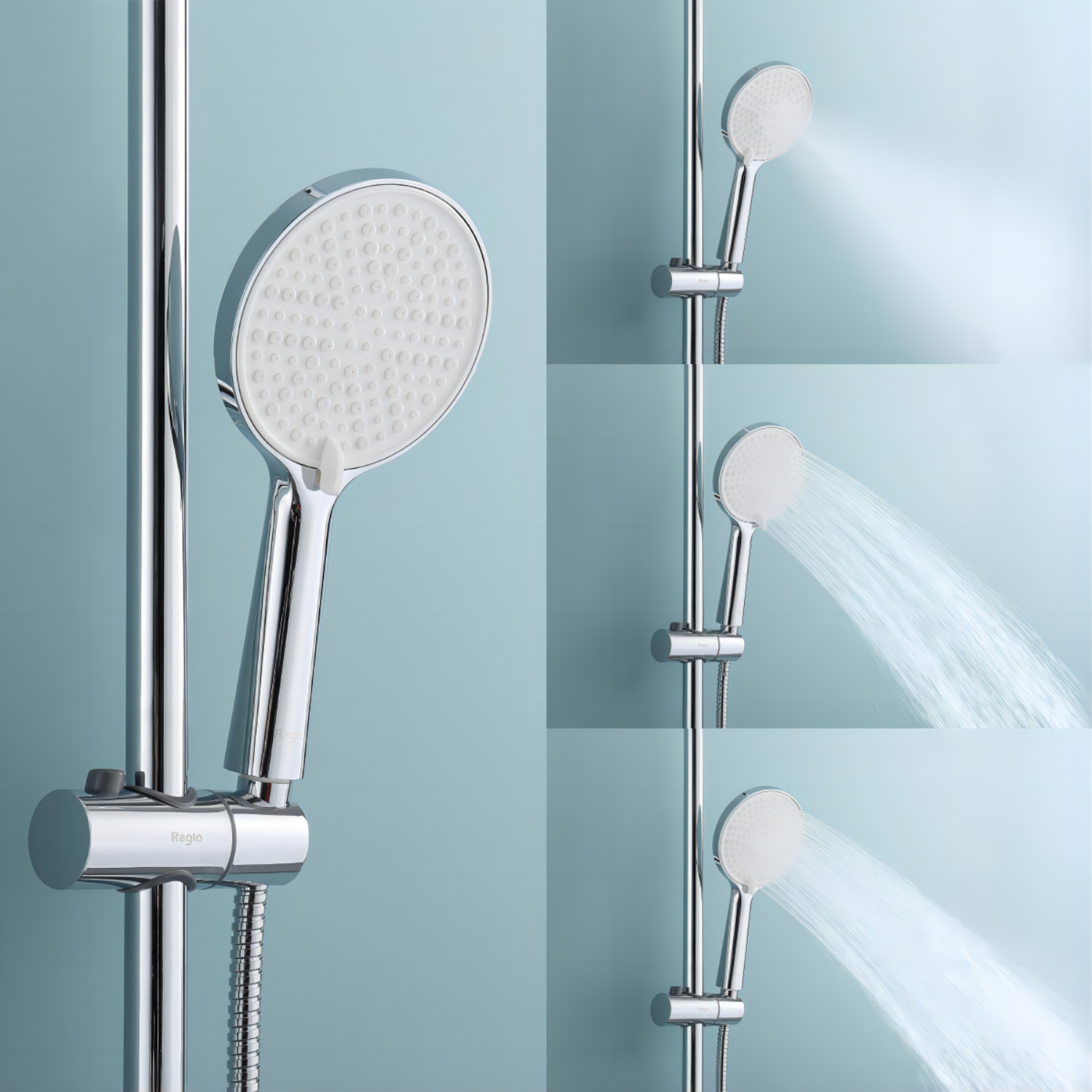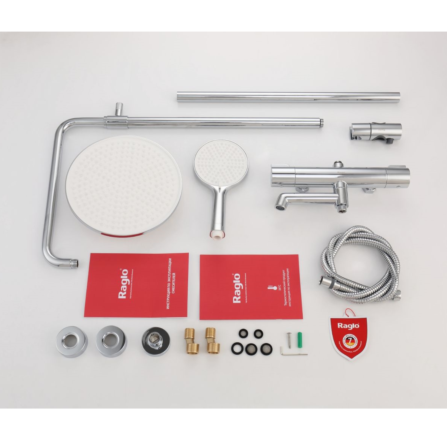 Душевая система Raglo R20.26 с термостатом. Цвет: хром. Материал: латунь. Управление: термостат. Механизм: термостатический картридж. Излив: поворотный. Аэратор. Регулируемая по высоте душевая штанга: 1130-1480 мм. Форма верхнего душа: круглая. Диаметр верхнего душа: 250 мм. Регулируемый по высоте и наклону держатель ручного душа. Форма ручного душа: круглая. Количество режимов струи ручного душа: 3. Отверстия для монтажа: 3. Стандарт подводки: G 1/2. Монтаж: на стену.