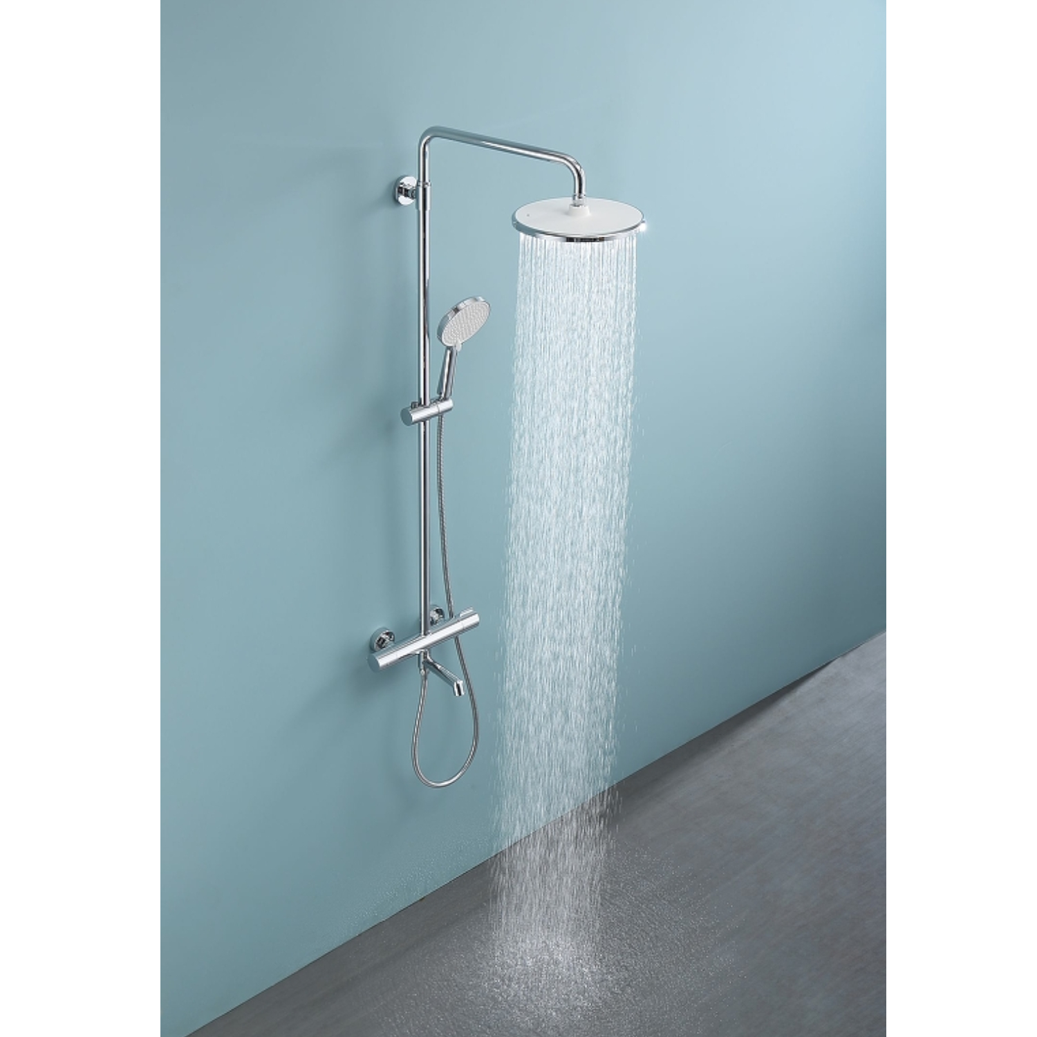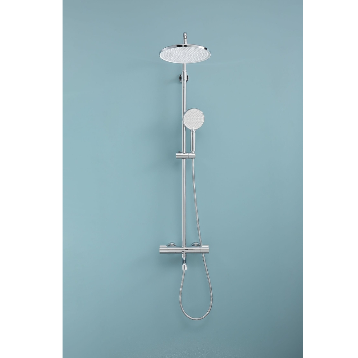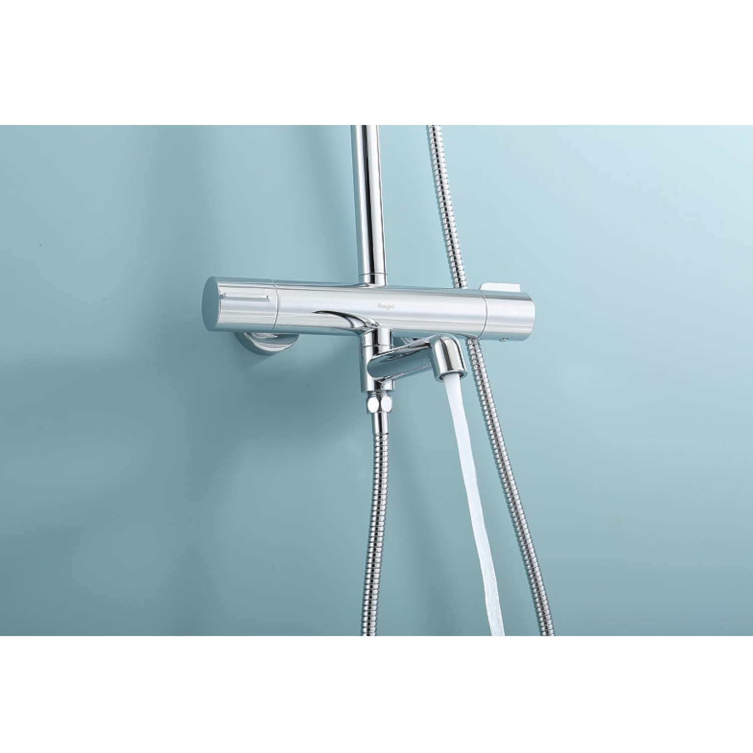 Душевая система Raglo R20.26 с термостатом. Цвет: хром. Материал: латунь. Управление: термостат. Механизм: термостатический картридж. Излив: поворотный. Аэратор. Регулируемая по высоте душевая штанга: 1130-1480 мм. Форма верхнего душа: круглая. Диаметр верхнего душа: 250 мм. Регулируемый по высоте и наклону держатель ручного душа. Форма ручного душа: круглая. Количество режимов струи ручного душа: 3. Отверстия для монтажа: 3. Стандарт подводки: G 1/2. Монтаж: на стену.