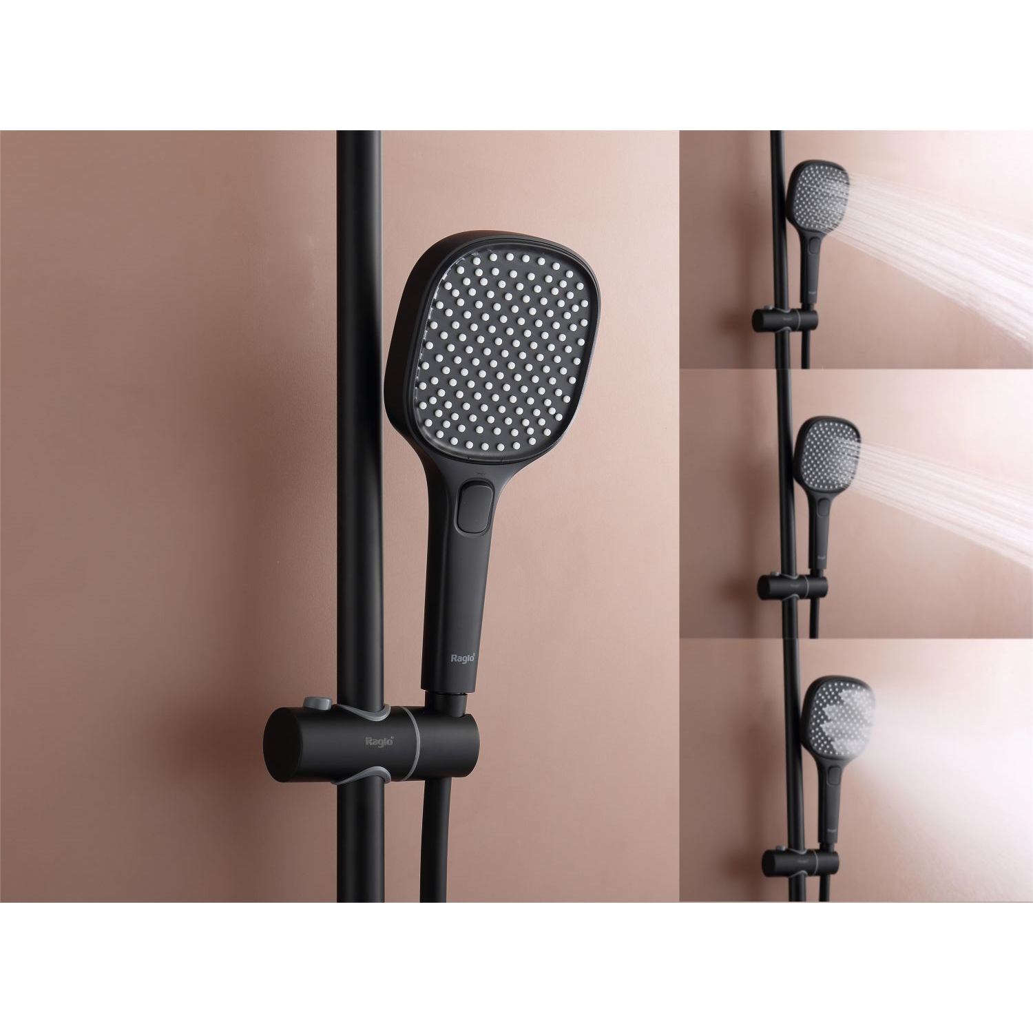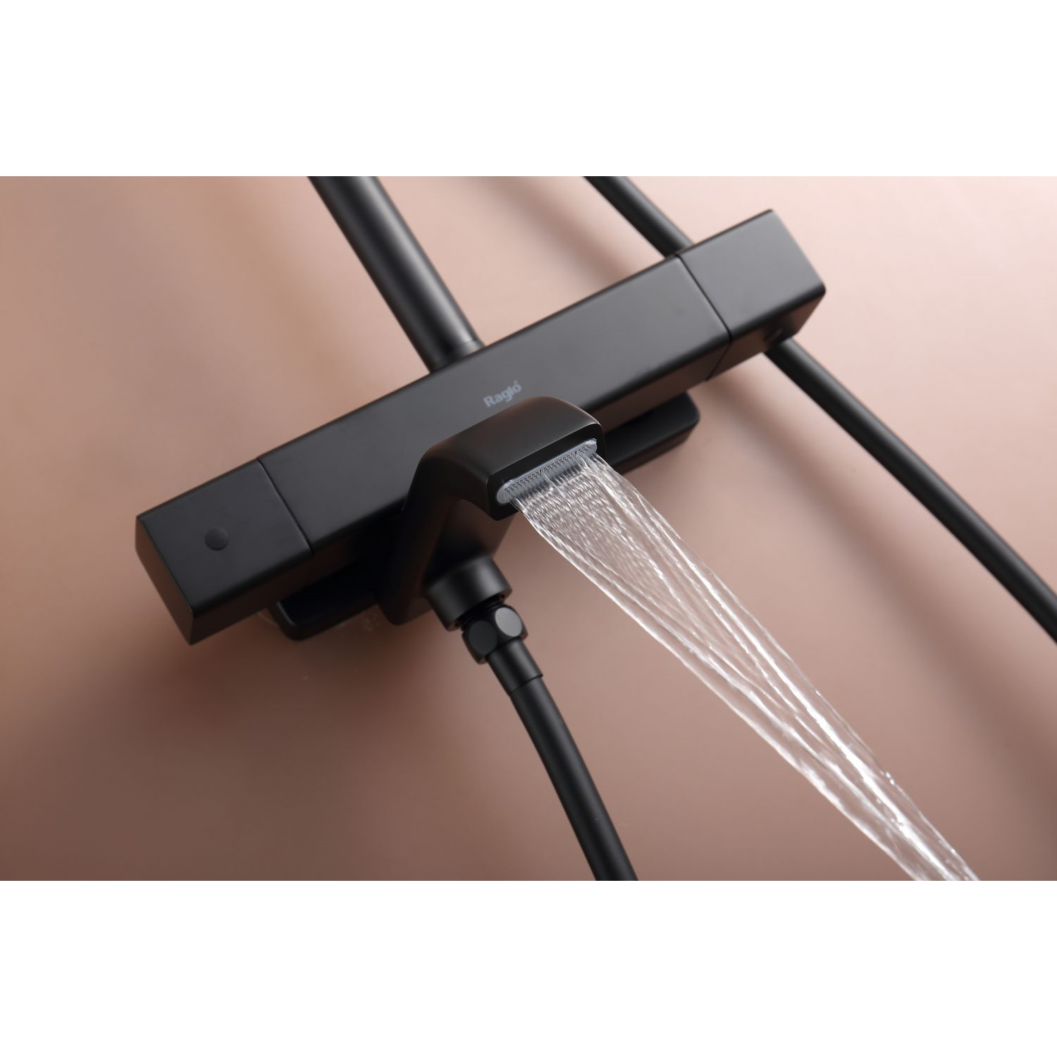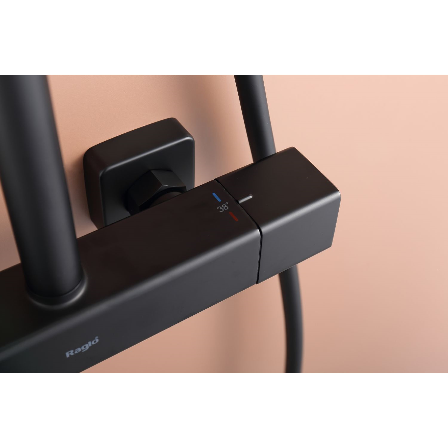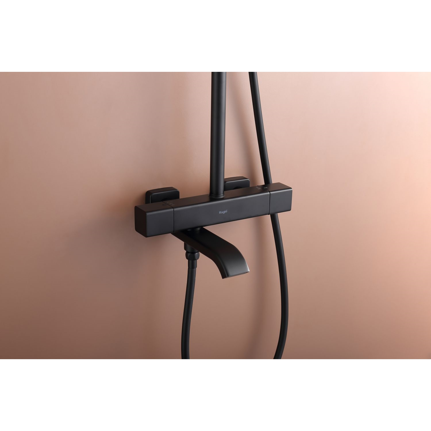 Душевая система Raglo R22.26.06 с термостатом. Цвет: черный. Материал: латунь. Управление: термостат. Механизм: термостатический картридж. Излив: поворотный. Тип излива: каскадный. Аэратор. Ограничение температуры при 38 градусов. Регулируемая по высоте душевая штанга: 1130-1480 мм. Форма верхнего душа: прямоугольная. Размер верхнего душа (ШхД): 322х212 мм. Регулируемый по высоте держатель ручного душа. Форма ручного душа: прямоугольная. Количество режимов струи ручного душа: 3. Отверстия для монтажа: 3. Стандарт подводки: G 1/2. Монтаж: на стену.