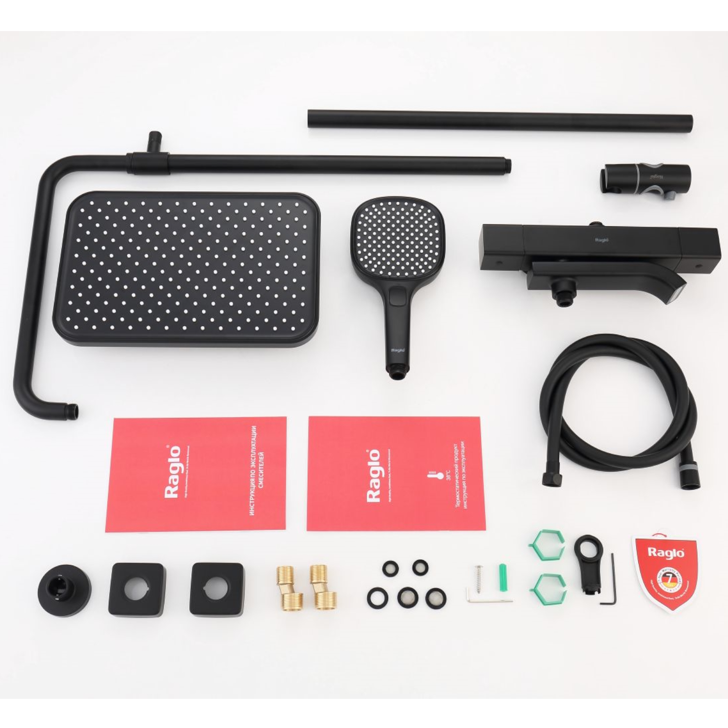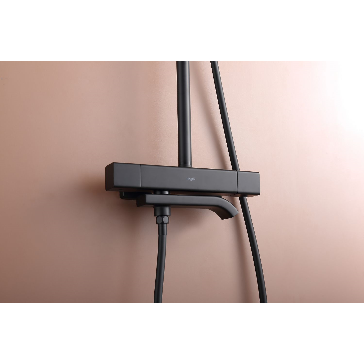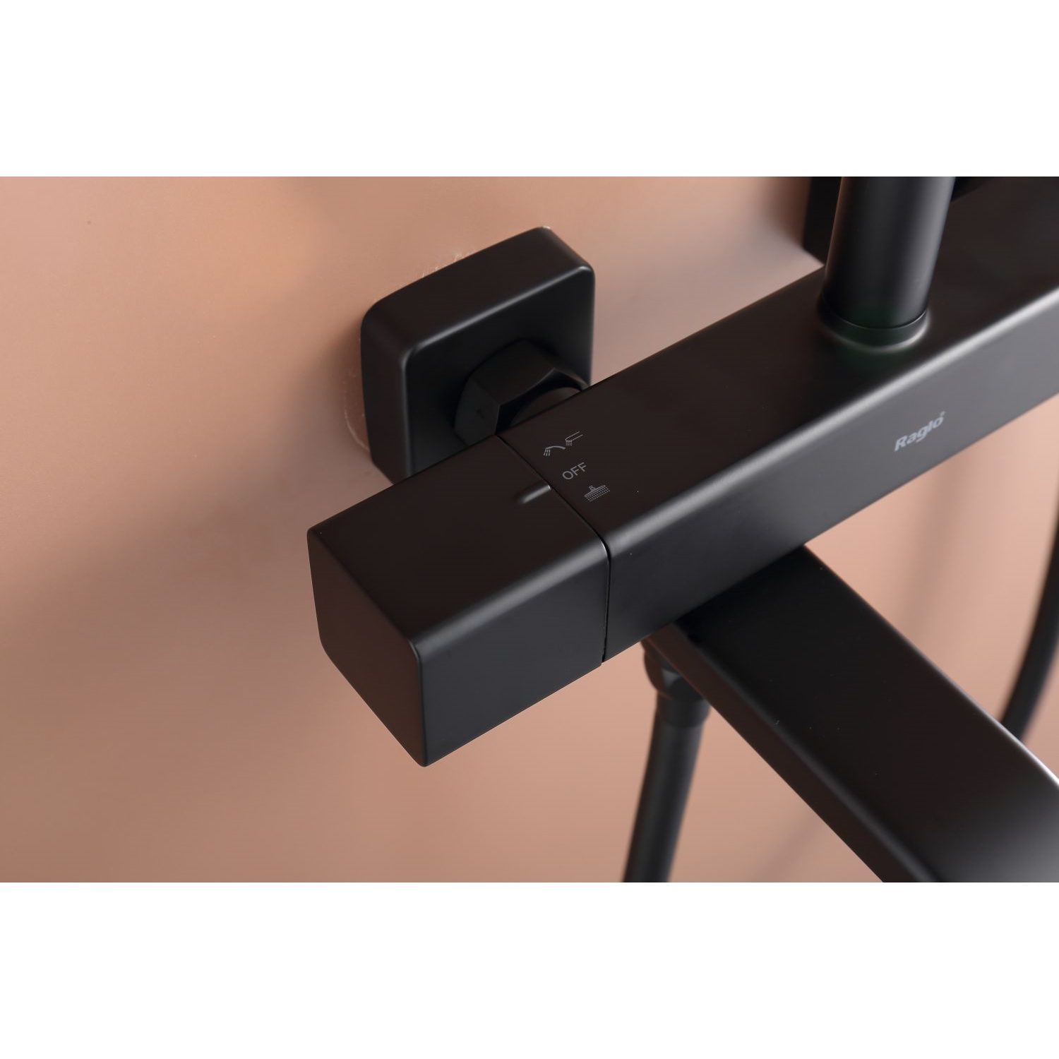 Душевая система Raglo R22.26.06 с термостатом. Цвет: черный. Материал: латунь. Управление: термостат. Механизм: термостатический картридж. Излив: поворотный. Тип излива: каскадный. Аэратор. Ограничение температуры при 38 градусов. Регулируемая по высоте душевая штанга: 1130-1480 мм. Форма верхнего душа: прямоугольная. Размер верхнего душа (ШхД): 322х212 мм. Регулируемый по высоте держатель ручного душа. Форма ручного душа: прямоугольная. Количество режимов струи ручного душа: 3. Отверстия для монтажа: 3. Стандарт подводки: G 1/2. Монтаж: на стену.