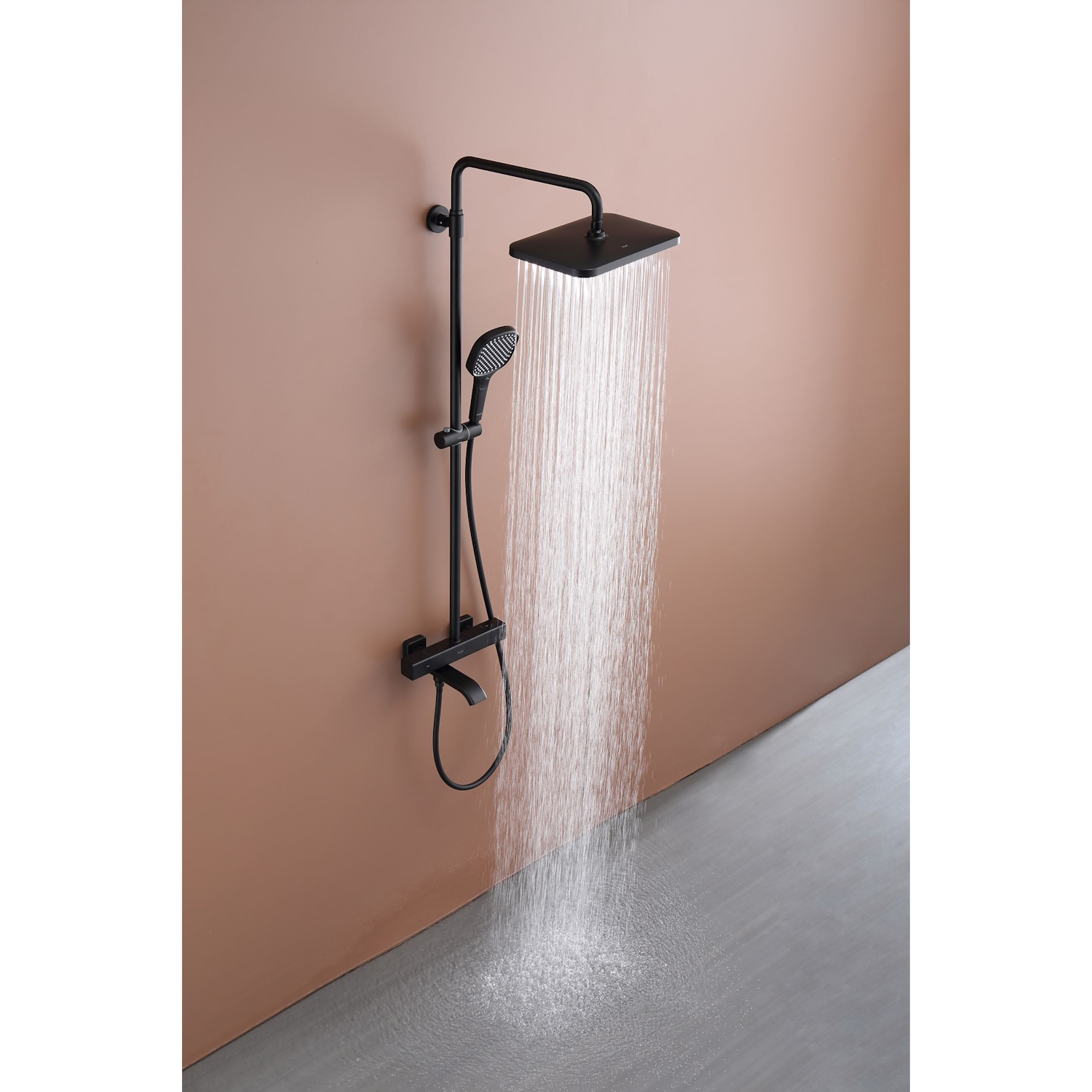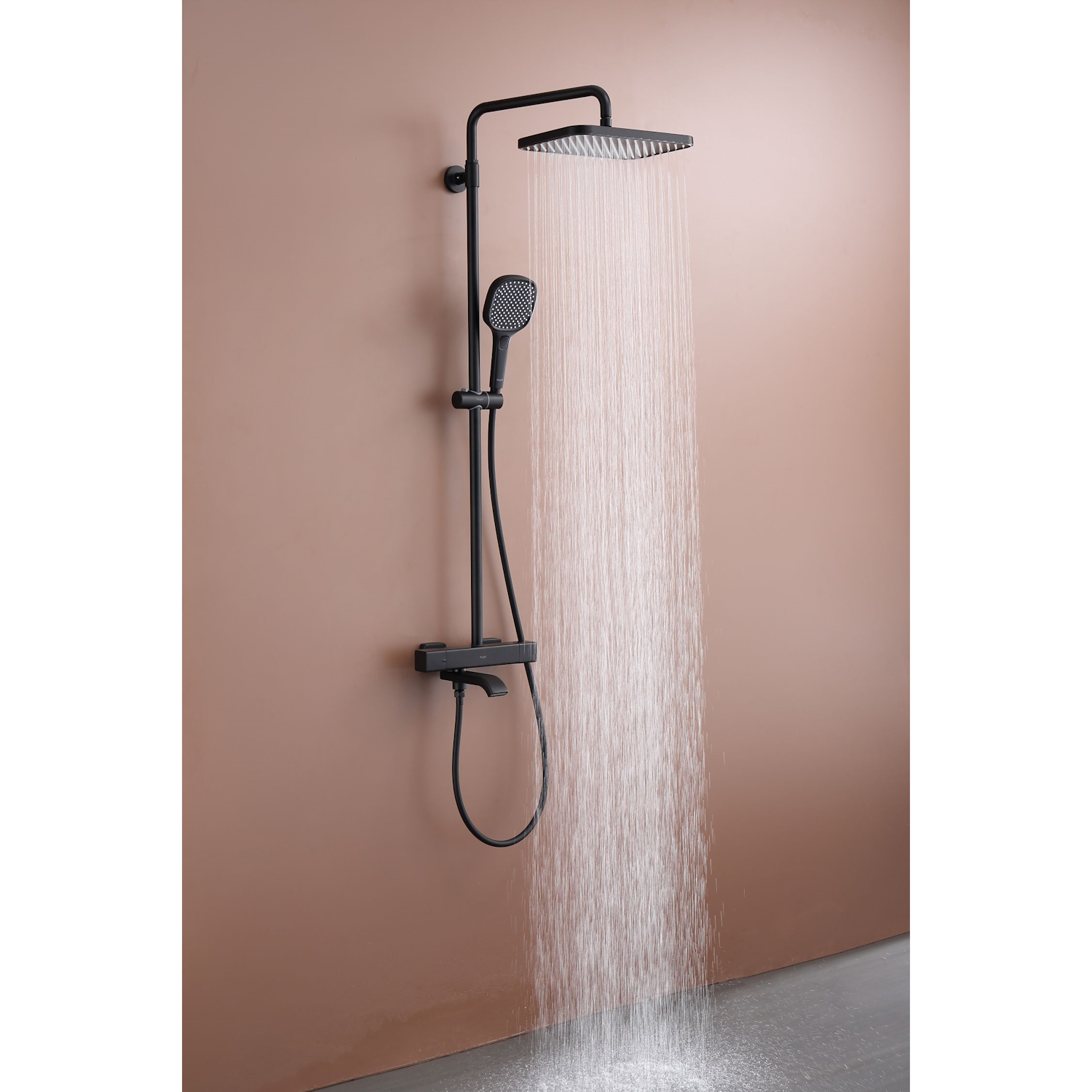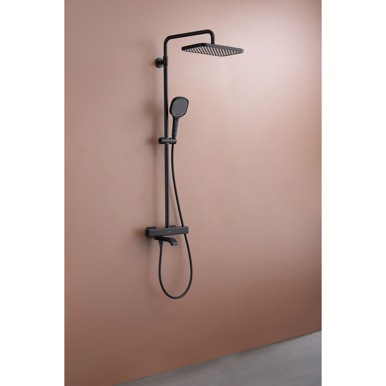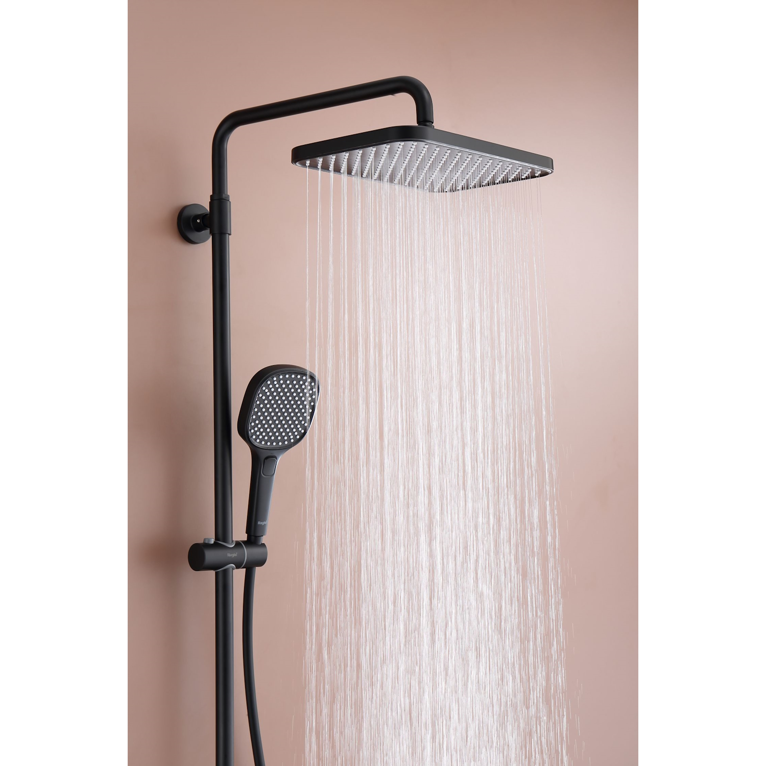 Душевая система Raglo R22.26.06 с термостатом. Цвет: черный. Материал: латунь. Управление: термостат. Механизм: термостатический картридж. Излив: поворотный. Тип излива: каскадный. Аэратор. Ограничение температуры при 38 градусов. Регулируемая по высоте душевая штанга: 1130-1480 мм. Форма верхнего душа: прямоугольная. Размер верхнего душа (ШхД): 322х212 мм. Регулируемый по высоте держатель ручного душа. Форма ручного душа: прямоугольная. Количество режимов струи ручного душа: 3. Отверстия для монтажа: 3. Стандарт подводки: G 1/2. Монтаж: на стену.