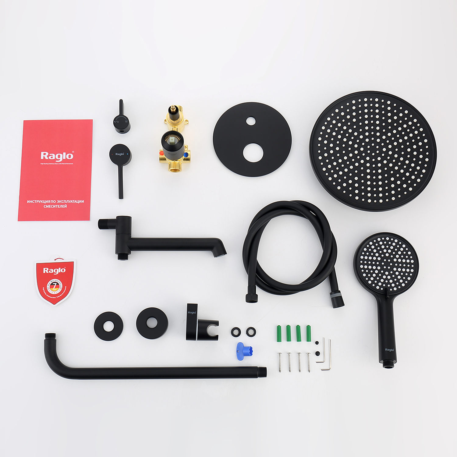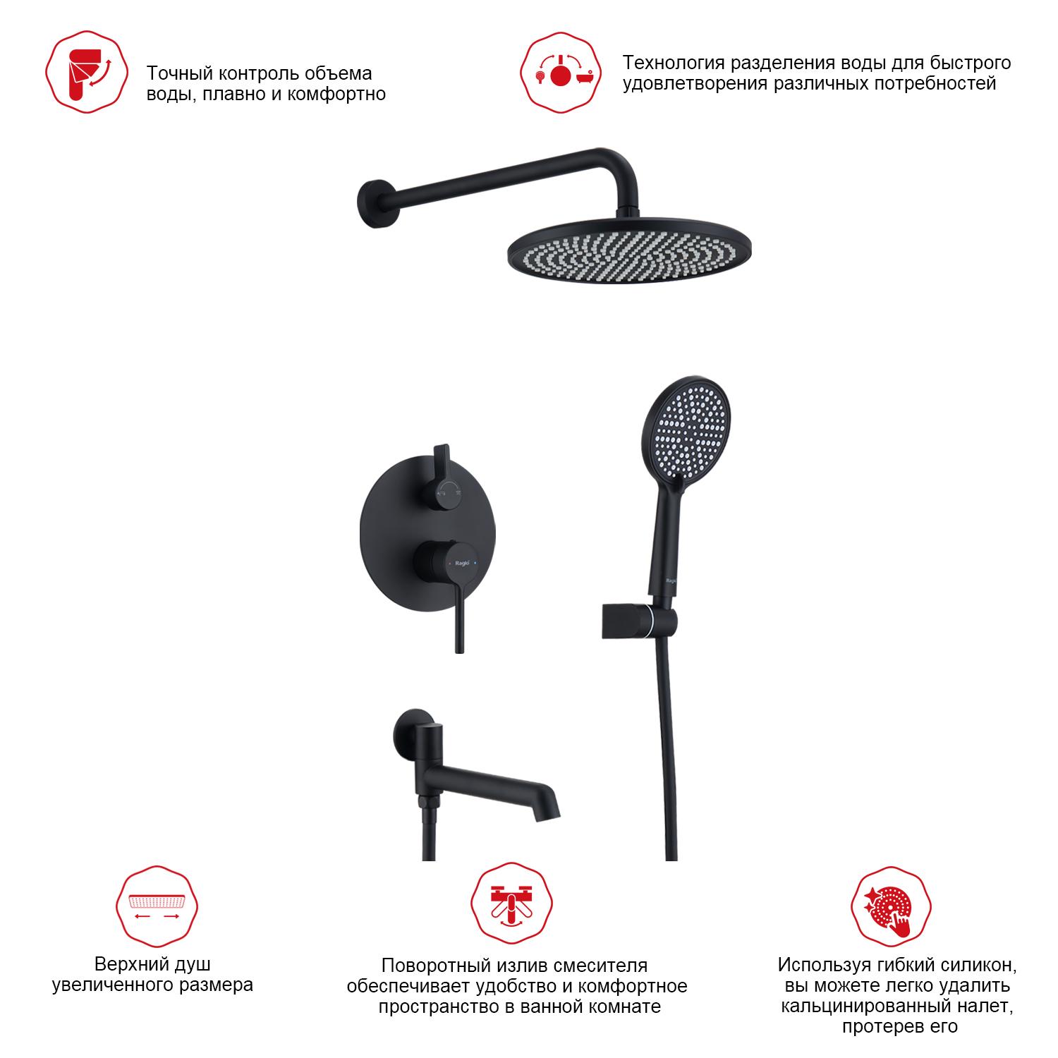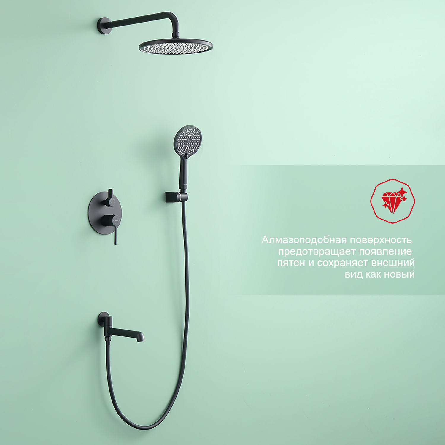 Душевая система встраиваемая Raglo R20.27.06, черный. Материал: латунь. Управление: однорычажное. Механизм: керамический картридж. Излив: поворотный. Аэратор. Диаметр верхнего душа: 250 мм. Форма верхнего душа и ручного душа: круглая. Количество режимов струи ручного душа: 3. Стандарт подводки: G 1/2. Монтаж: встраиваемый. Излив - функция переключения.