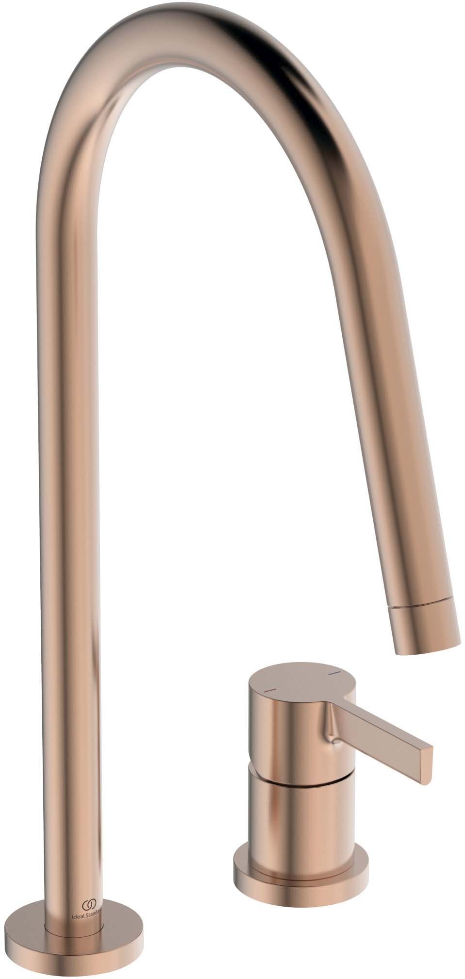 GUSTO Смеситель для кухонной мойки с высоким трубчатым круглым изливом, под 2 отверстия, излив R-типа, поворотный на 360°, керамический картридж FirmaFlow 28 мм с функцией HWTC (ограничение максимальной температуры горячей воды), металлическая рукоятка с индикаторами горячей / холодной воды, аэратор Perlator, гибкая подводка G3/8"