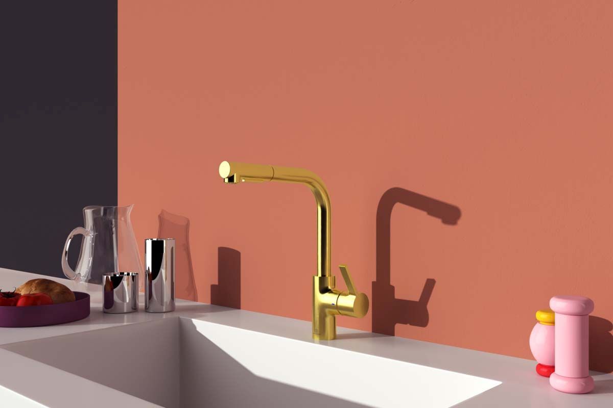 GUSTO Смеситель для кухонной мойки с высоким вытяжным трубчатым изливом L-типа, 2-функциональный излив, поворотный на 360°, керамический картридж FirmaFlow 28 мм с функцией HWTC (ограничение максимальной температуры горячей воды), металлическая рукоятка, индикаторы горячей / холодной воды нанесены на корпус, система монтажа Easy Fix+ (облегченный монтаж для кухонных смесителей), гибкая подводка G3/8"