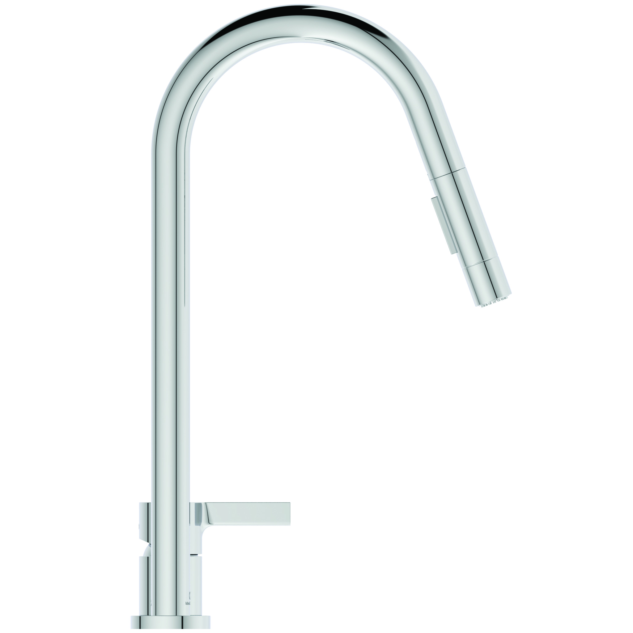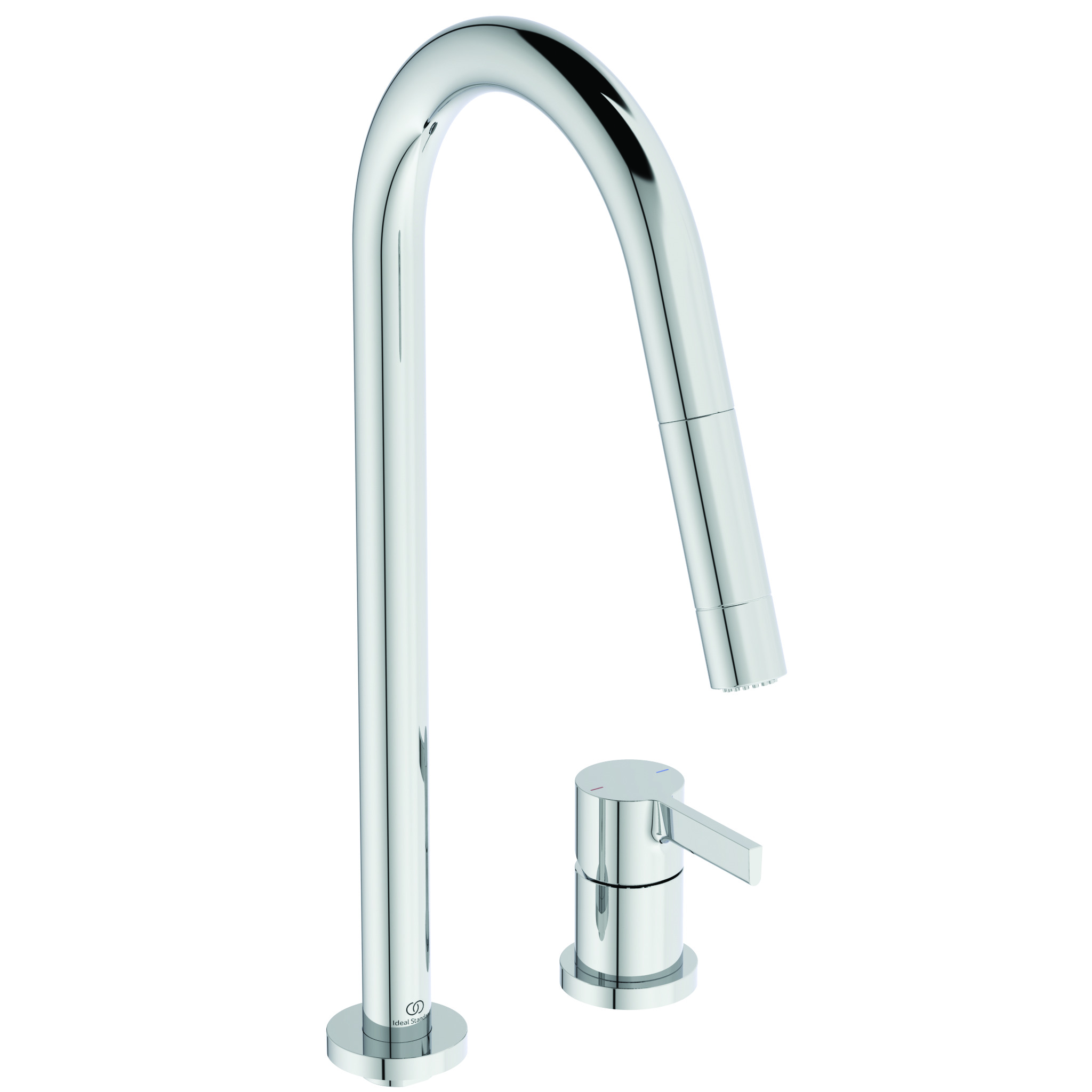 GUSTO Смеситель для кухонной мойки с высоким вытяжным трубчатым круглым изливом, под 2 отверстия, излив R-типа, поворотный на 360°, керамический картридж FirmaFlow 28 мм с функцией HWTC (ограничение максимальной температуры горячей воды), металлическая рукоятка с индикаторами горячей / холодной воды, аэратор Perlator, гибкая подводка G3/8". 2-функциональная вытяжная лейка