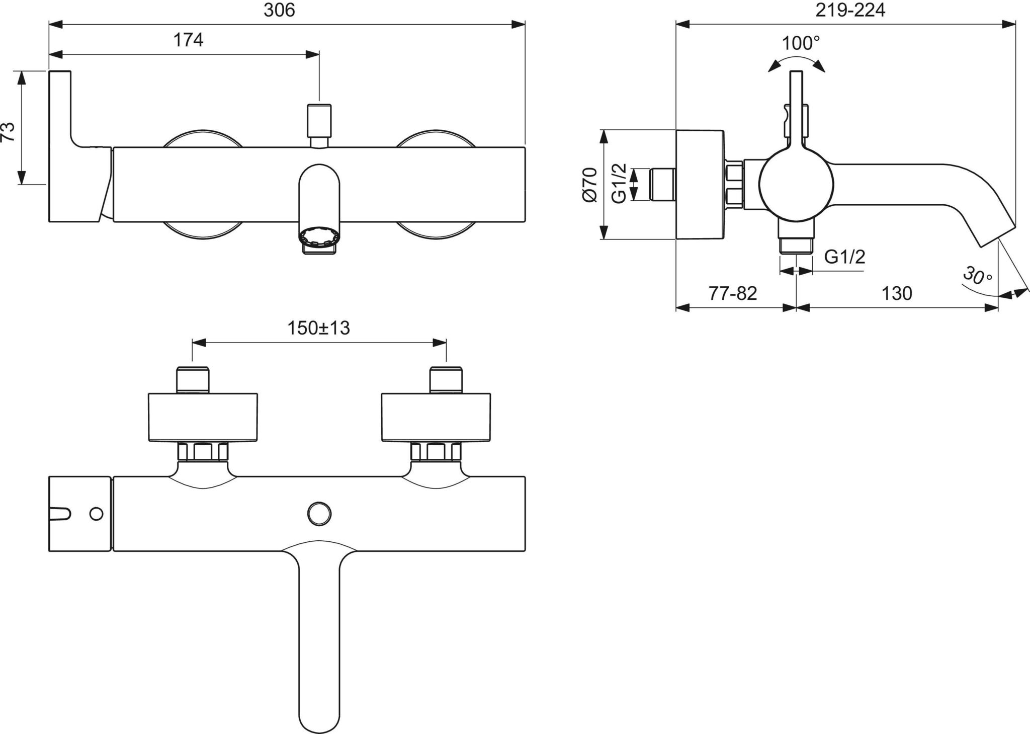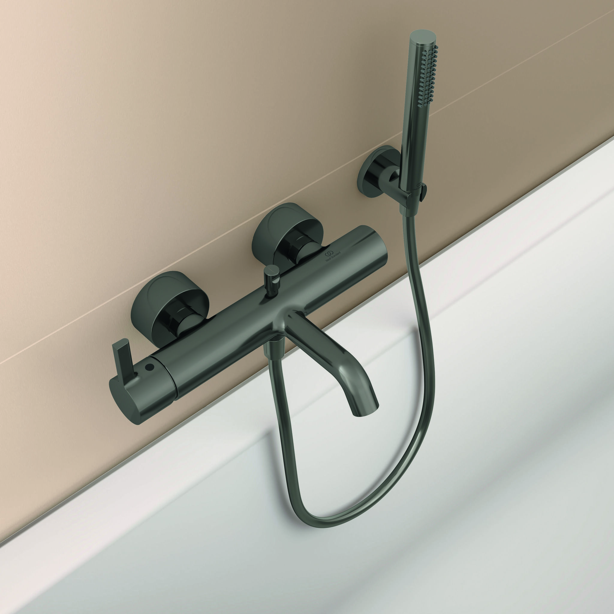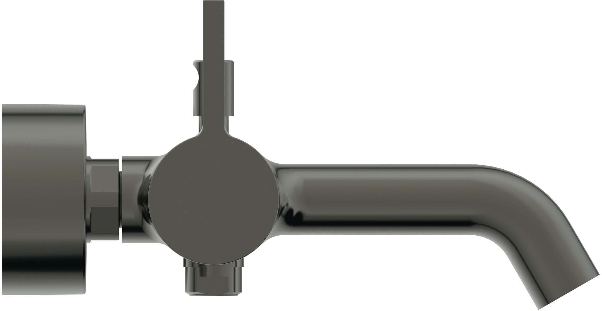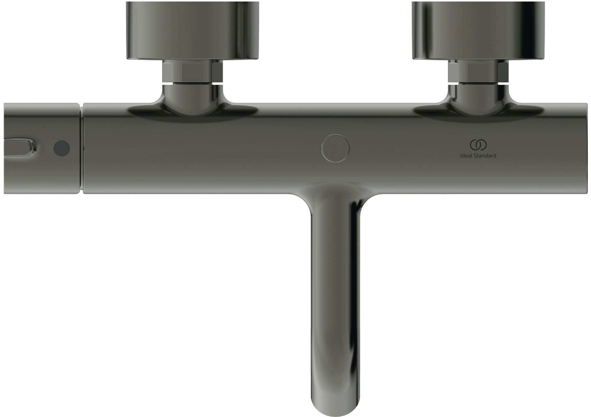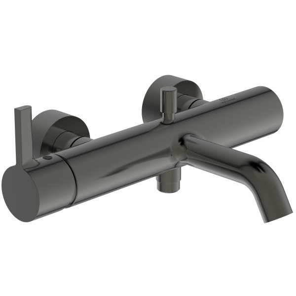JOY Настенный смеситель для ванны/душа, керамический картридж FirmaFlow 38 мм, с функцией HWTC (ограничение максимальной температуры горячей воды), без функции CLICK, логотип Ideal Standard на корпусе, металлическая рукоятка без индикаторов горячей / холодной воды, обратный клапан, эксцентрики с шумопонижателем, аэратор Caché M24x1, автоматическое переключение