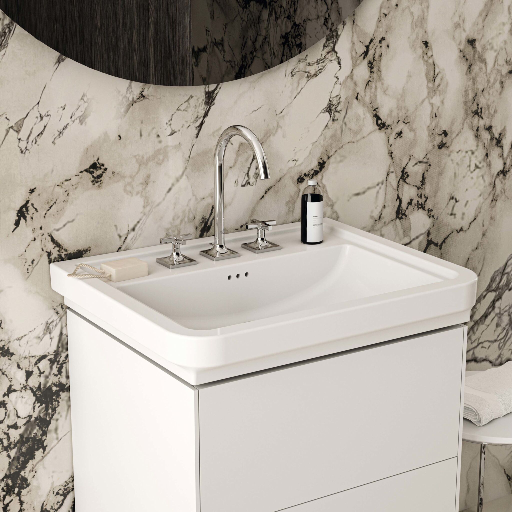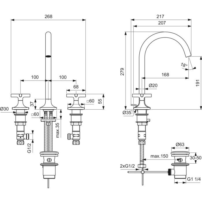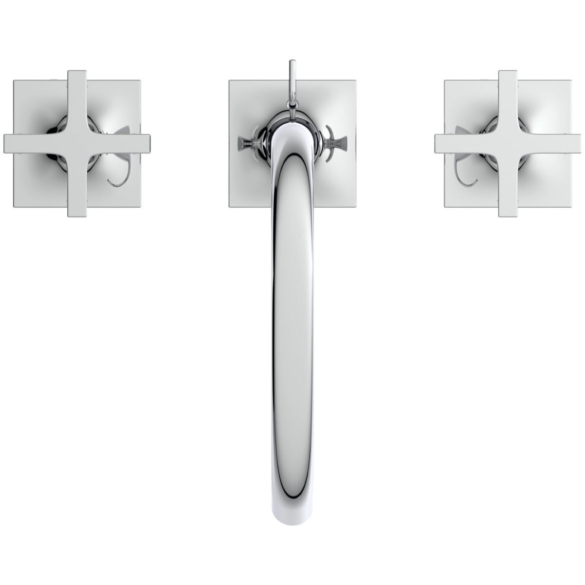 JOY NEO Двурукоятковый смеситель для раковины под 3 отверстия, с донным клапаном, 5 л/мин. Металлические квадратные декоративные накладки, трубчатый излив с логотипом Ideal Standard, крестовые металлические рукоятки без индикаторов горячей / холодной воды, аэратор Caché M16,5x1 с ограничением потока 5 л/мин, керамические кранбуксы, гибкая подводка PEX G3/8", металлический донный клапан