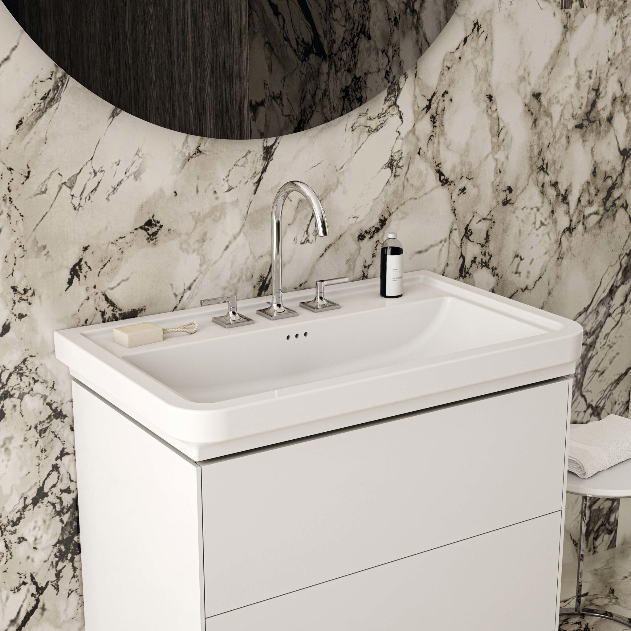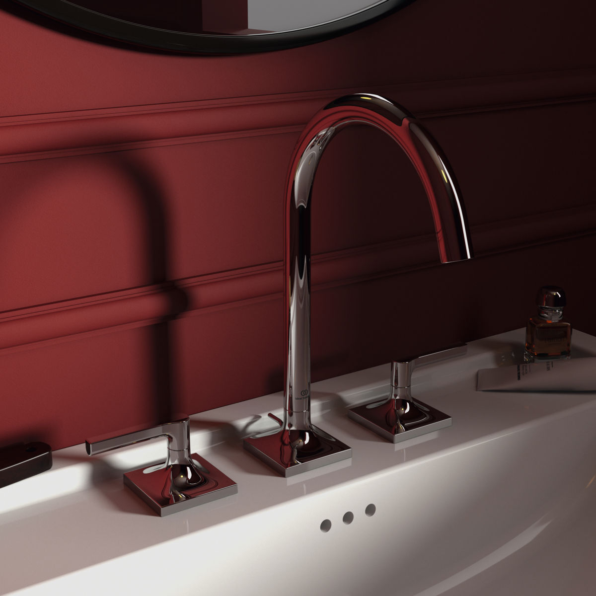 JOY NEO Двурукоятковый смеситель для раковины под 3 отверстия, с донным клапаном, 5 л/мин. Металлические квадратные декоративные накладки, трубчатый излив с логотипом Ideal Standard, металлические рукоятки lever без индикаторов горячей / холодной воды, аэратор Caché M16,5x1 с ограничением потока 5 л/мин, керамические кранбуксы, гибкая подводка PEX G3/8", металлический донный клапан
