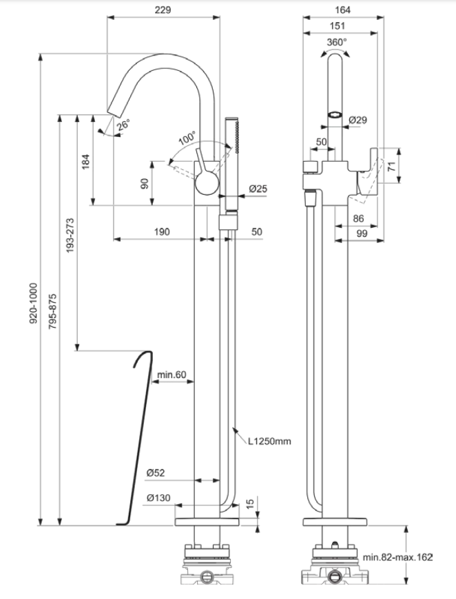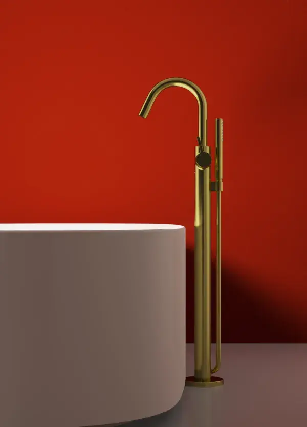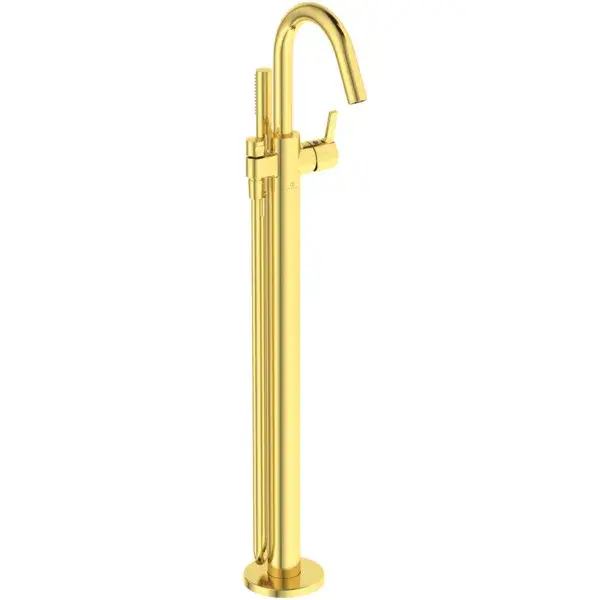 JOY Однорукоятковый напольный смеситель для ванны/душа, латунный корпус, состоящий из 2-х частей, аэратор Cache M24x1, керамический картридж FirmaFlow 38 мм, с функцией HWTC (ограничение максимальной температуры горячей воды), без функции CLICK, автоматическое переключение, металлическая рукоятка без индикаторов горячей / холодной воды, ручной душ Stick, шланг для душа Idealflex 1250 мм. Новый встраиваемый комплект №1 – вертикально регулируемый и подходящий для встроенной установки для пола 80-160 мм. Для монтажа с A6133NU (встраиваемый комплект)