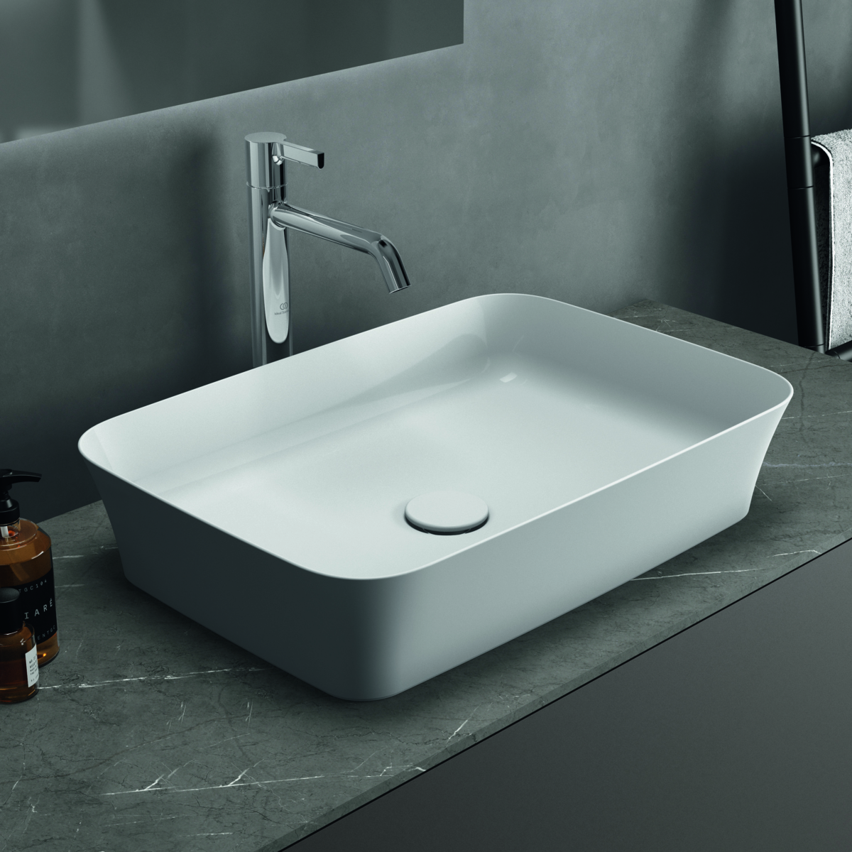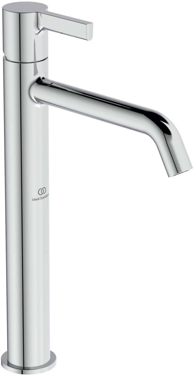 JOY Однорукоятковый смеситель для раковины Vessel, керамический картридж 28 мм, с функцией HWTC (ограничение максимальной температуры горячей воды), без функции CLICK, логотип Ideal Standard на корпусе, металлическая рукоятка без индикаторов горячей / холодной воды, аэратор Caché M16,5x1 с ограничением потока 5 л/мин, система монтажа EASY-FIX (облегченный монтаж), гибкая подводка G3/8" PEX