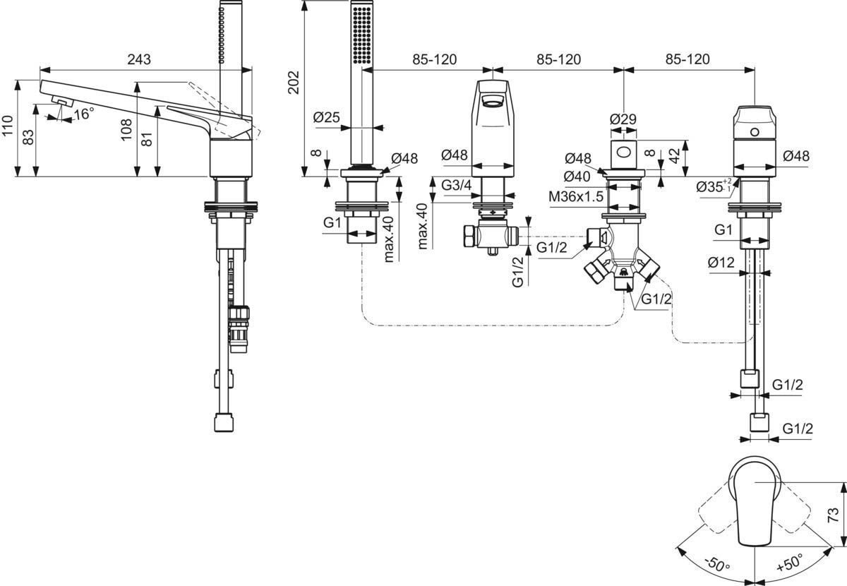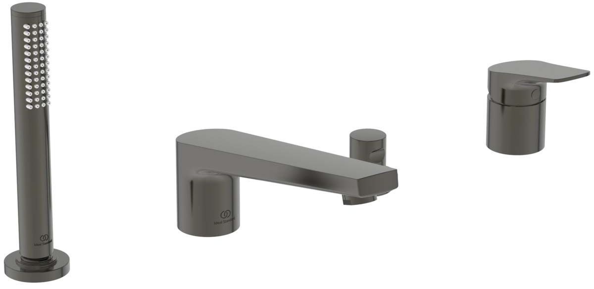 La Dolce Vita Набортный смеситель для ванны/душа под 4 отверстия, керамический картридж FirmaFlow 38 мм, с функцией HWTC (ограничение максимальной температуры горячей воды), без функции CLICK, литой излив, с душевым комплектом (металлический ручной душ Stick, шланг для душа 1750 мм Idealflex), металлическая рукоятка без индикаторов горячей / холодной воды, автоматическое переключение, аэратор M24x1
