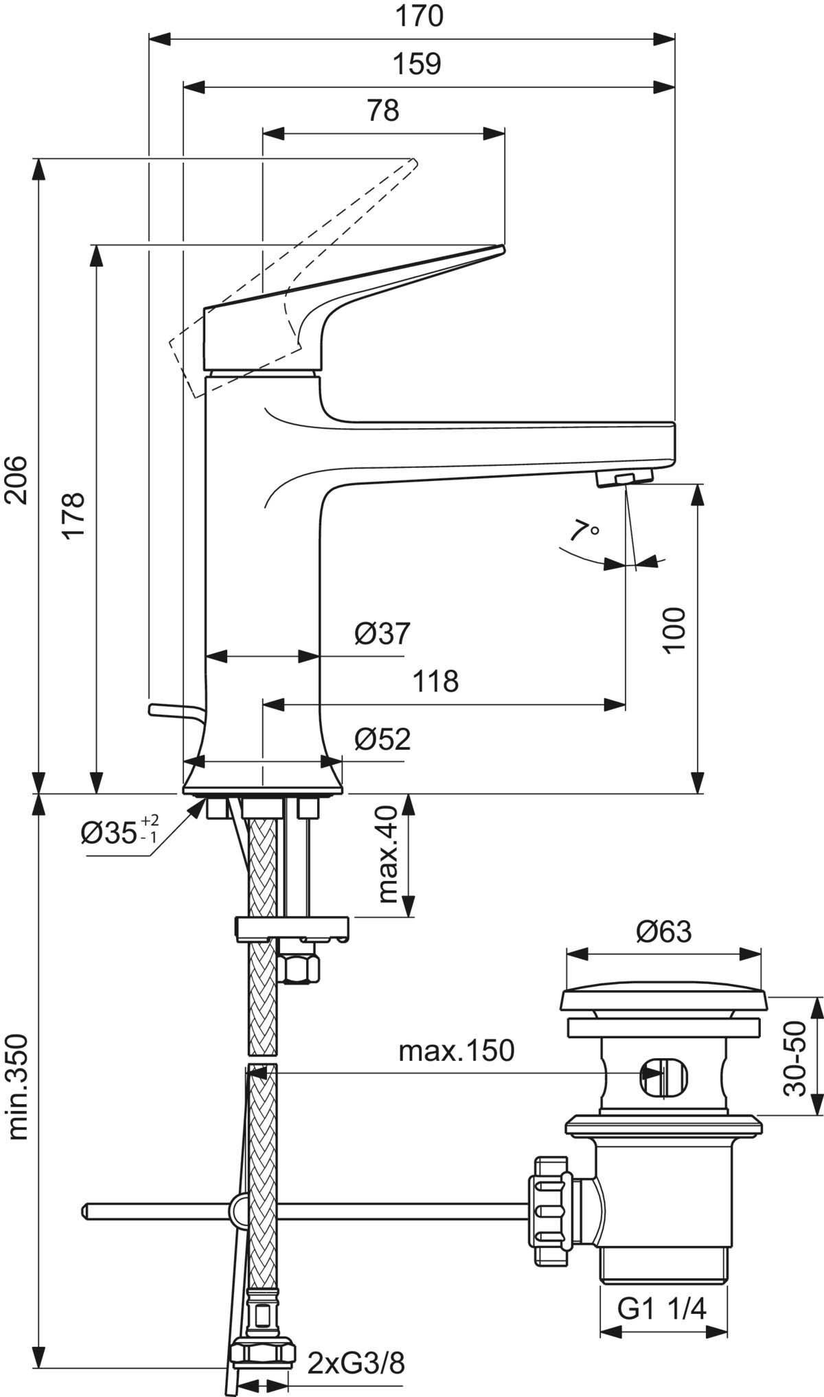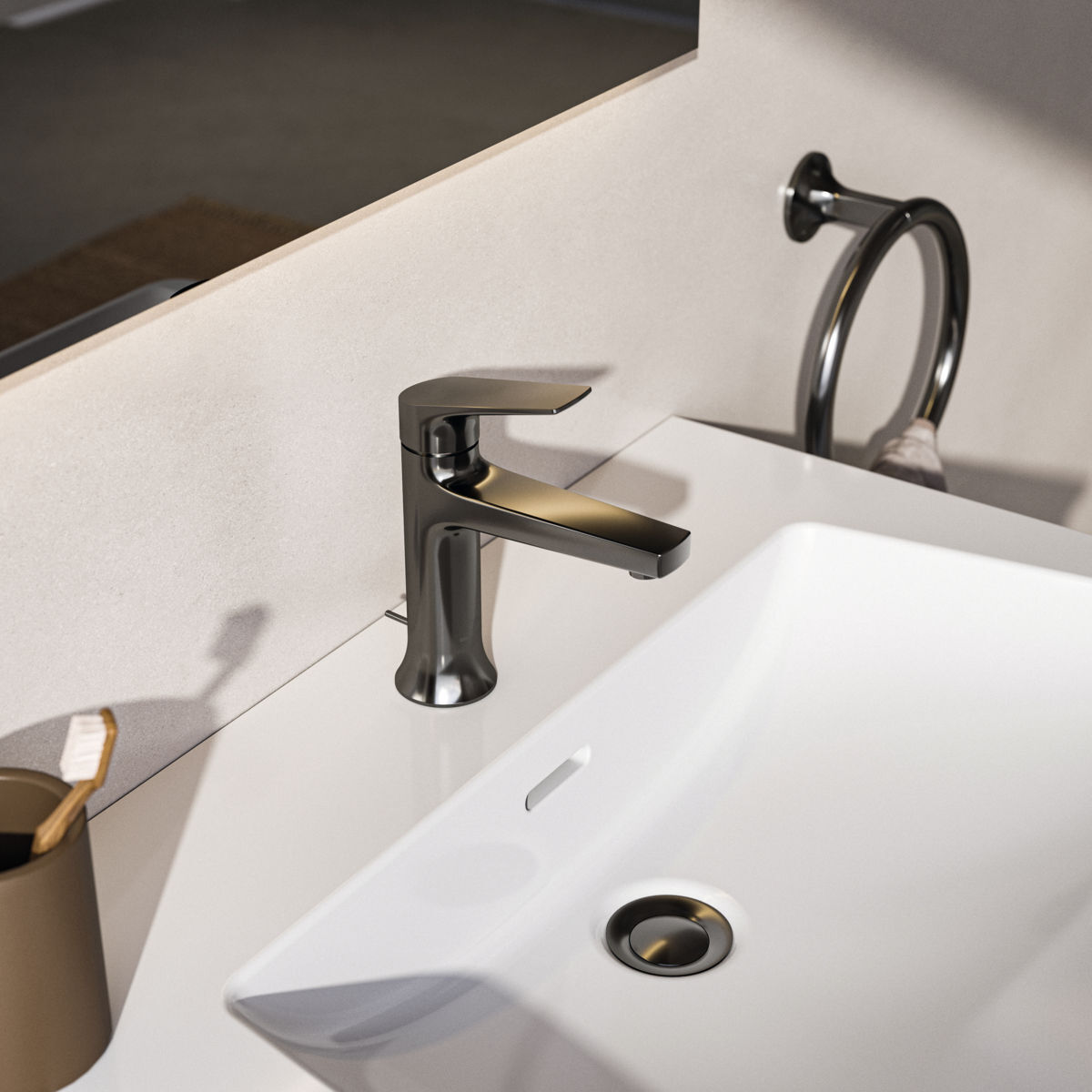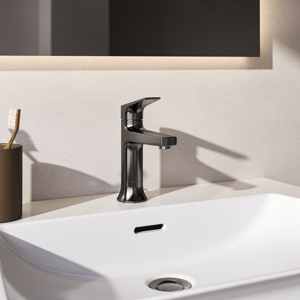 La Dolce Vita Однорукоятковый смеситель для раковины с донным клапаном, керамический картридж FirmaFlow 28 мм, с функцией HWTC (ограничение максимальной температуры горячей воды), логотип Ideal Standard на корпусе, металлическая рукоятка без индикаторов горячей/холодной воды, аэратор M24x1 с ограничением потока 5 л/мин., система монтажа EASY-FIX (облегченный монтаж), гибкая подводка G3/8" PEX, металлический донный клапан