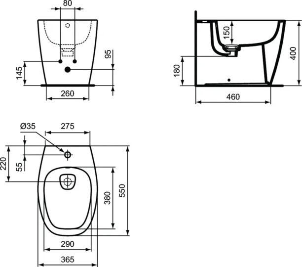 DEA Напольное пристенное биде, с 1-м отверстием под смеситель, с крепежом TT0257919, с керамической накладкой слива T852501