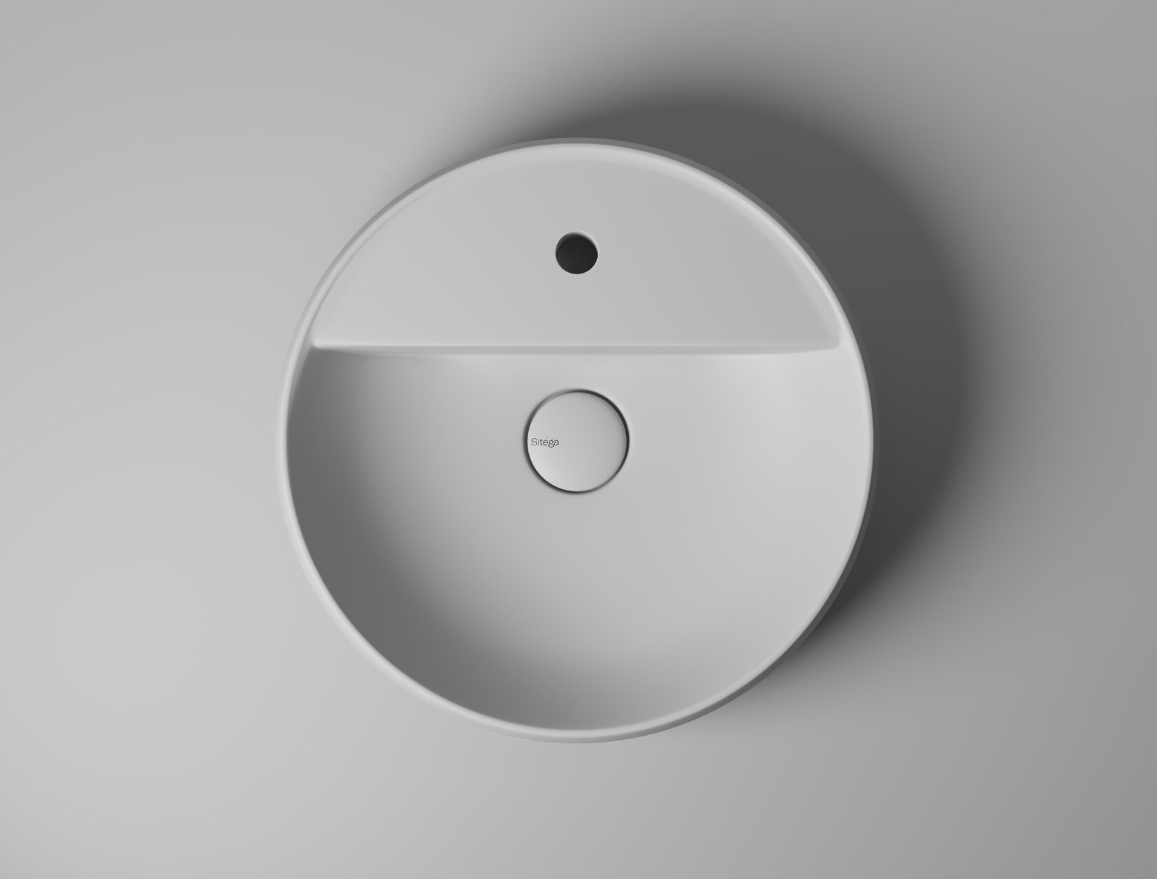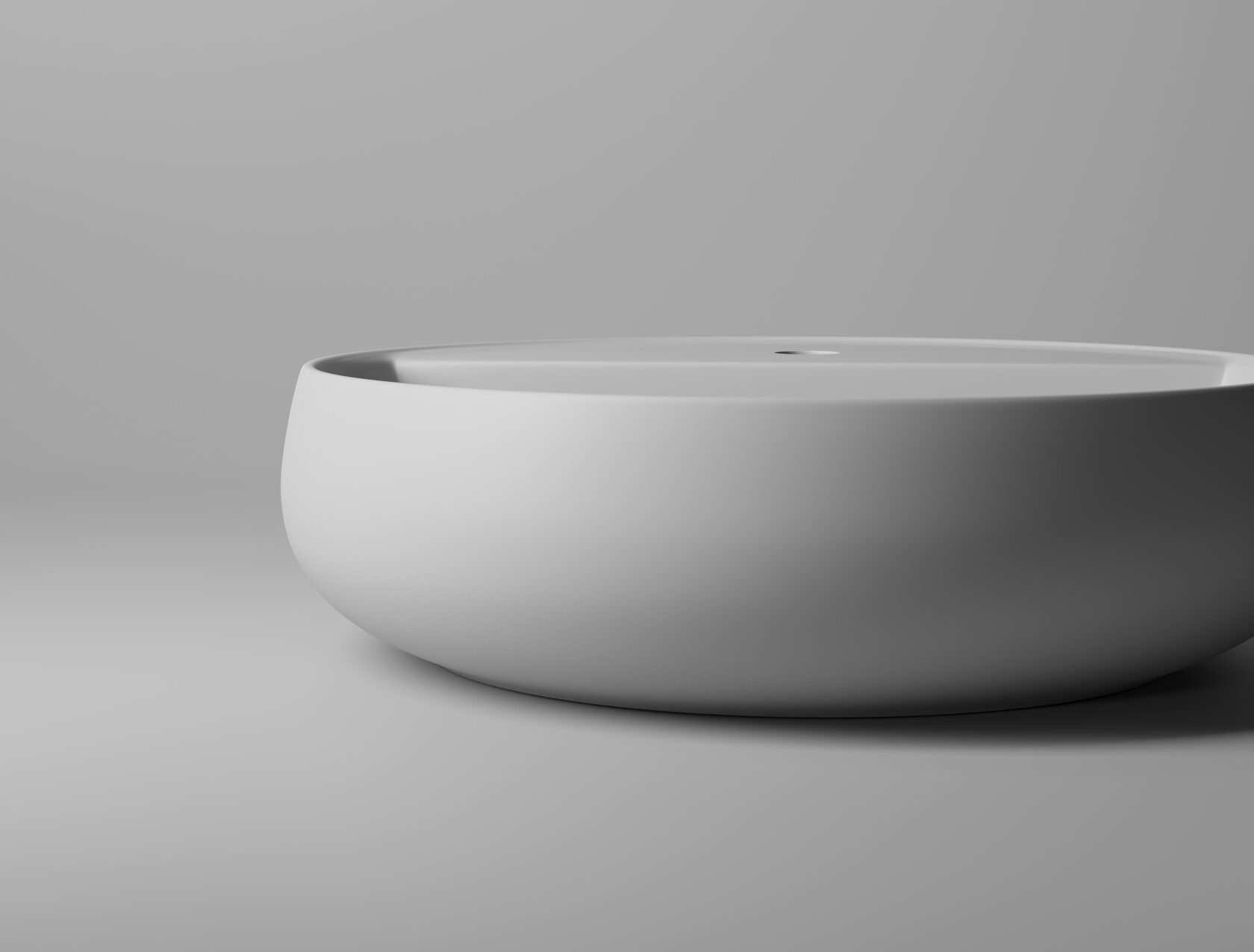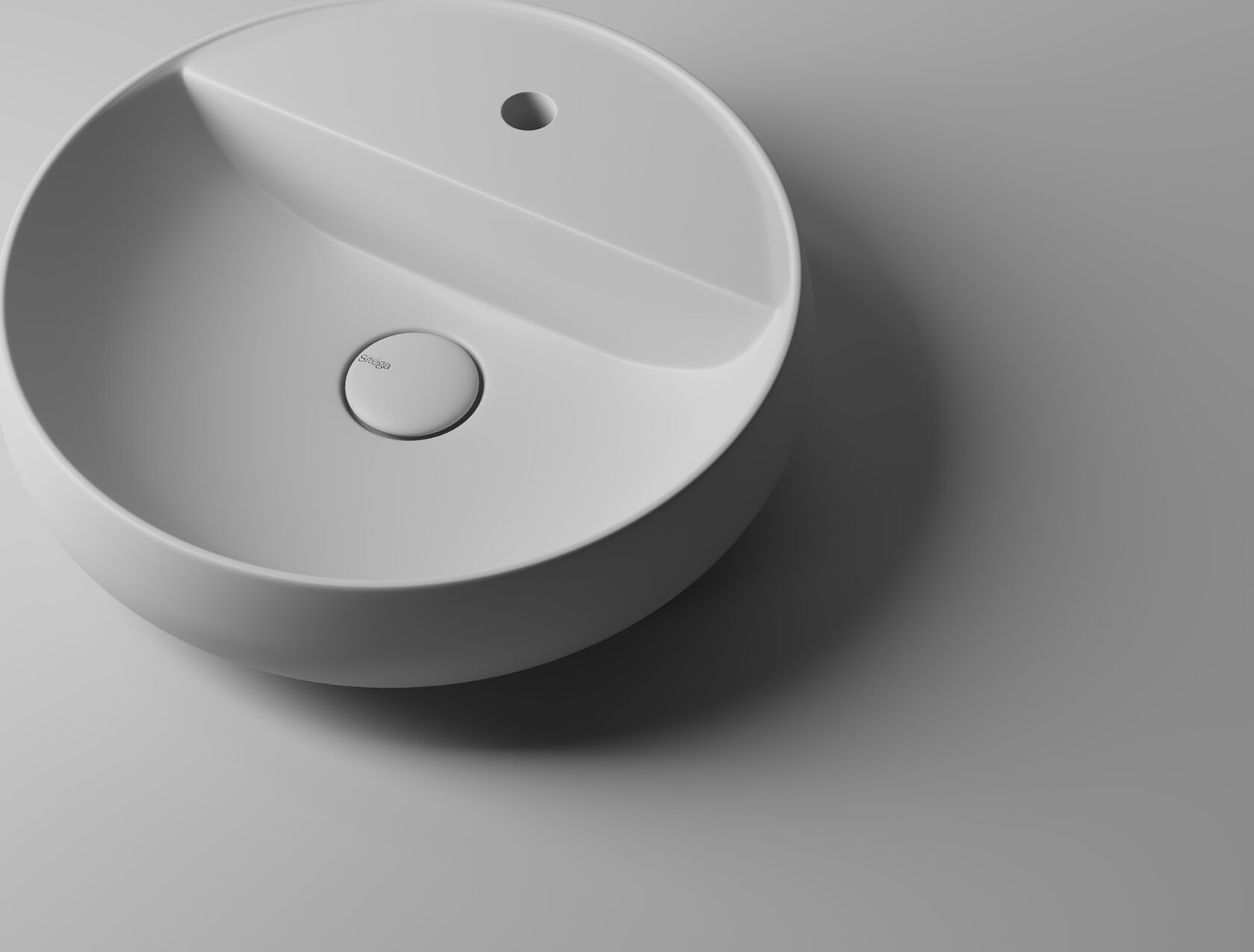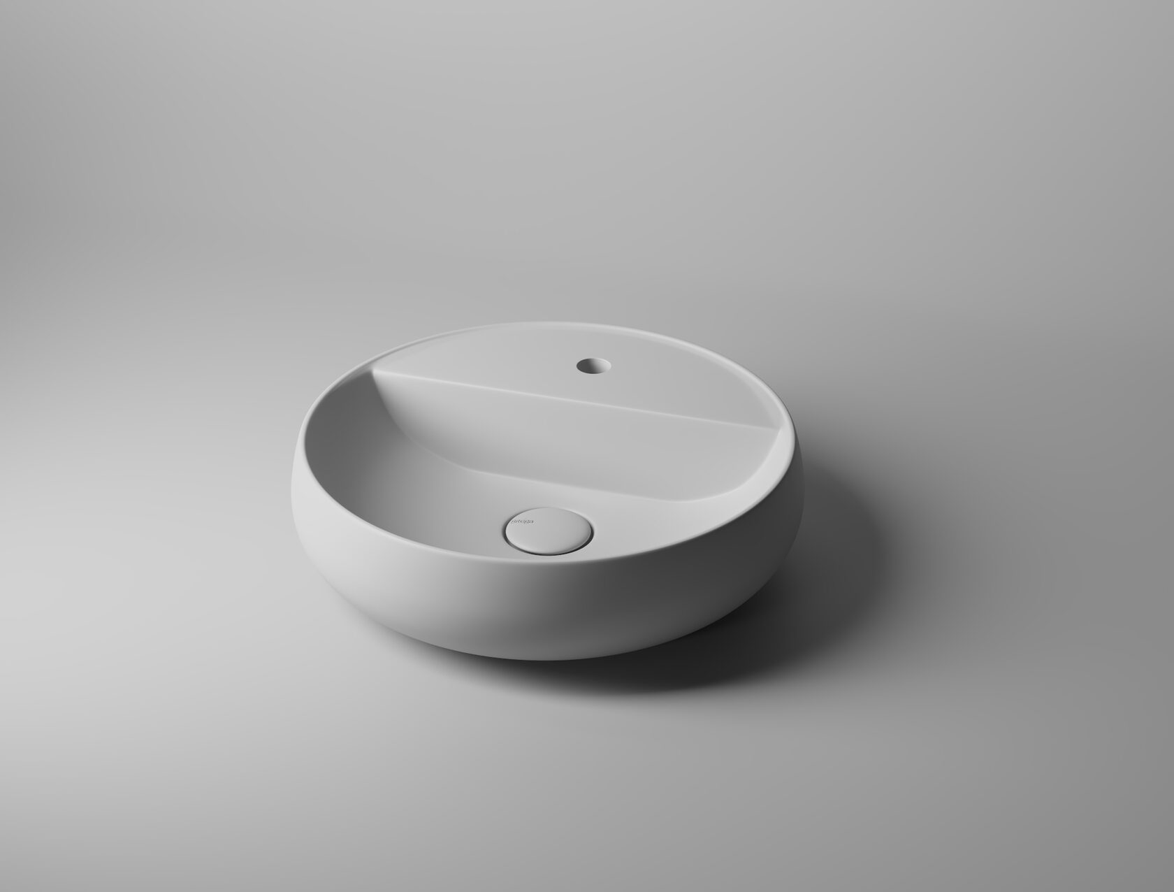 OSNO 43K — круглая настольная раковина обладает утонченной элегантностью, дополненной функциональной полкой для смесителя. Для тех, кто ценит красоту в сочетании с удобством.