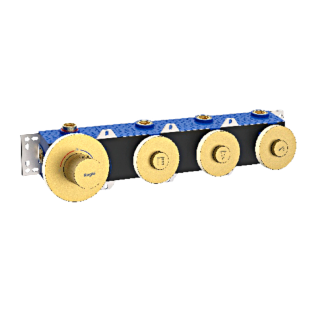 Корпус смесителя + внутренняя часть Raglo R20.263.03, 3-режима, золотой сатин (брашированное золото). Встраиваемый монтаж. Термостатический картридж. Управление вентильное + кнопочное.