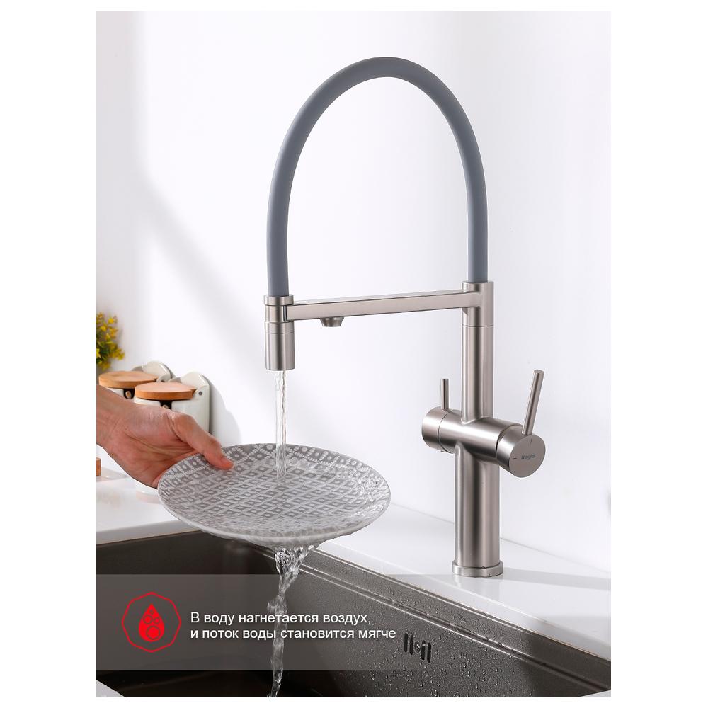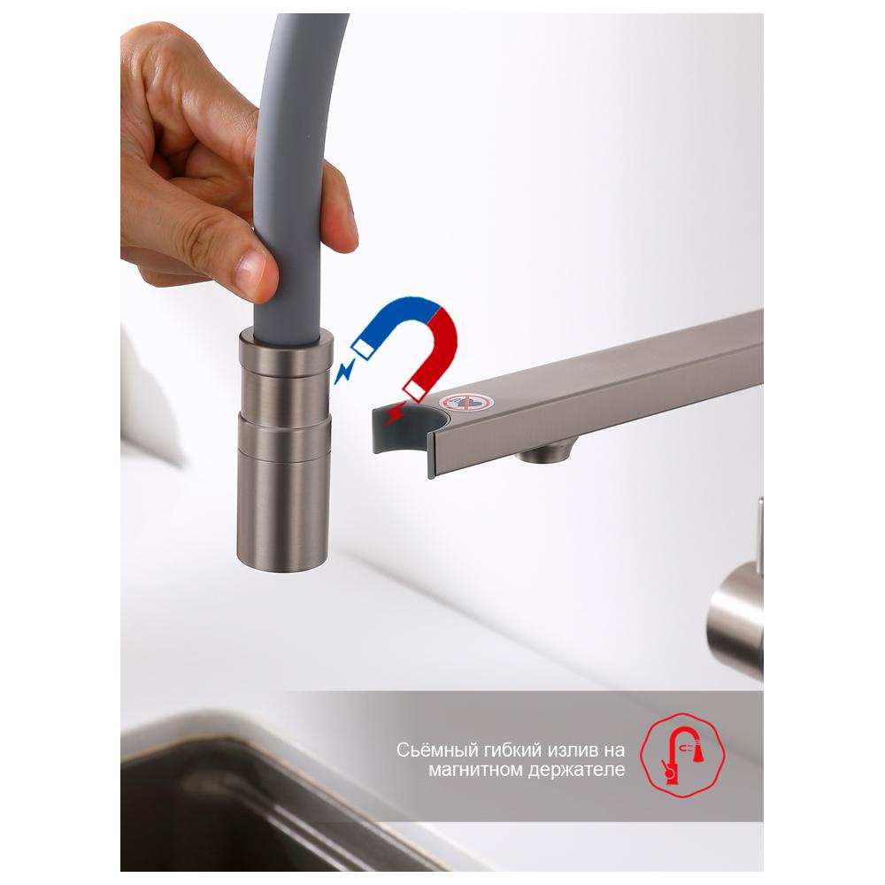 Смеситель Raglo для кухни со съемным гибким изливом, с магнитным фиксатором излива, с подключением фильтра питьевой воды. Крепление на гайке. Смеситель для кухонной мойки Raglo - идеальное решение для вашей кухни! Изготовленный из нержавеющей стали, он гарантирует долговечность и стабильность на многие годы. Гибкий поворотный силиконовый излив обеспечивает максимальный комфорт при использовании, позволяя легко настроить струю воды под ваши нужды. Гибкий излив позволяет удобно мыть посуду и наполнять большие кастрюли и чайники. Также с гибкий излив очень удобен при ополаскивании кухонной мойки. Одним из ключевых преимуществ смесителя Shevanik является возможность подключения фильтра для воды. Теперь у вас всегда будет доступ к чистой и свежей воде прямо из вашей мойки. Отдельный рычаг для подачи чистой воды от фильтра: подключается через отдельный шланг к системе фильтрации водопроводной воды, например марки Гейзер, Барьер и другие. Фильтр приобретается отдельно. Дополнительный излив служит не только для подачи фильтрованной воды, но и как держатель для гибкого излива, когда тот не используется, что добавляет удобства в повседневном использовании. Керамический картридж и рычажное управление обеспечивают плавное и точное регулирование температуры воды, а также экономию водных ресурсов. Стильный и функциональный дизайн гармонично впишется в интерьер любой кухни, создавая удобство и комфорт при использовании смесителя. Не откладывайте покупку кухонного смесителя Raglo - сделайте свою кухню еще более удобной и современной уже сегодня!