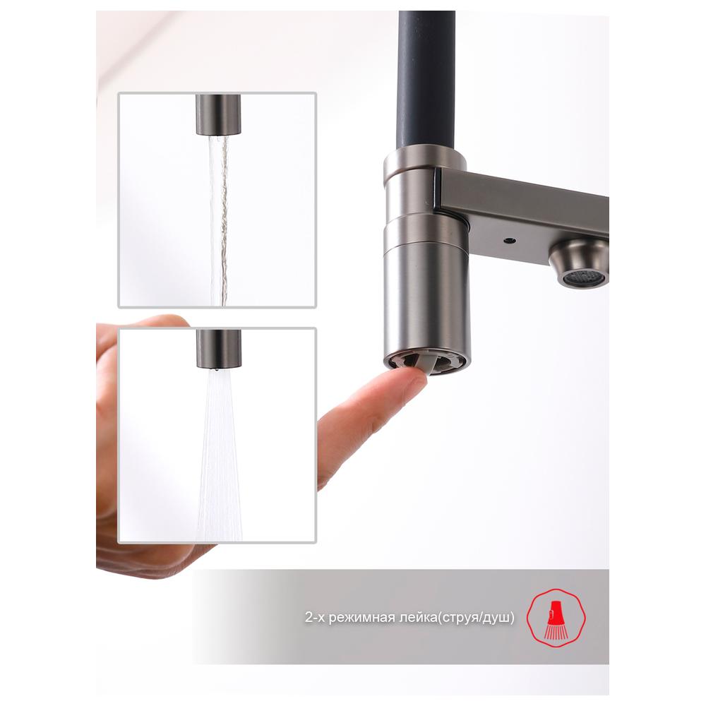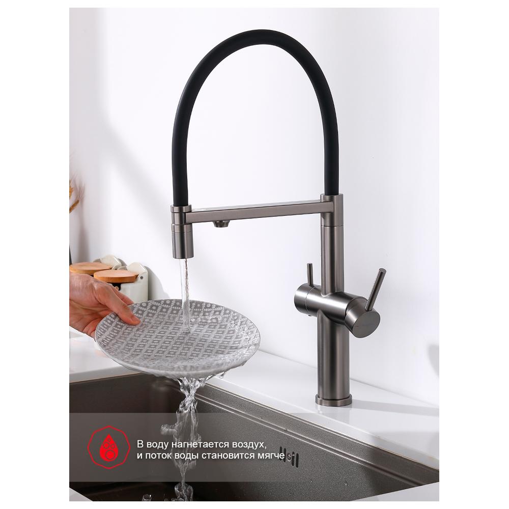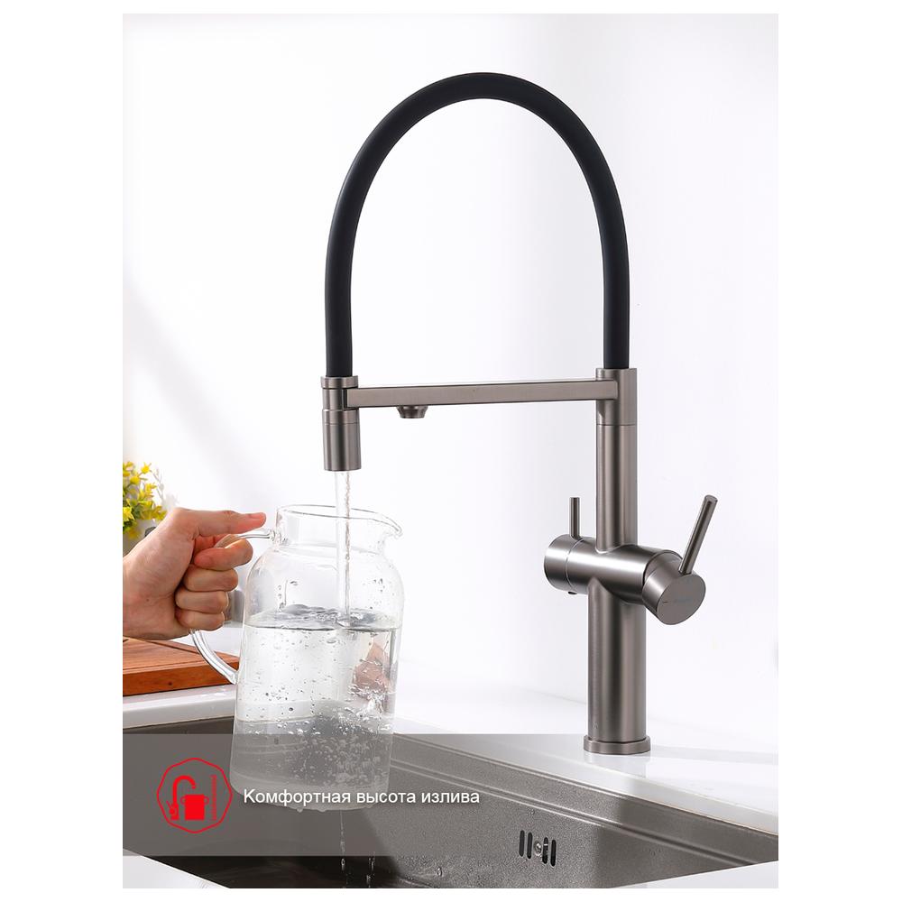 Дополнительный излив служит не только для подачи фильтрованной воды, но и как держатель для гибкого излива, когда тот не используется, что добавляет удобства в повседневном использовании.