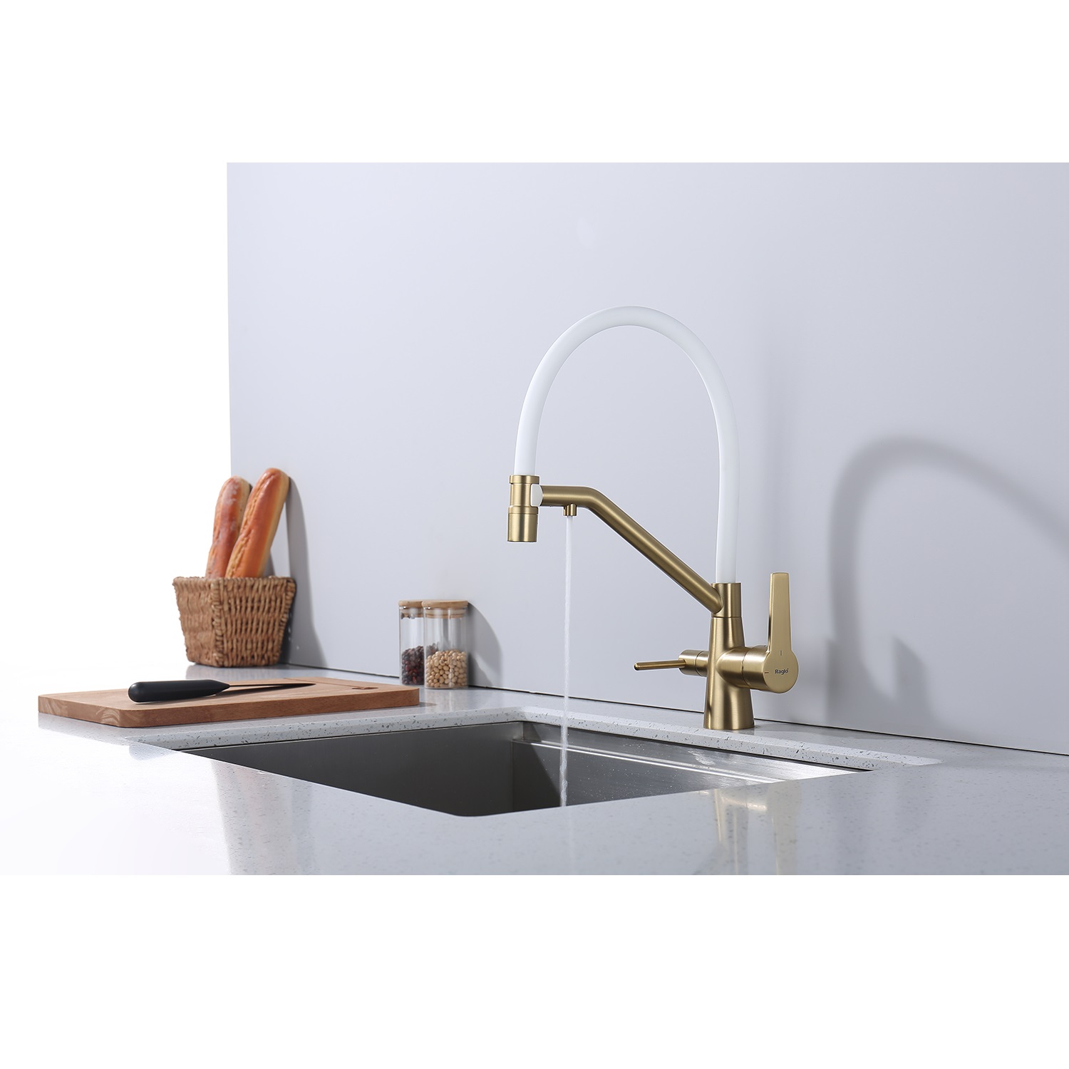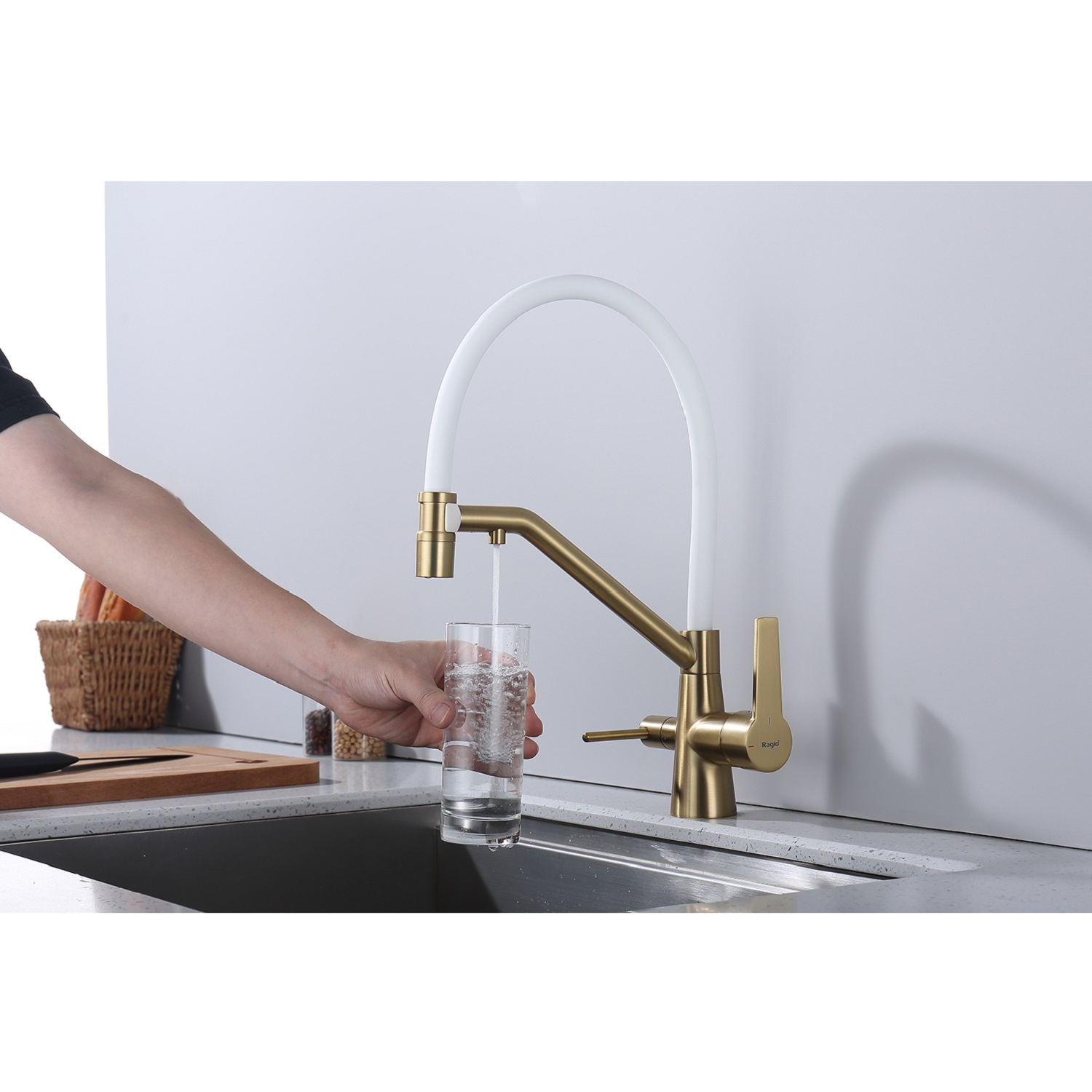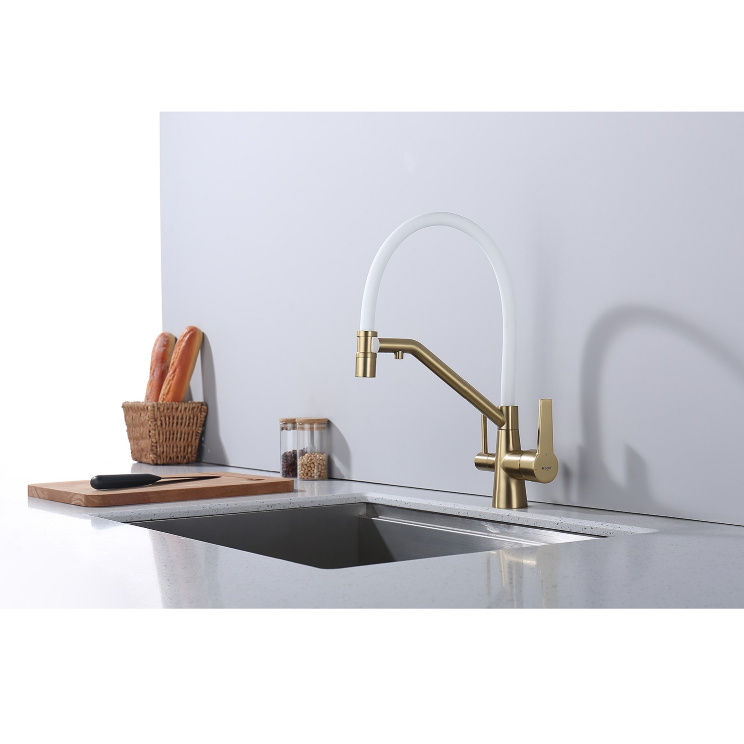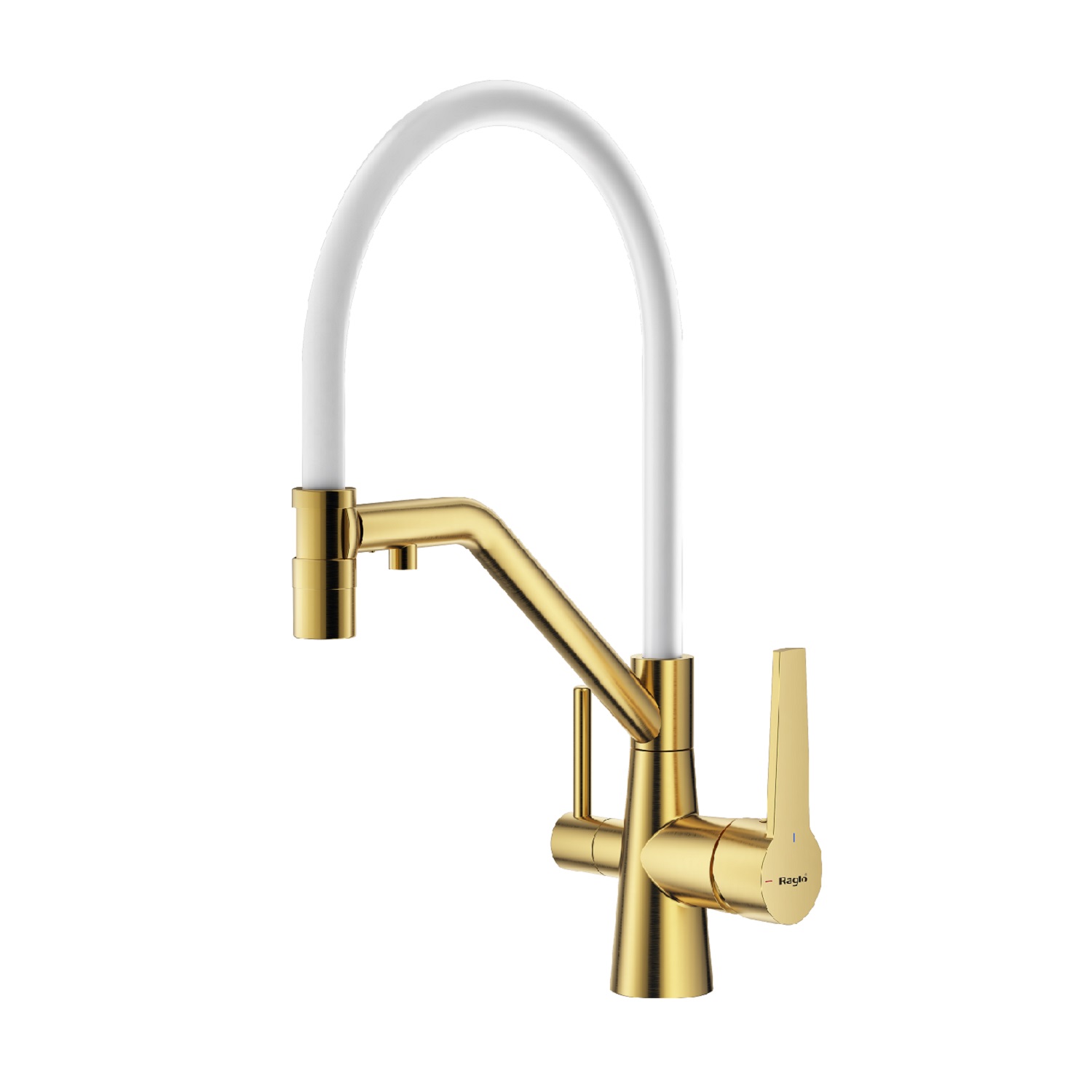 Raglo R80.62.03. Цвет: сатин золотой. Смеситель для кухни со съемным изливом на магните и подключением фильтра питьевой воды. Гибкий съемный шланг значительно расширяет зону использования смесителя, благодаря этому можно мыть объемную посуду. Модель предназначена для одновременного подключения к водопроводу и фильтру и позволяет снабжать как обычной, так и питьевой водой.