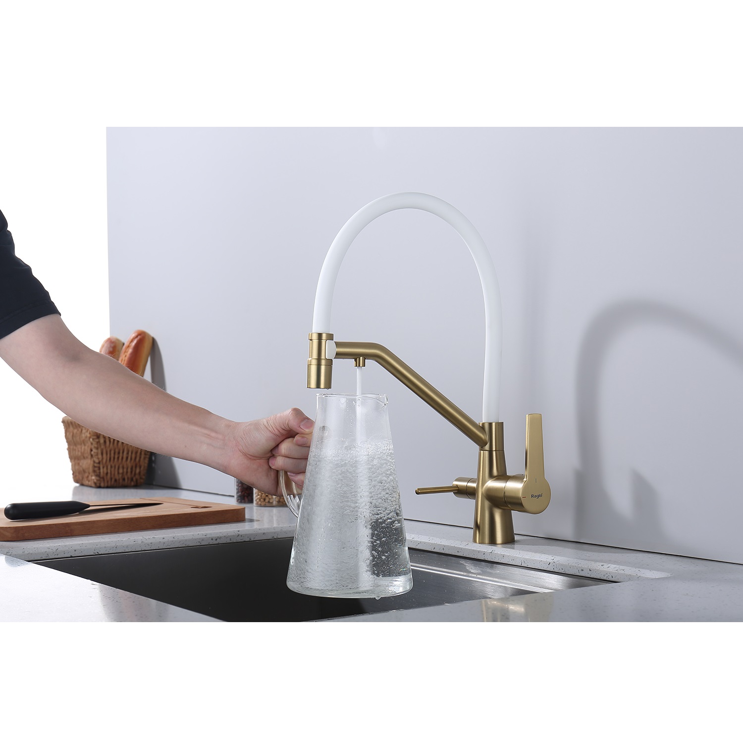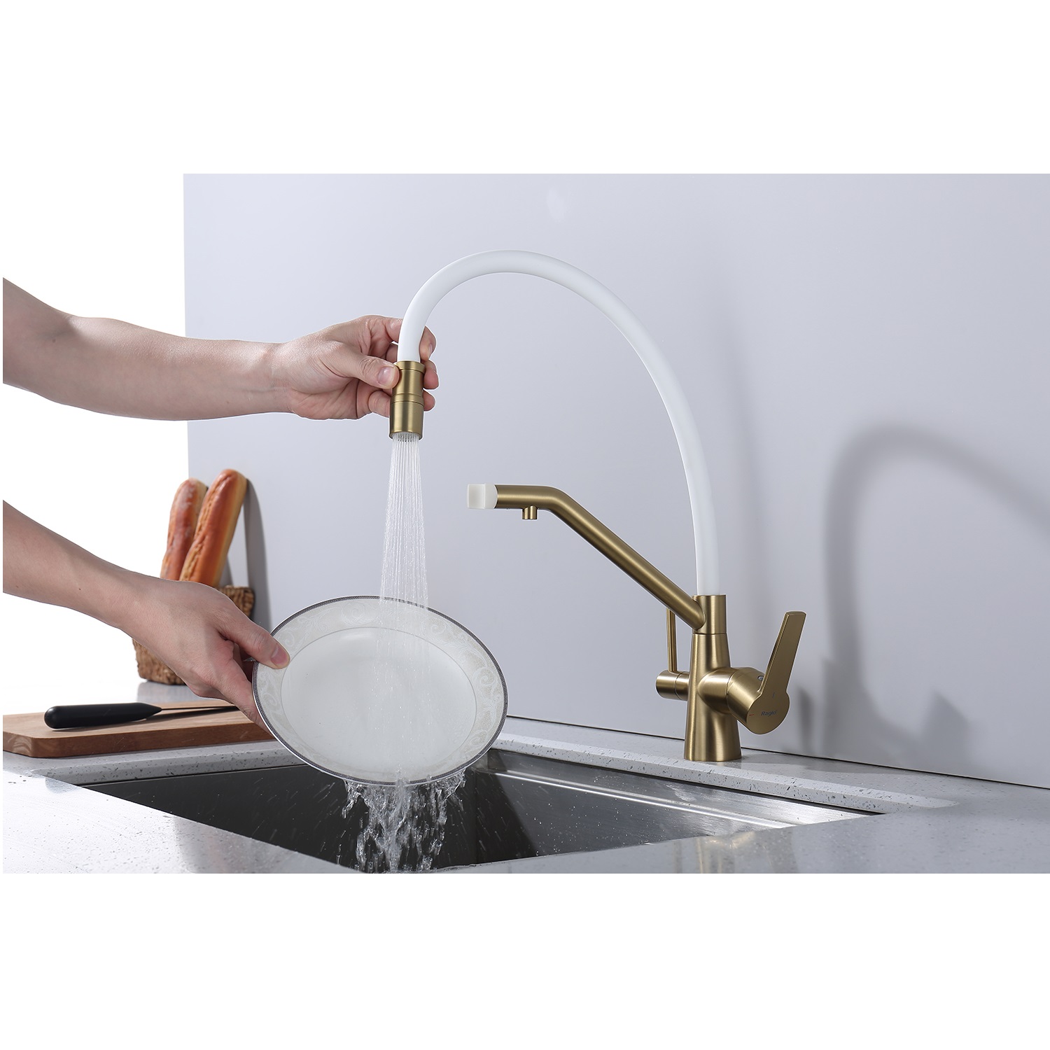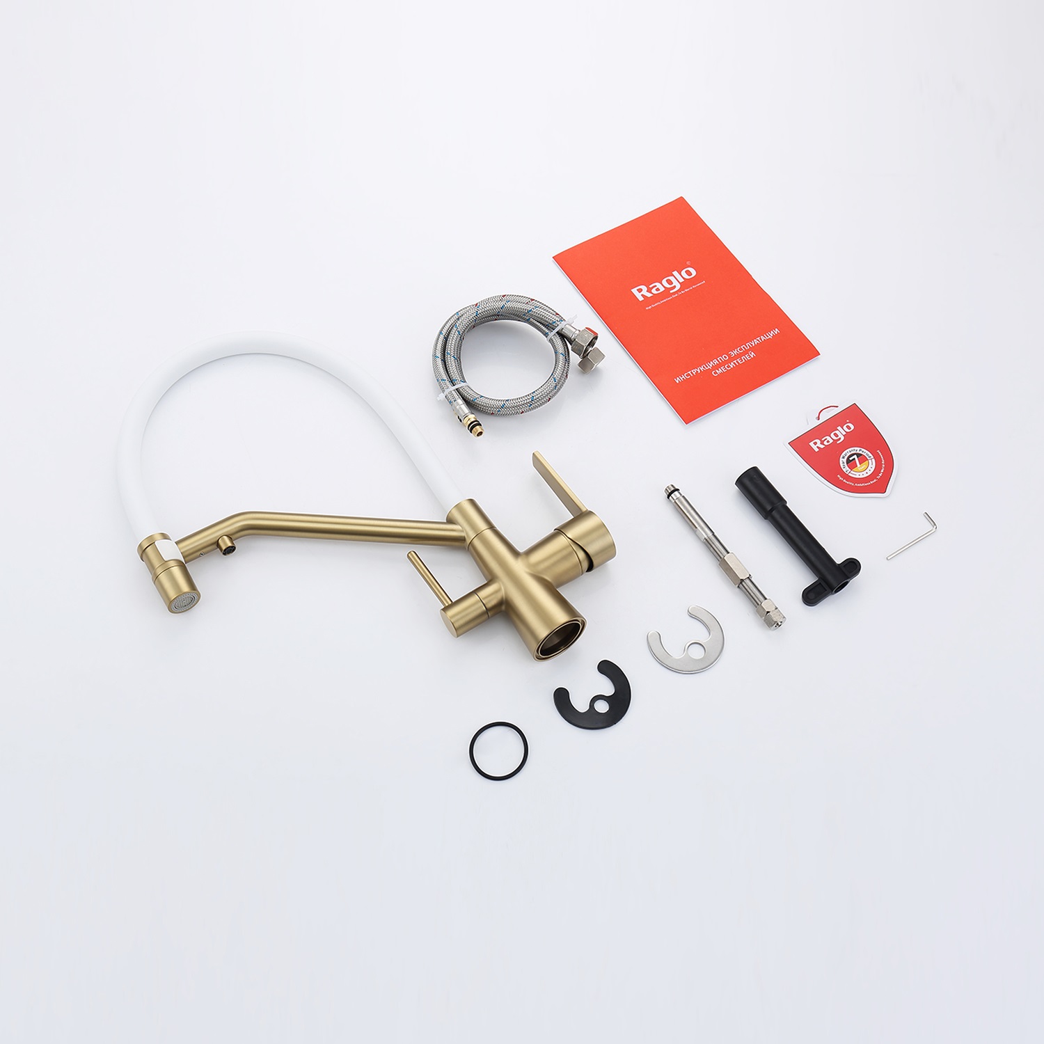 Raglo R80.62.03. Цвет: сатин золотой. Смеситель для кухни со съемным изливом на магните и подключением фильтра питьевой воды. Гибкий съемный шланг значительно расширяет зону использования смесителя, благодаря этому можно мыть объемную посуду. Модель предназначена для одновременного подключения к водопроводу и фильтру и позволяет снабжать как обычной, так и питьевой водой.