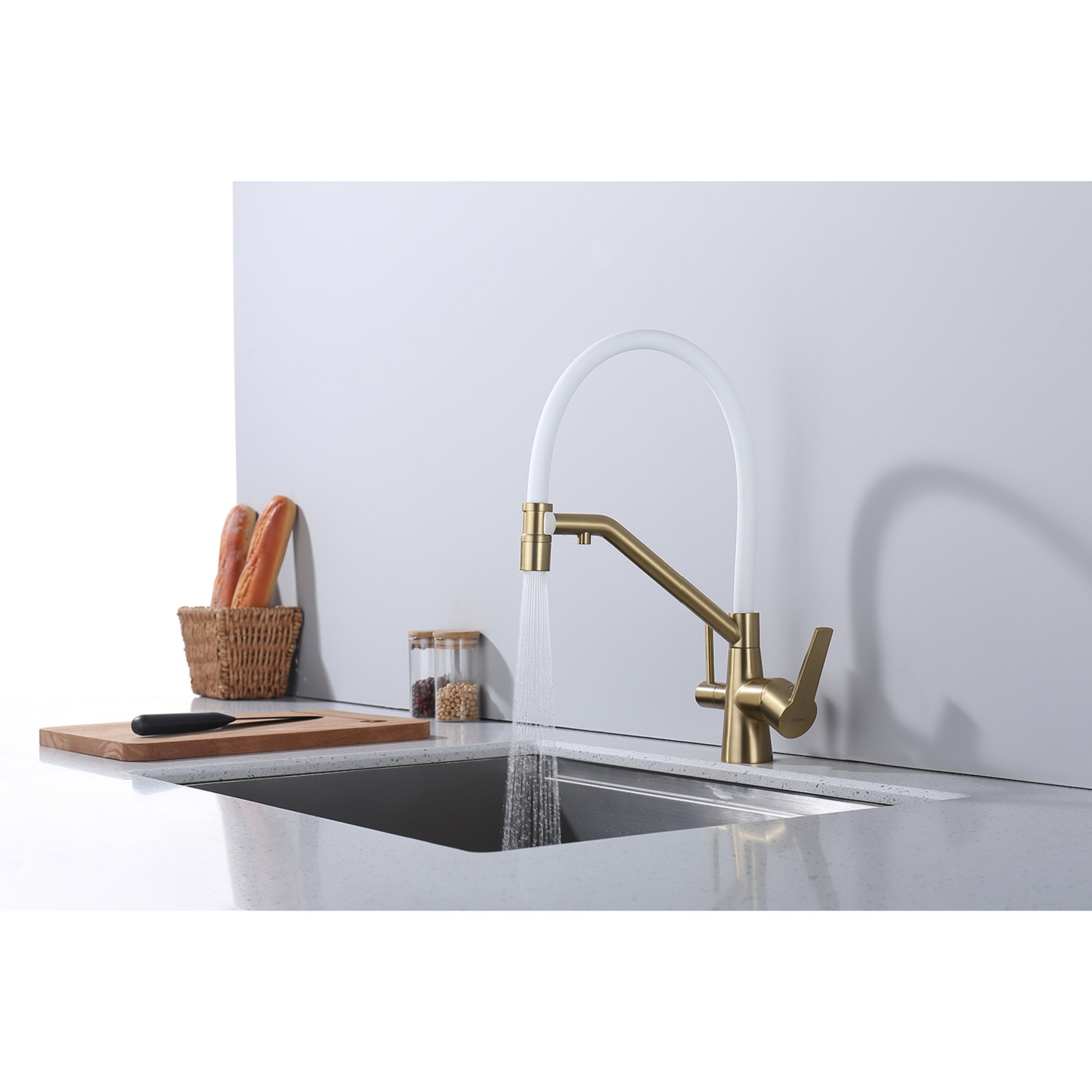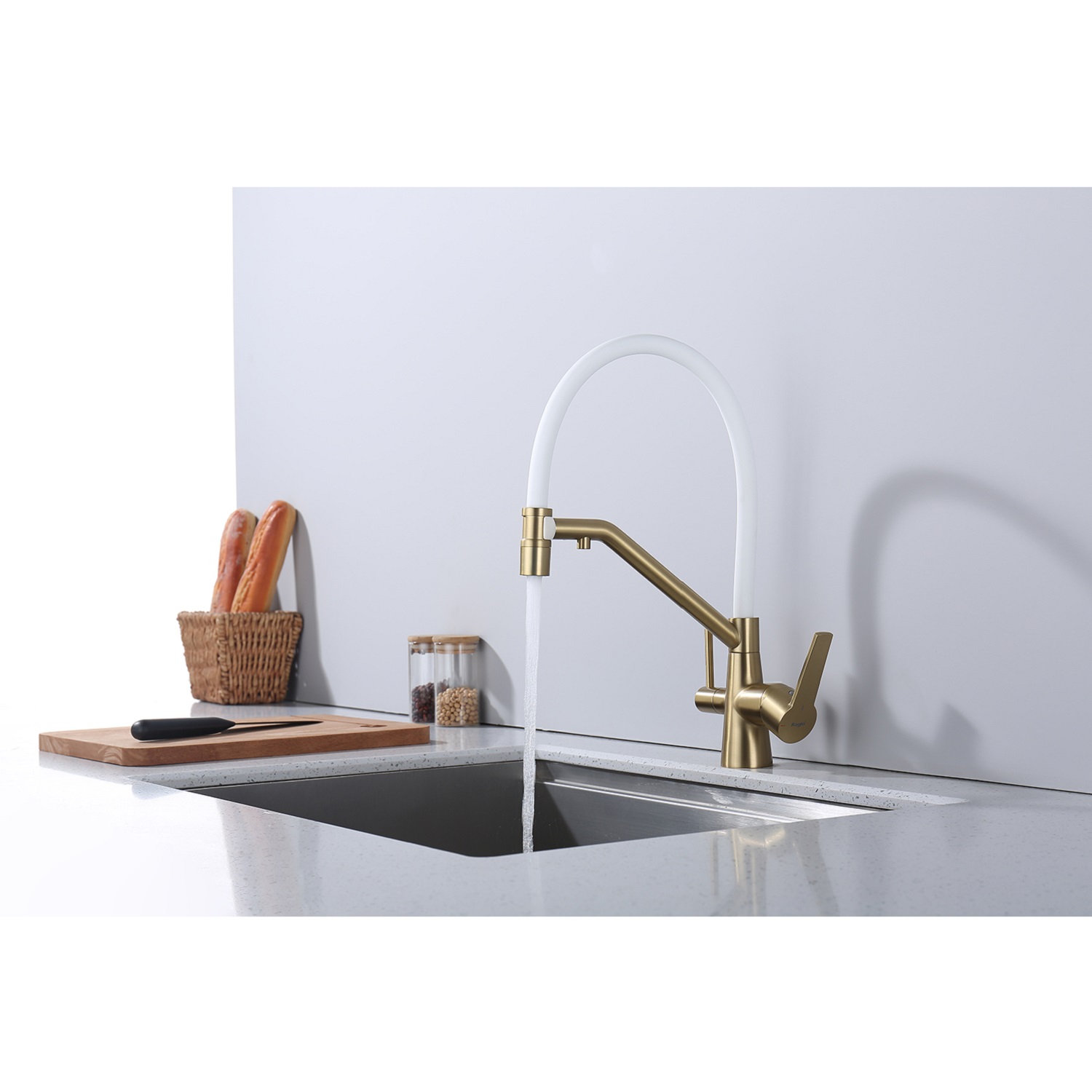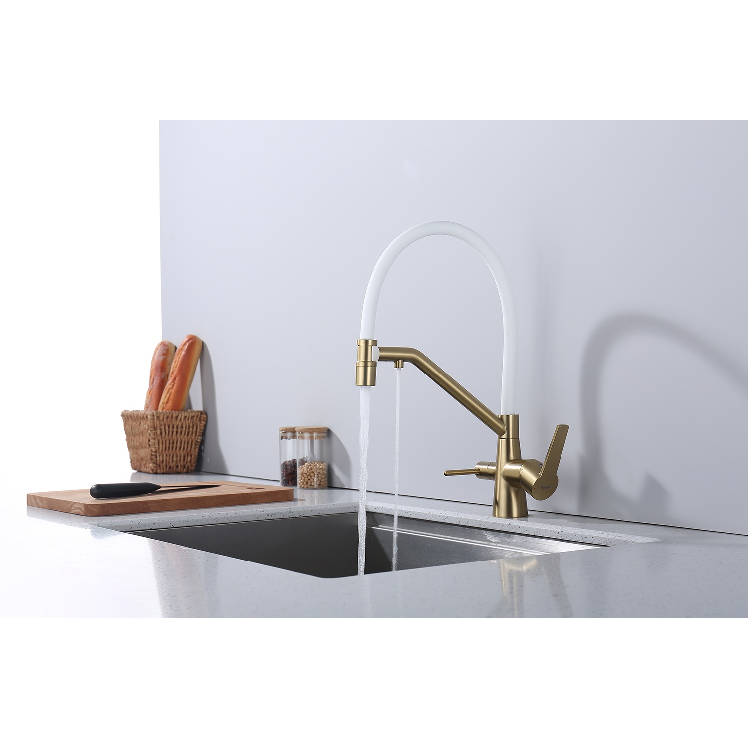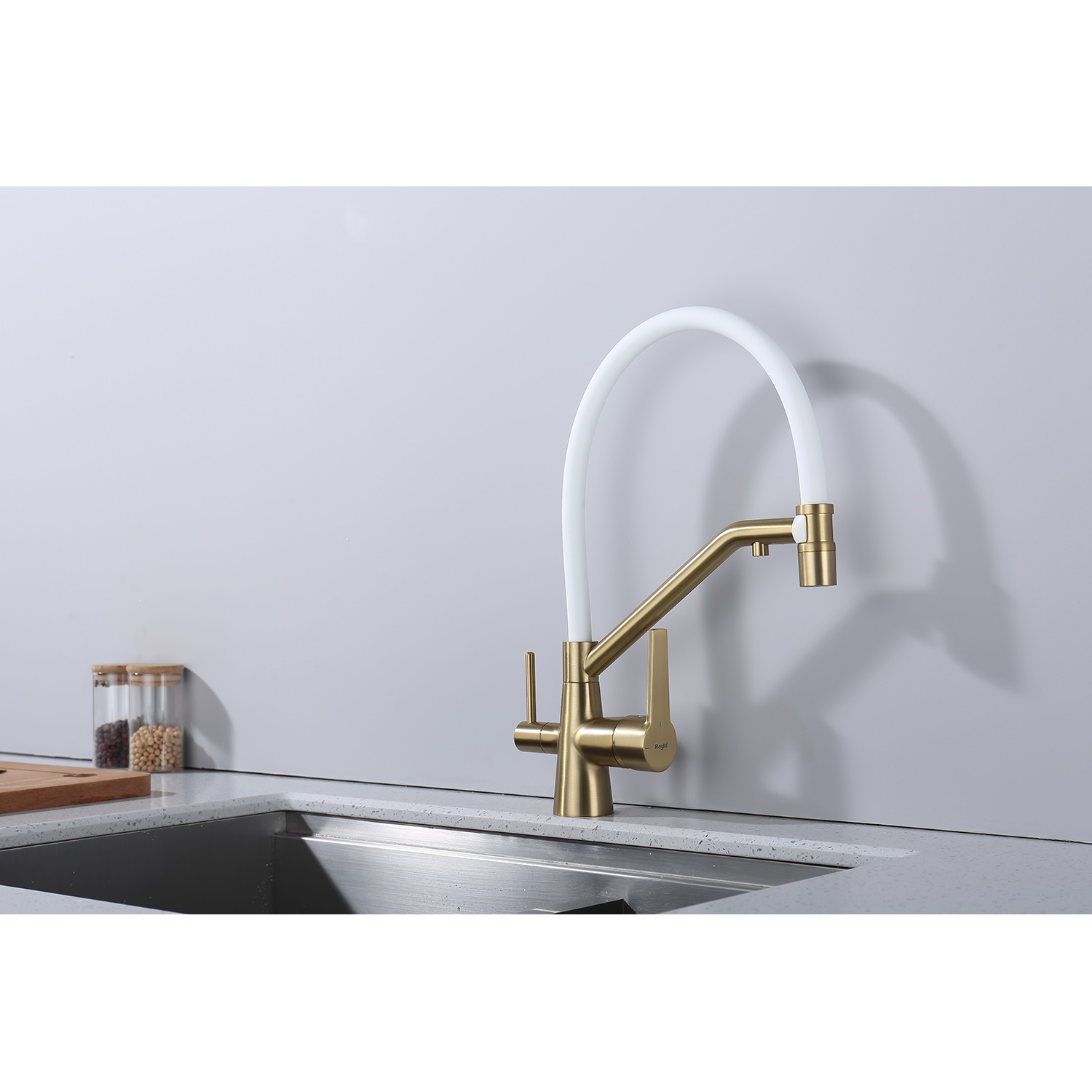 Raglo R80.62.03. Цвет: сатин золотой. Смеситель для кухни со съемным изливом на магните и подключением фильтра питьевой воды. Гибкий съемный шланг значительно расширяет зону использования смесителя, благодаря этому можно мыть объемную посуду. Модель предназначена для одновременного подключения к водопроводу и фильтру и позволяет снабжать как обычной, так и питьевой водой.